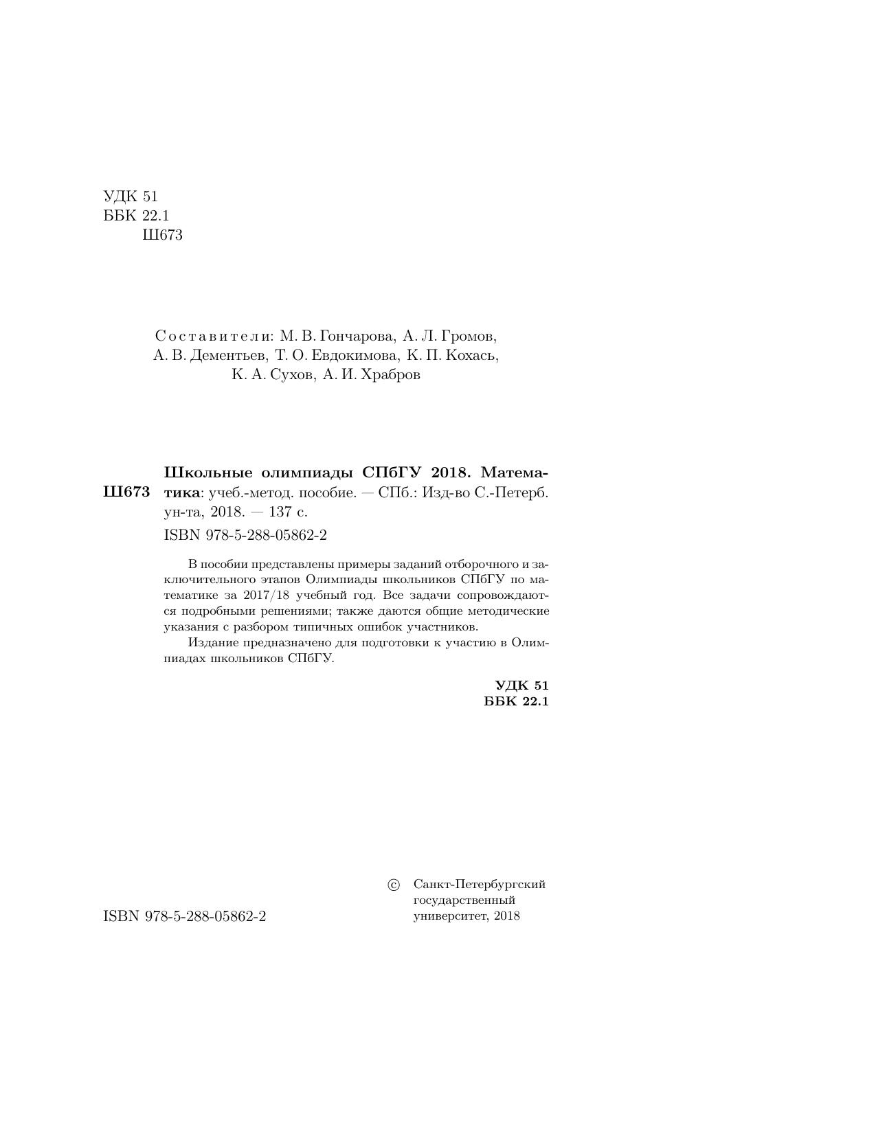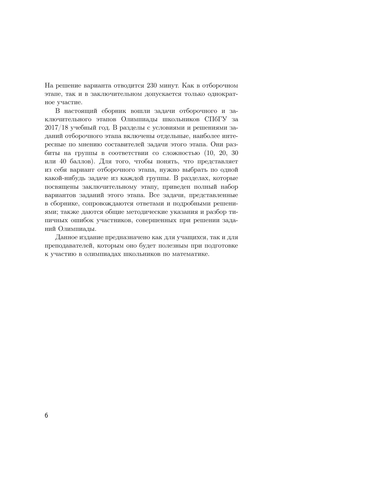 В пособии представлены примеры заданий отборочного и заключительного этапов Олимпиады школьников СПбГУ по математике за 2017/18 учебный год. Все задачи сопровождаются подробными решениями; также даются общие методические указания с разбором типичных ошибок участников. Издание предназначено для подготовки к участию в Олимпиадах школьников СПбГУ.