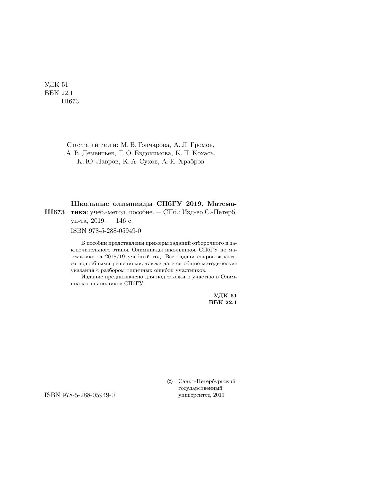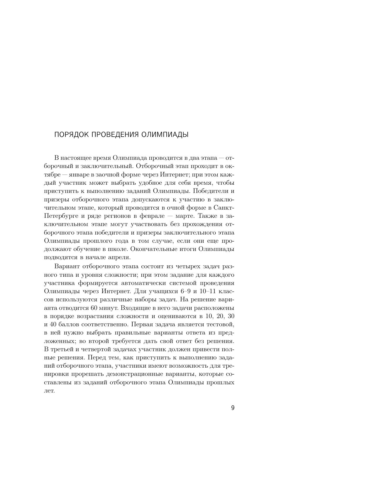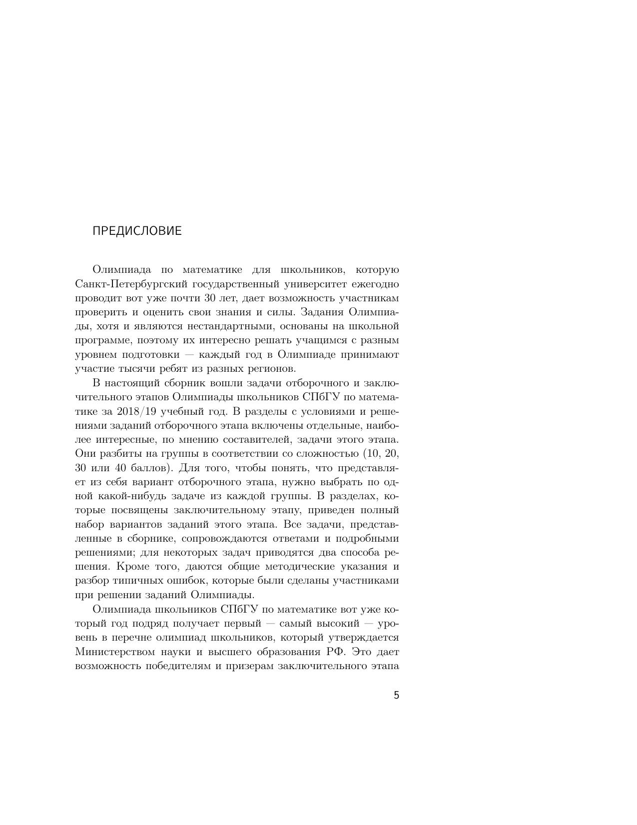 В пособии представлены примеры заданий отборочного и заключительного этапов Олимпиады школьников СПбГУ по математике за 2018/19 учебный год. Все задачи сопровождаются подробными решениями; также даются общие методические указания с разбором типичных ошибок участников.