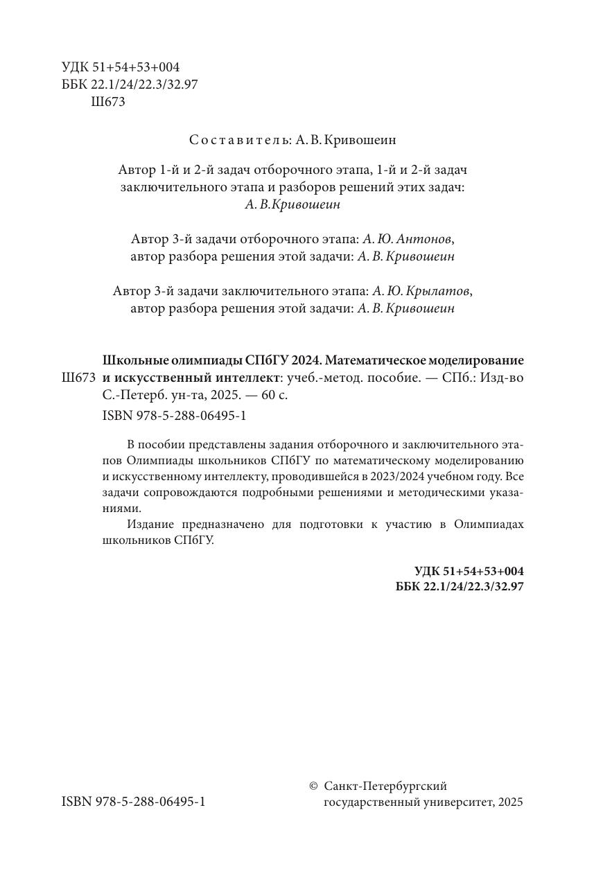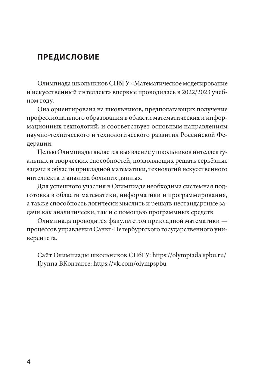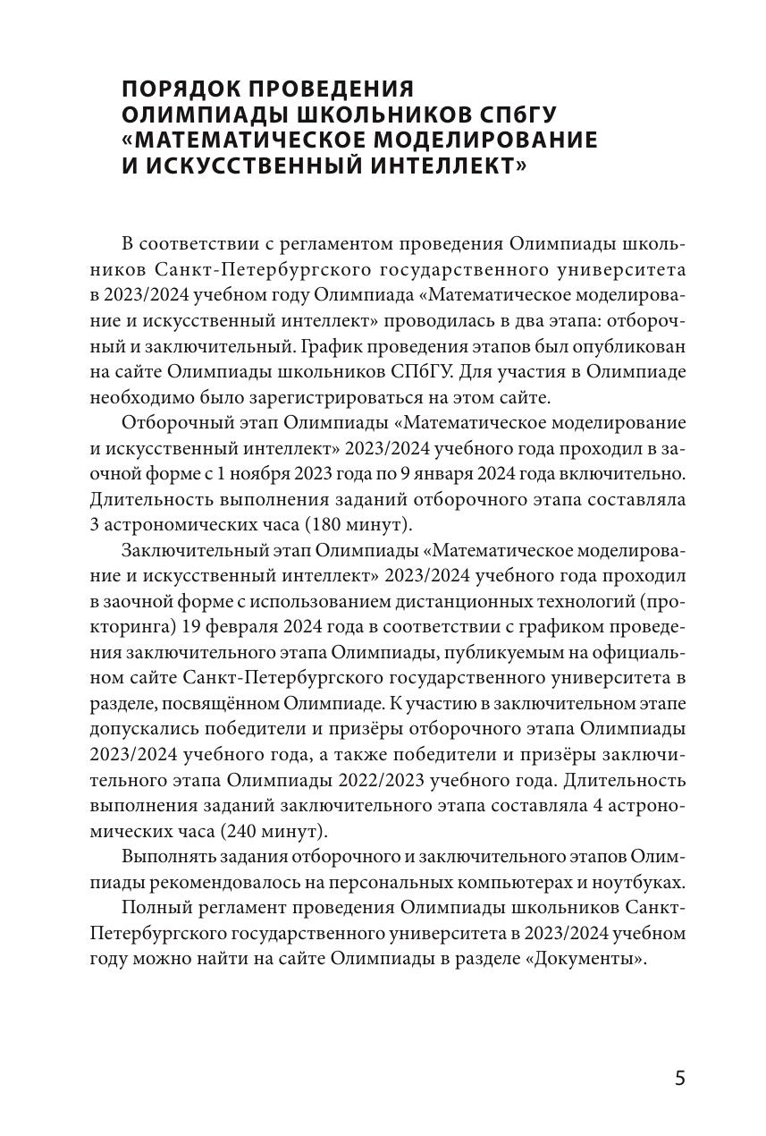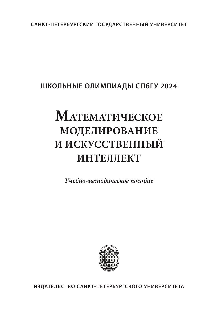 В пособии представлены задания отборочного и заключительного этапов Олимпиады школьников СПбГУ по математическому моделированию и искусственному интеллекту, проводившейся в 2023/2024 учебном году. Все задачи сопровождаются подробными решениями и методическими указаниями. Издание предназначено для подготовки к участию в Олимпиадах школьников СПбГУ.