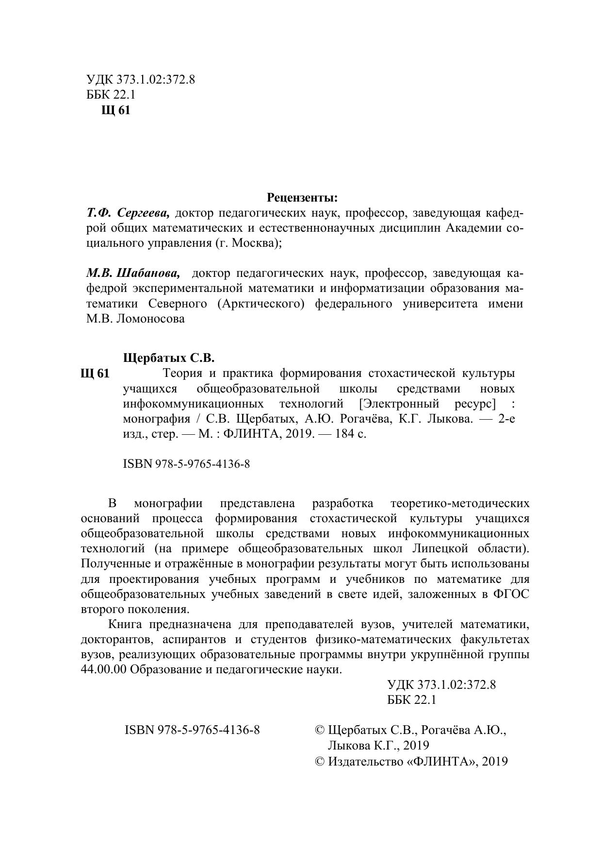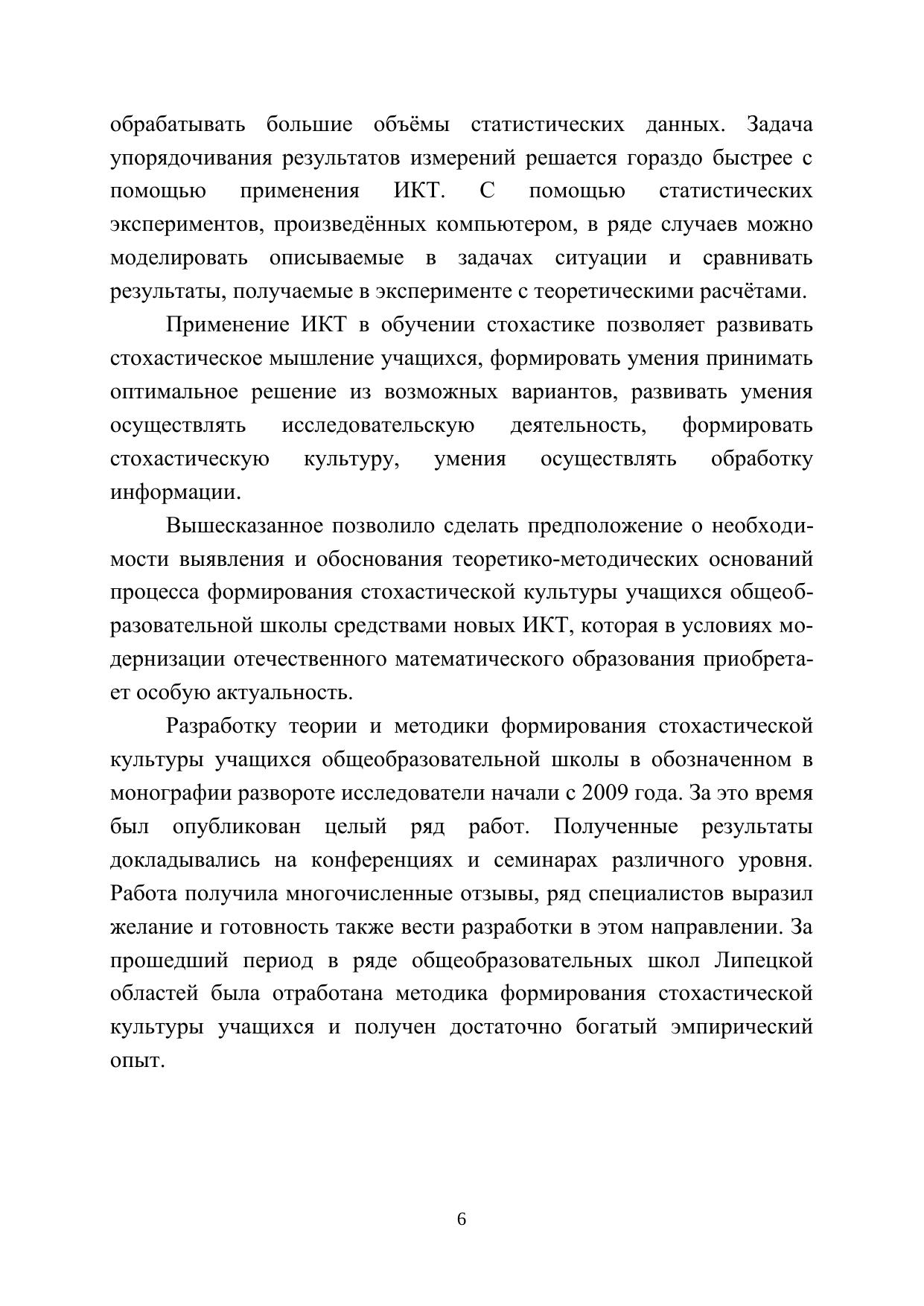 В монографии представлена разработка теоретико-методических оснований процесса формирования стохастической культуры учащихся общеобразовательной школы средствами новых инфокоммуникационных технологий (на примере общеобразовательных школ Липецкой области).