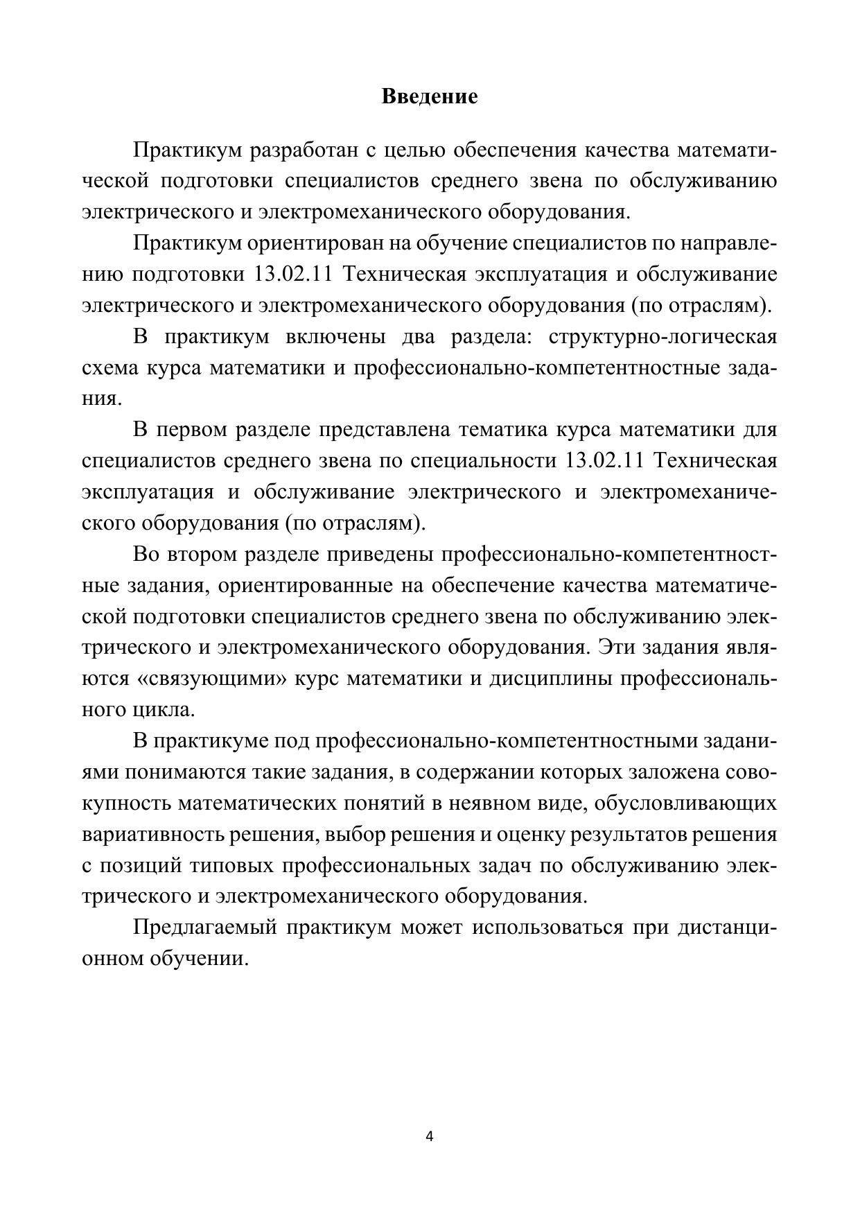 Практикум разработан с целью обеспечения качества математической подготовки специалистов среднего звена по обслуживанию электрического и электромеханического оборудования.