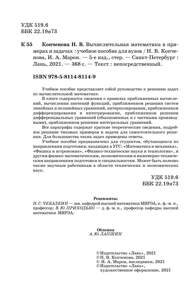 В книге содержатся сведения о правилах приближенных вычислений, вычислении значений функций, приближенном решении систем линейных и нелинейных уравнений, интерполировании, приближенном дифференцировании и интегрировании, приближенном решении дифференциальных уравнений (обыкновенных и с частными производными), приближенном решении интегральных уравнений.