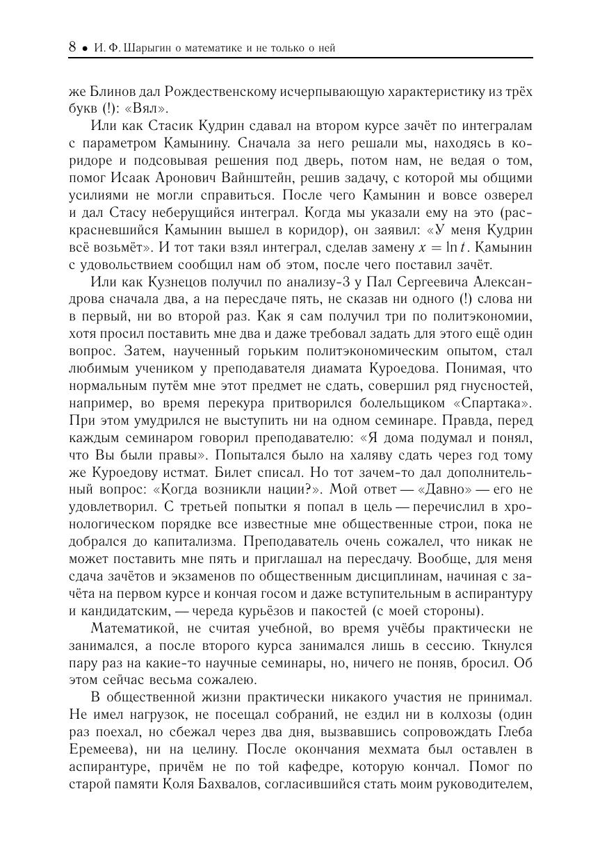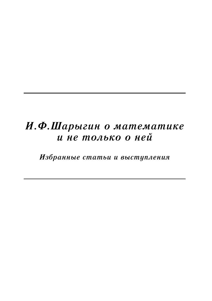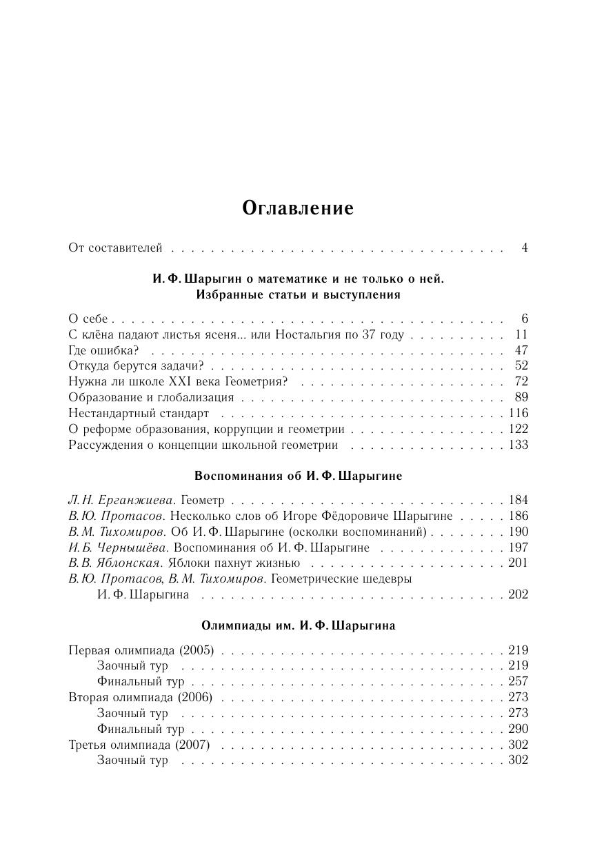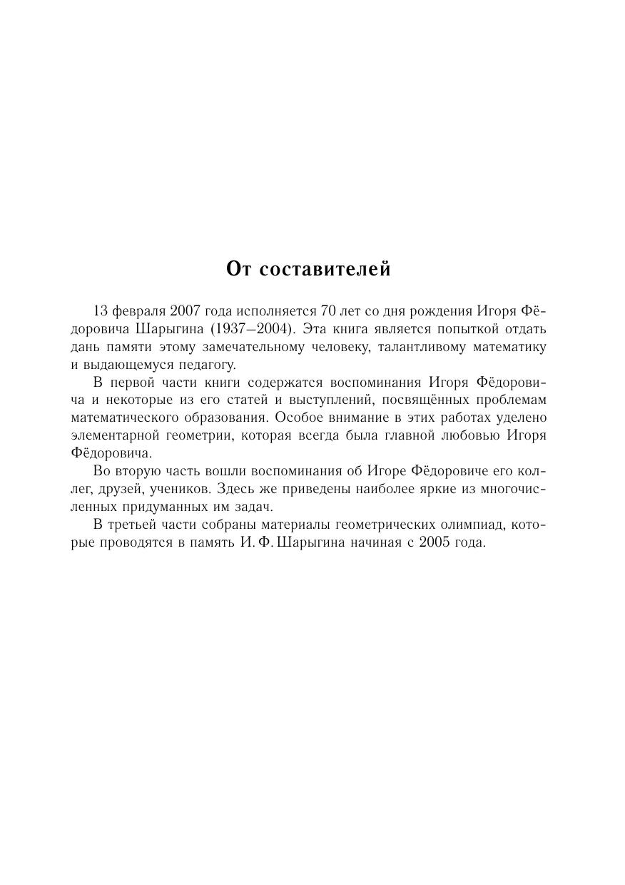 В книге собраны различные материалы, связанные с жизнью и деятельностью выдающегося педагога и учёного, популяризатора науки Игоря Фёдоровича Шарыгина (1937–2004), его статьи и воспоминания о нём.Отдельная часть книги содержит задачи и подробные решения геометрических олимпиад им. И. Ф. Шарыгина, проводимых с 2005 года.Книга предназначена для всех интересующихся вопросами математического образования, школьных учителей и руководителей кружков.