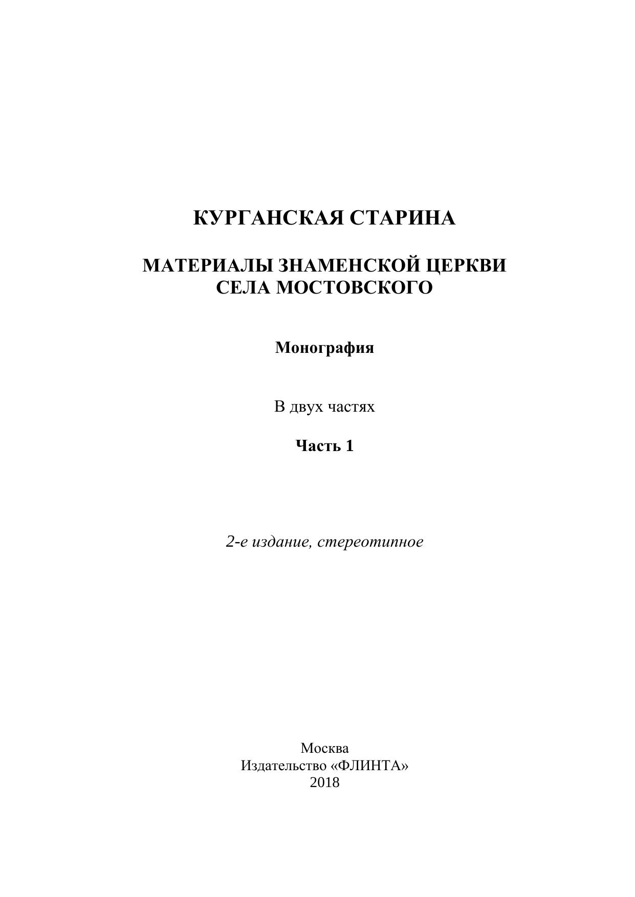 Курганская старина. Материалы Знаменской церкви села Мостовского: в 2 ч. Ч. 1