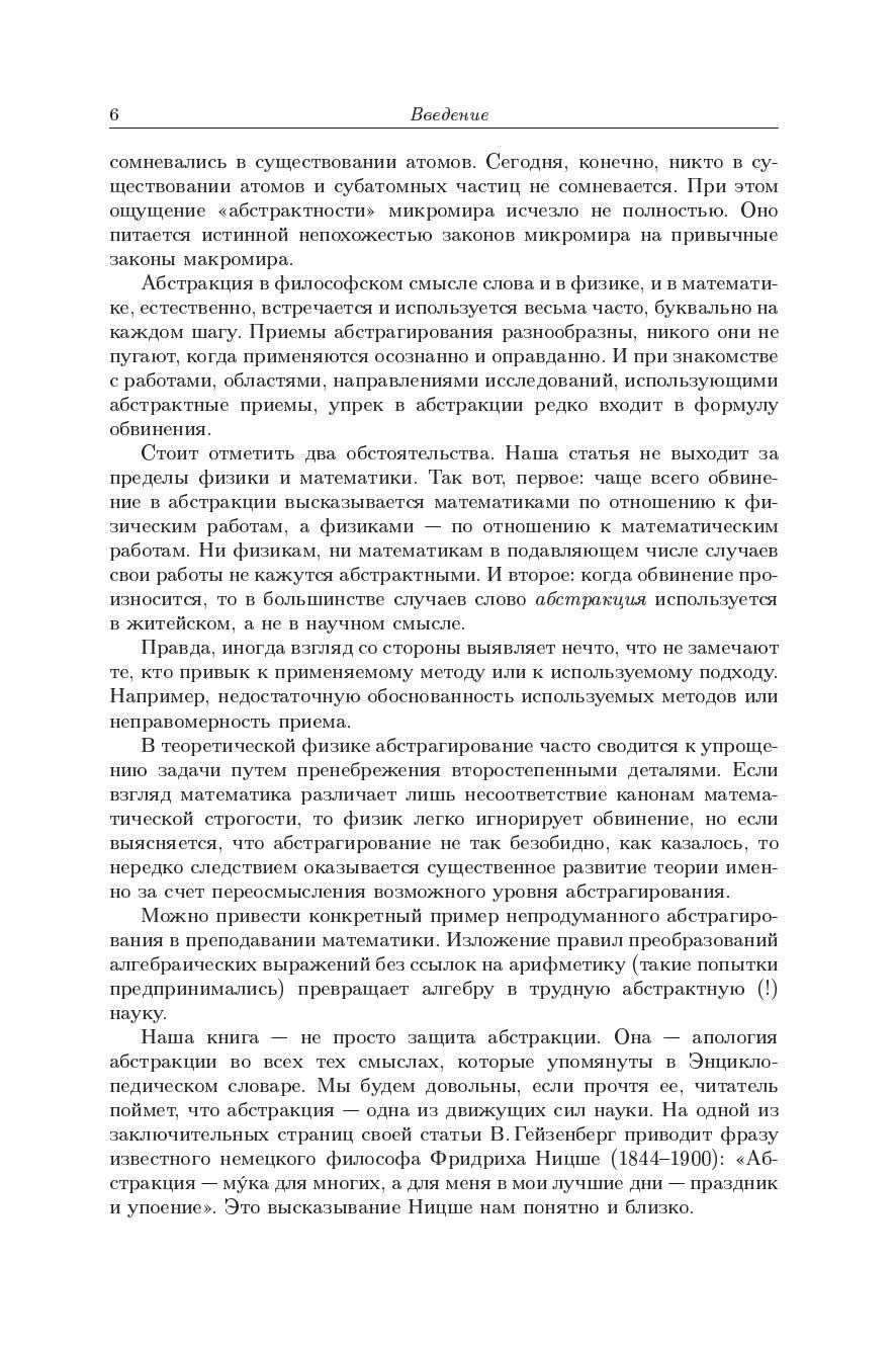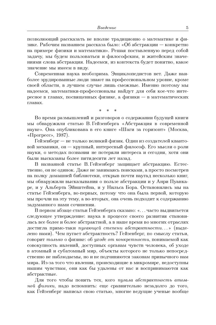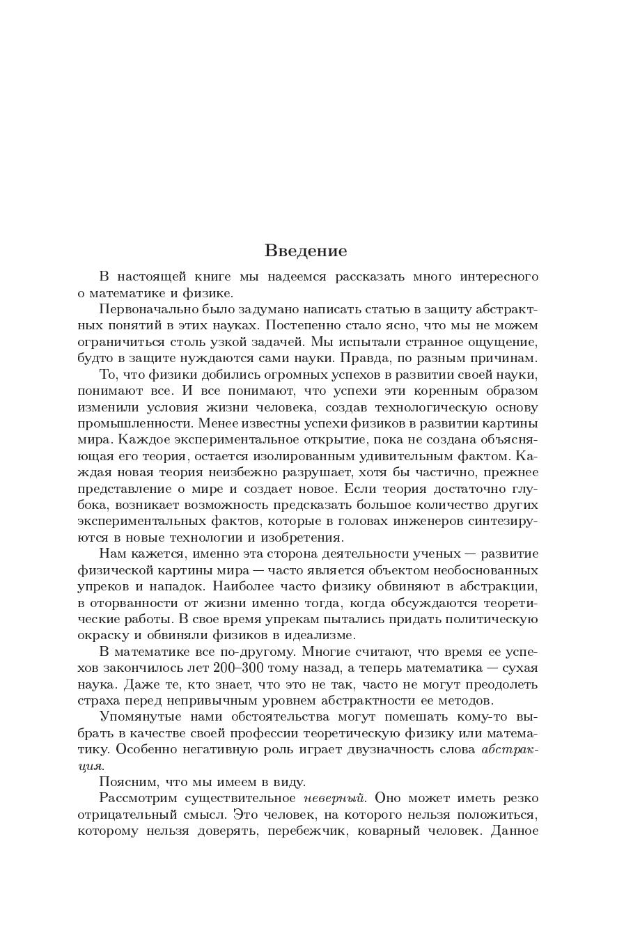 Математическая часть книги представляет собрание эпизодов по истории математики, поскольку история абстрактных понятий от нее неотделима. В ней рассказано о цепи связанных друг с другом и соответствующей цепи абстрактных понятий - инструментов, созданных для решения этих задач. Главное содержание физической части - рассказ о проблемах и достижениях теоретической физики, подчеркивающий роль абстрактных понятий, которые помогают описать многообразие окружающего нас мира. Книга предназначена широкому кругу читателей, интересующихся метематикой и физикой.