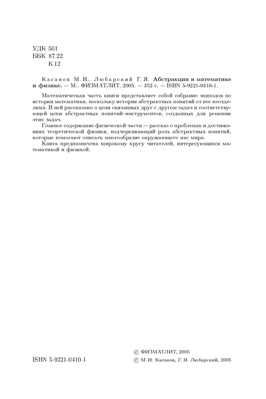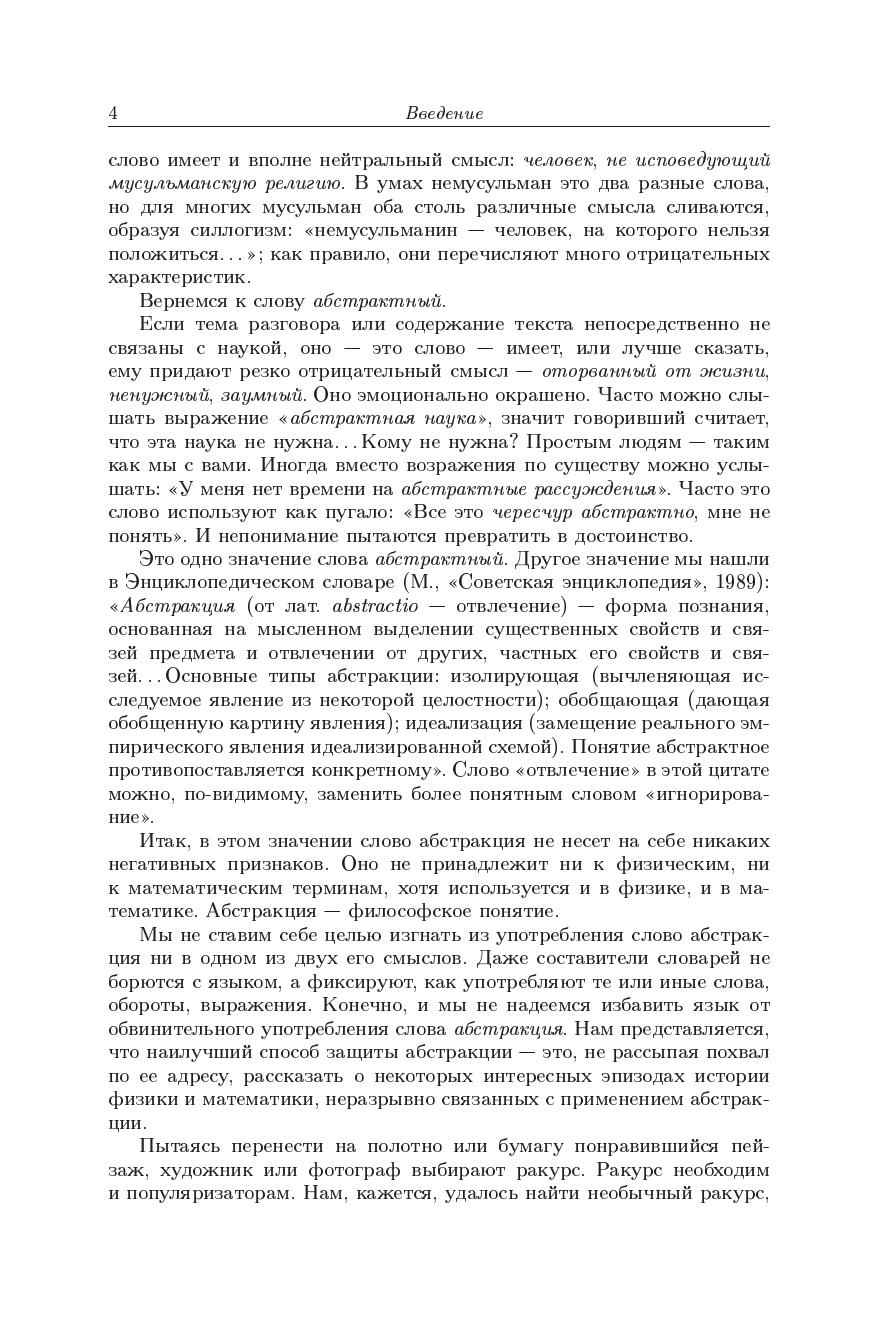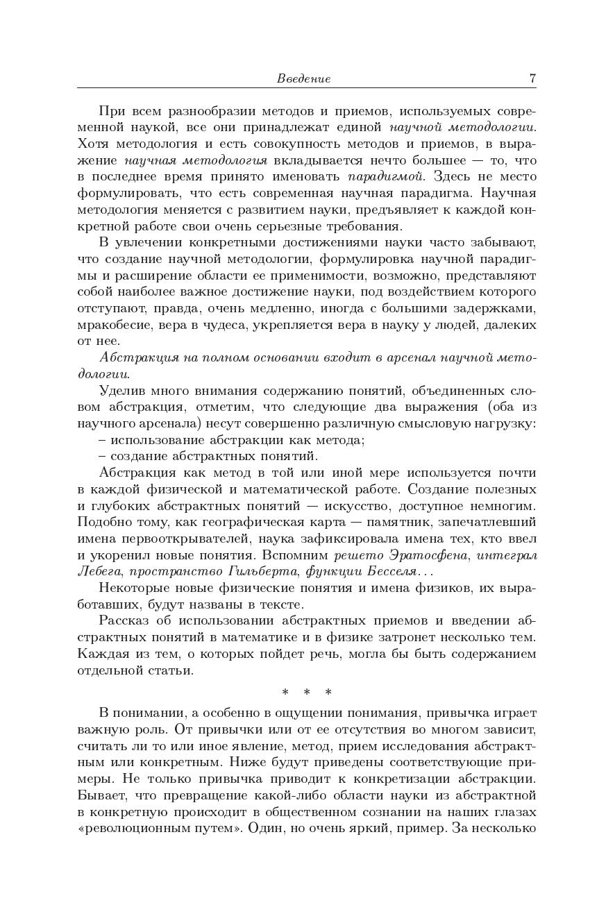 Математическая часть книги представляет собрание эпизодов по истории математики, поскольку история абстрактных понятий от нее неотделима. В ней рассказано о цепи связанных друг с другом и соответствующей цепи абстрактных понятий - инструментов, созданных для решения этих задач. Главное содержание физической части - рассказ о проблемах и достижениях теоретической физики, подчеркивающий роль абстрактных понятий, которые помогают описать многообразие окружающего нас мира. Книга предназначена широкому кругу читателей, интересующихся метематикой и физикой.