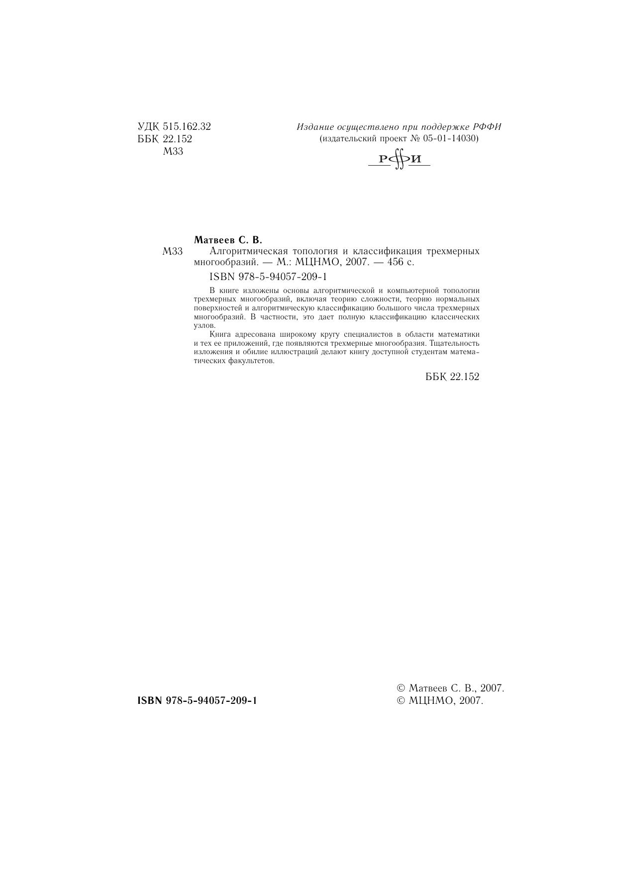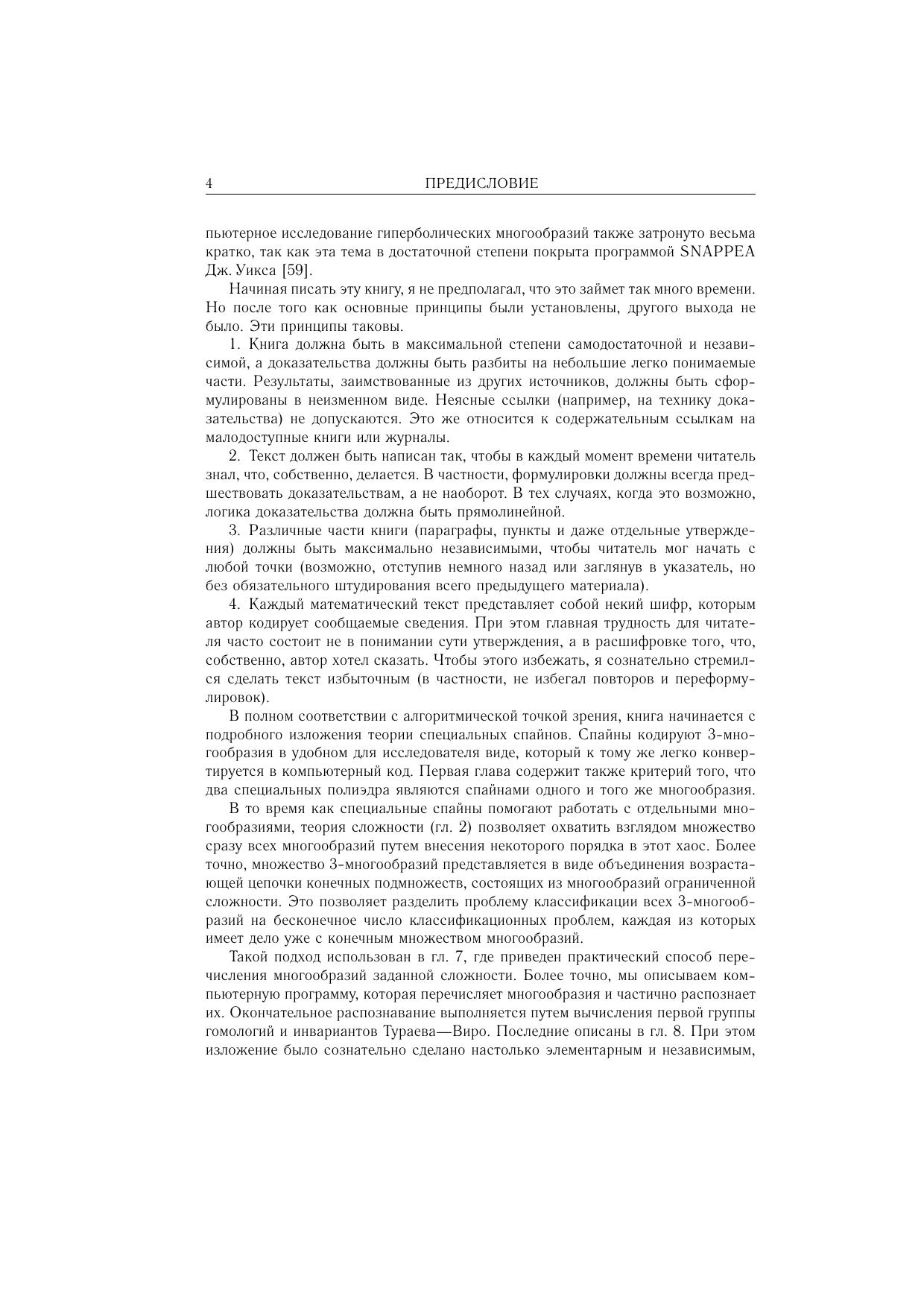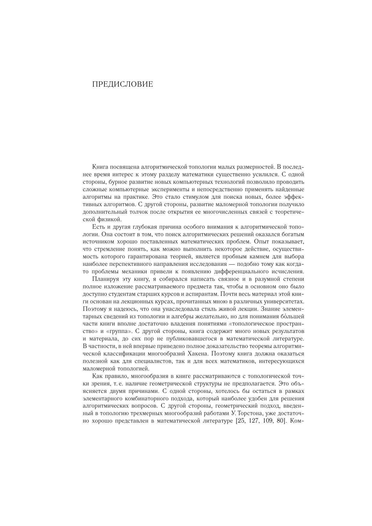 В книге изложены основы алгоритмической и компьютерной топологии трехмерных многообразий, включая теорию сложности, теорию нормальных поверхностей и алгоритмическую классификацию большого числа трехмерных многообразий. В частности, это дает полную классификацию классических узлов.Книга адресована широкому кругу специалистов в области математики и тех ее приложений, где появляются трехмерные многообразия. Тщательность изложения и обилие иллюстраций делают книгу доступной студентам математических факультетов.