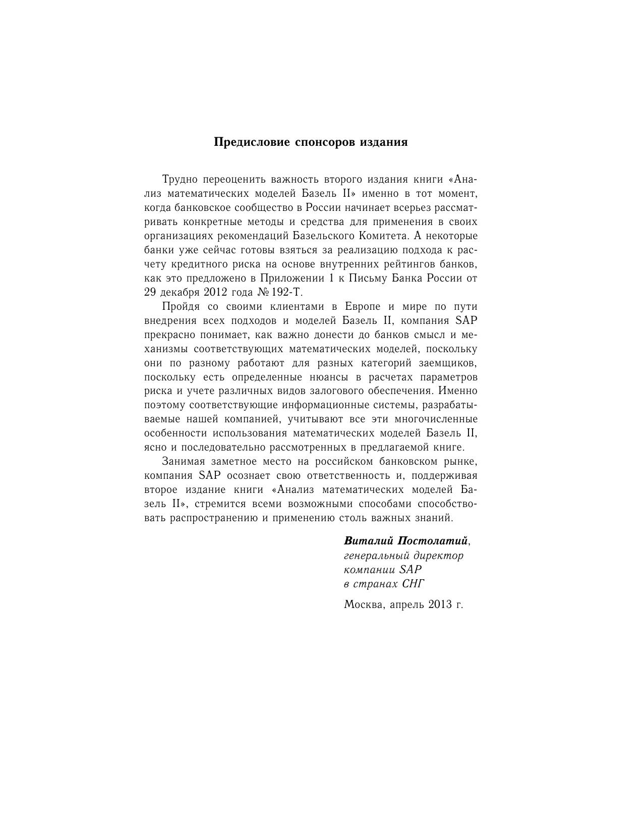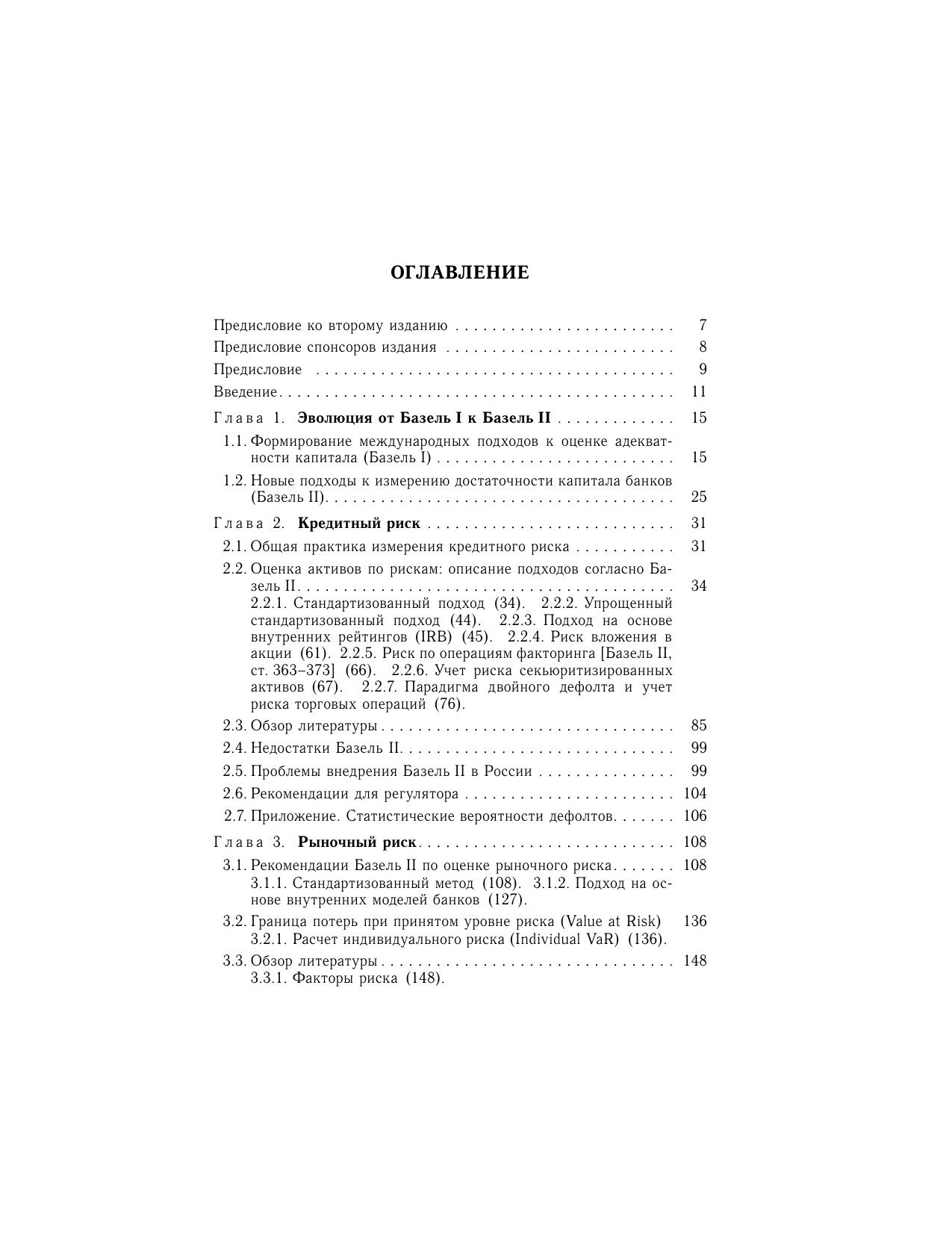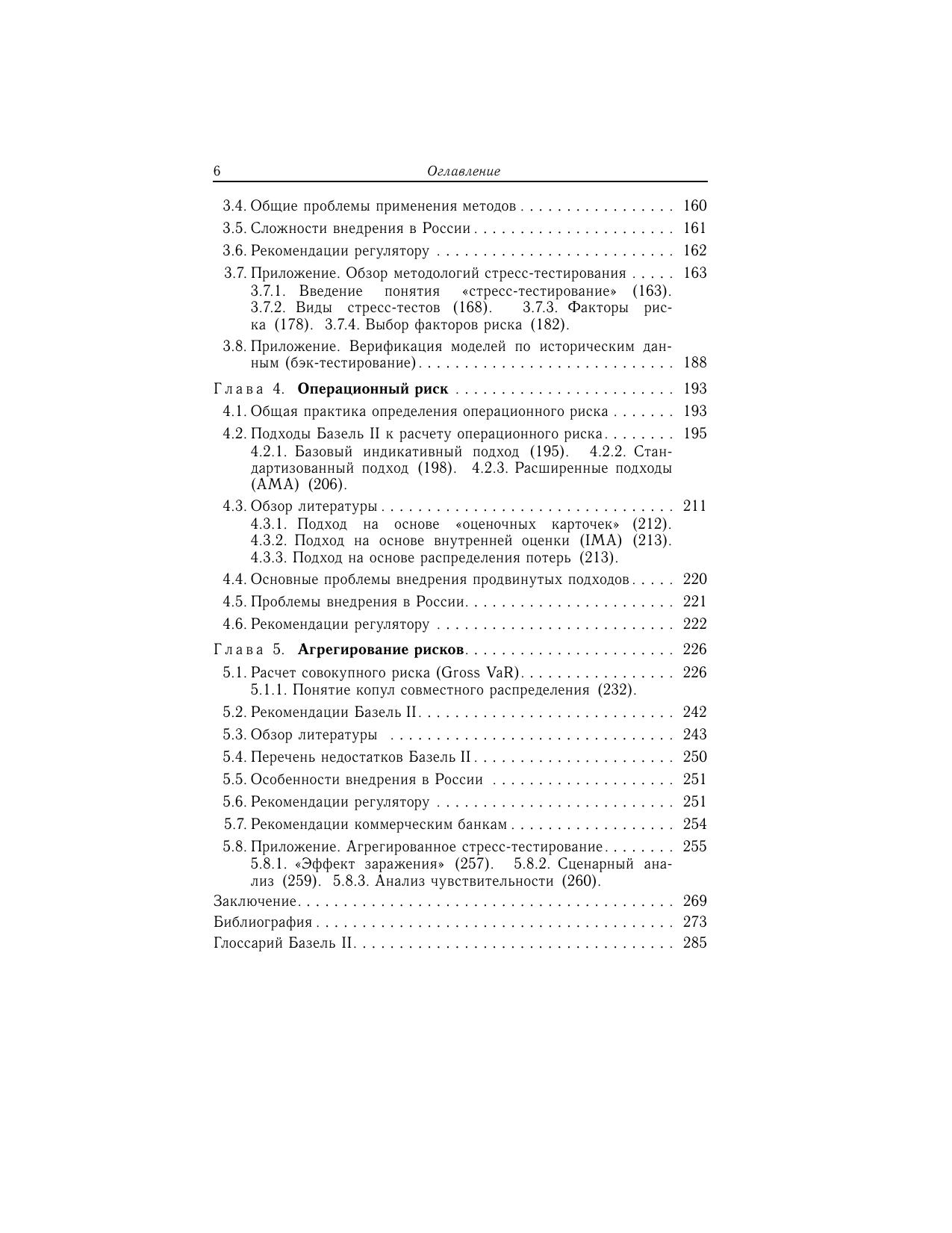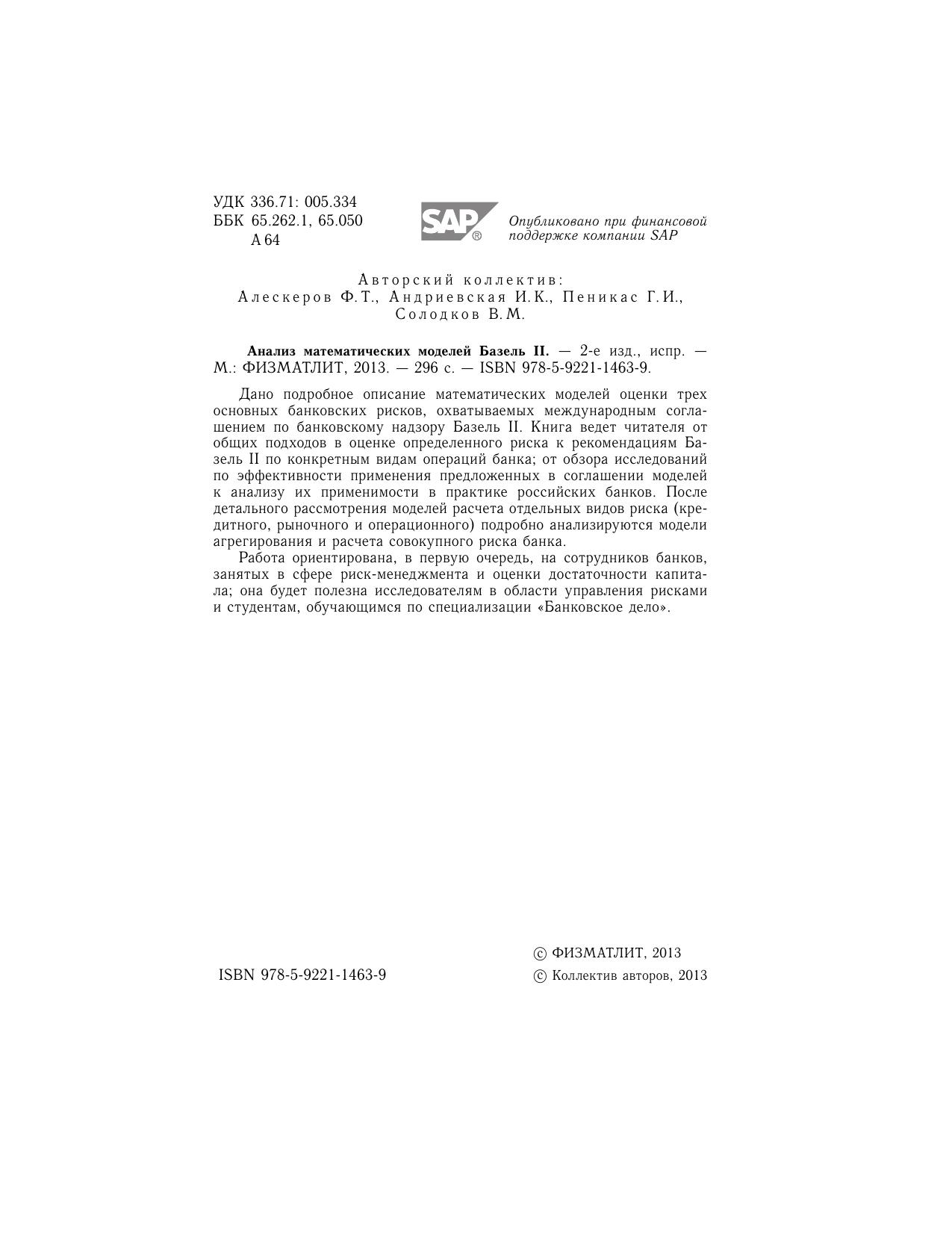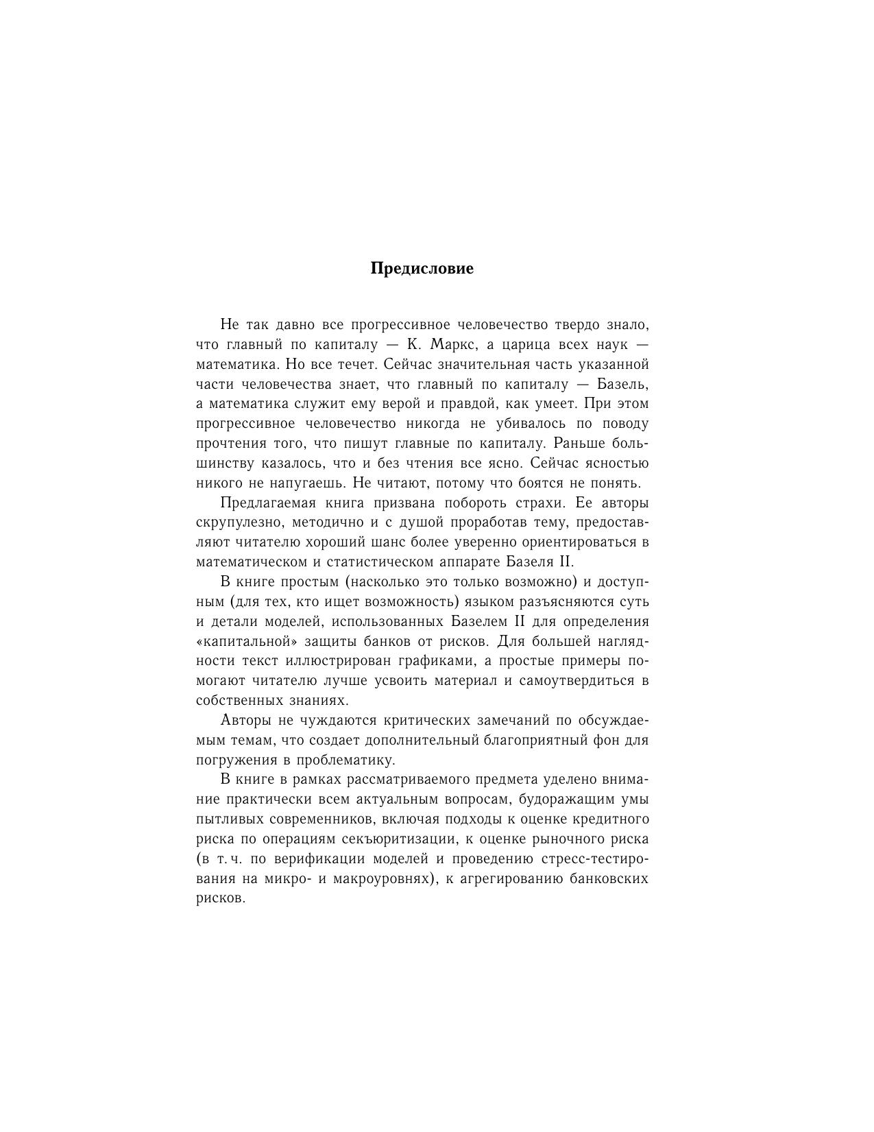 Дано подробное описание математических моделей оценки трех основных банковских рисков, охватываемых международным соглашением по банковскому надзору Базель II. Книга ведет читателя от общих подходов в оценке определенного риска к рекомендациям Базель II по конкретным видам операций банка; от обзора исследований по эффективности применения предложенных в соглашении моделей к анализу их применимости в практике российских банков. После детального рассмотрения моделей расчета отдельных видов риска (кредитного, рыночного и операционного) подробно анализируются модели агрегирования и расчета совокупного риска банка.