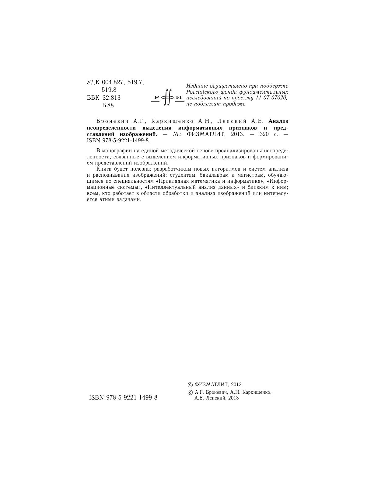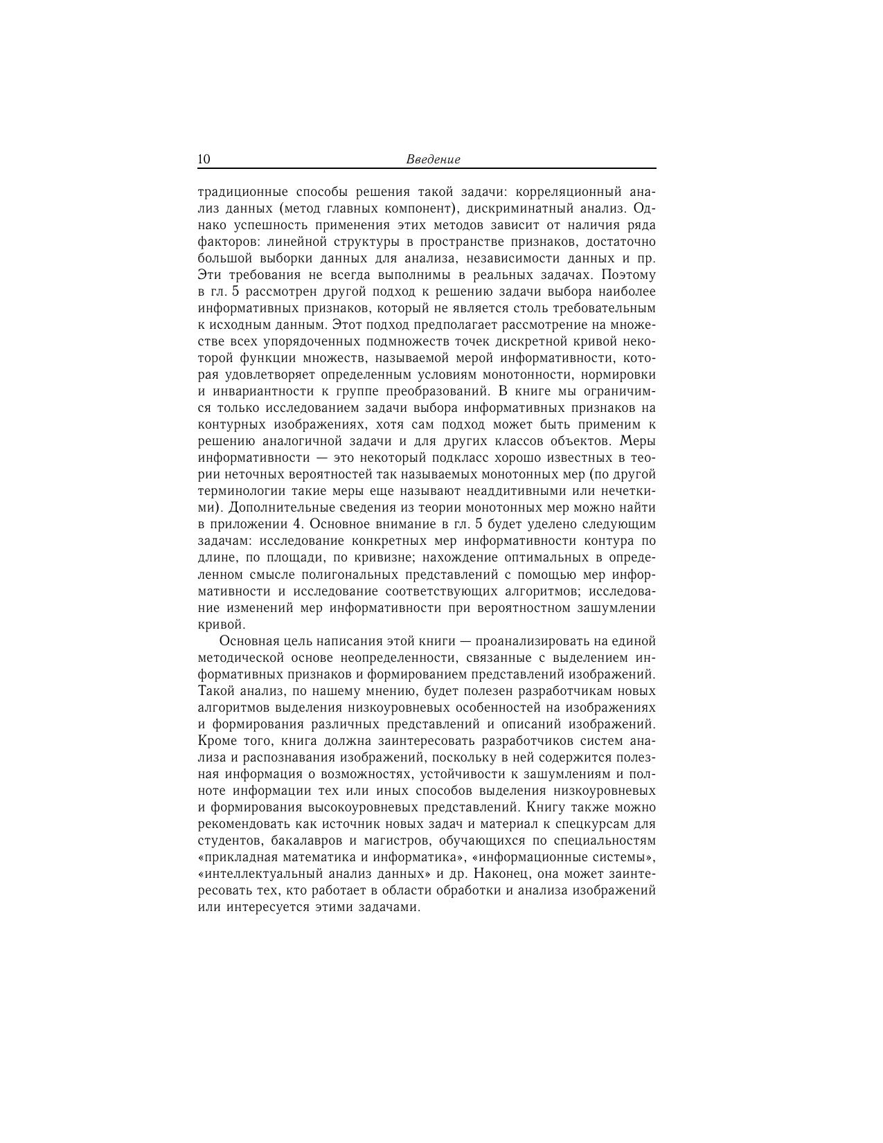 В монографии на единой методической основе проанализированы неопределенности, связанные с выделением информативных признаков и формированием представлений изображений. Книга будет полезна: разработчикам новых алгоритмов и систем анализа и распознавания изображений студентам, бакалаврам и магистрам, обучающимся по специальностям «Прикладная математика и информатика», «Информационные системы», «Интеллектуальный анализ данных» и близким к нимвсем, кто работает в области обработки и анализа изображений или интересуется этими задачами.