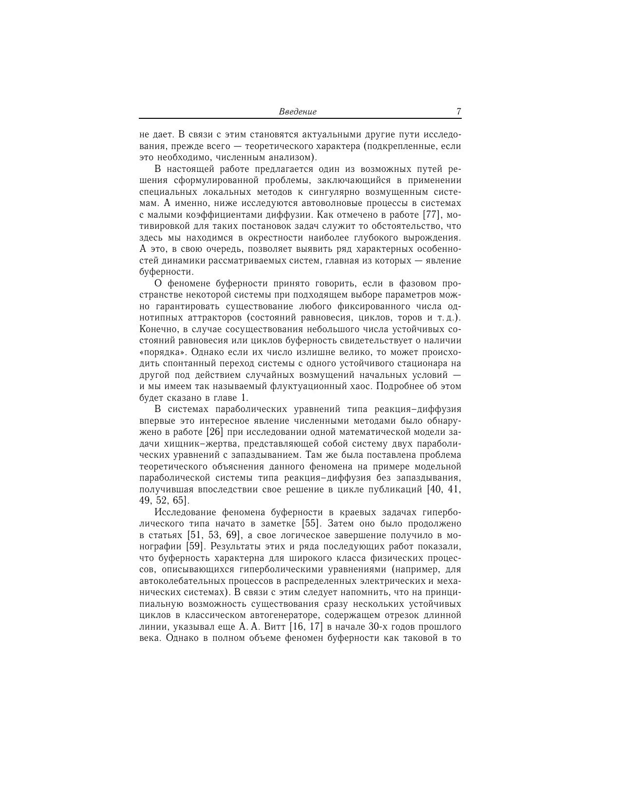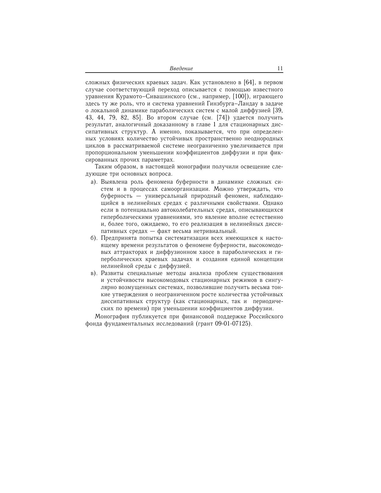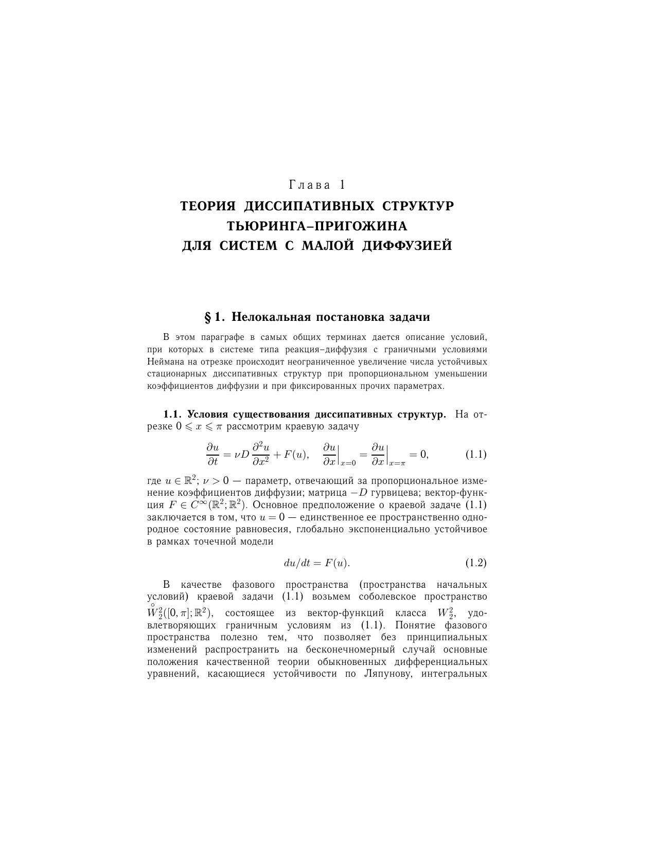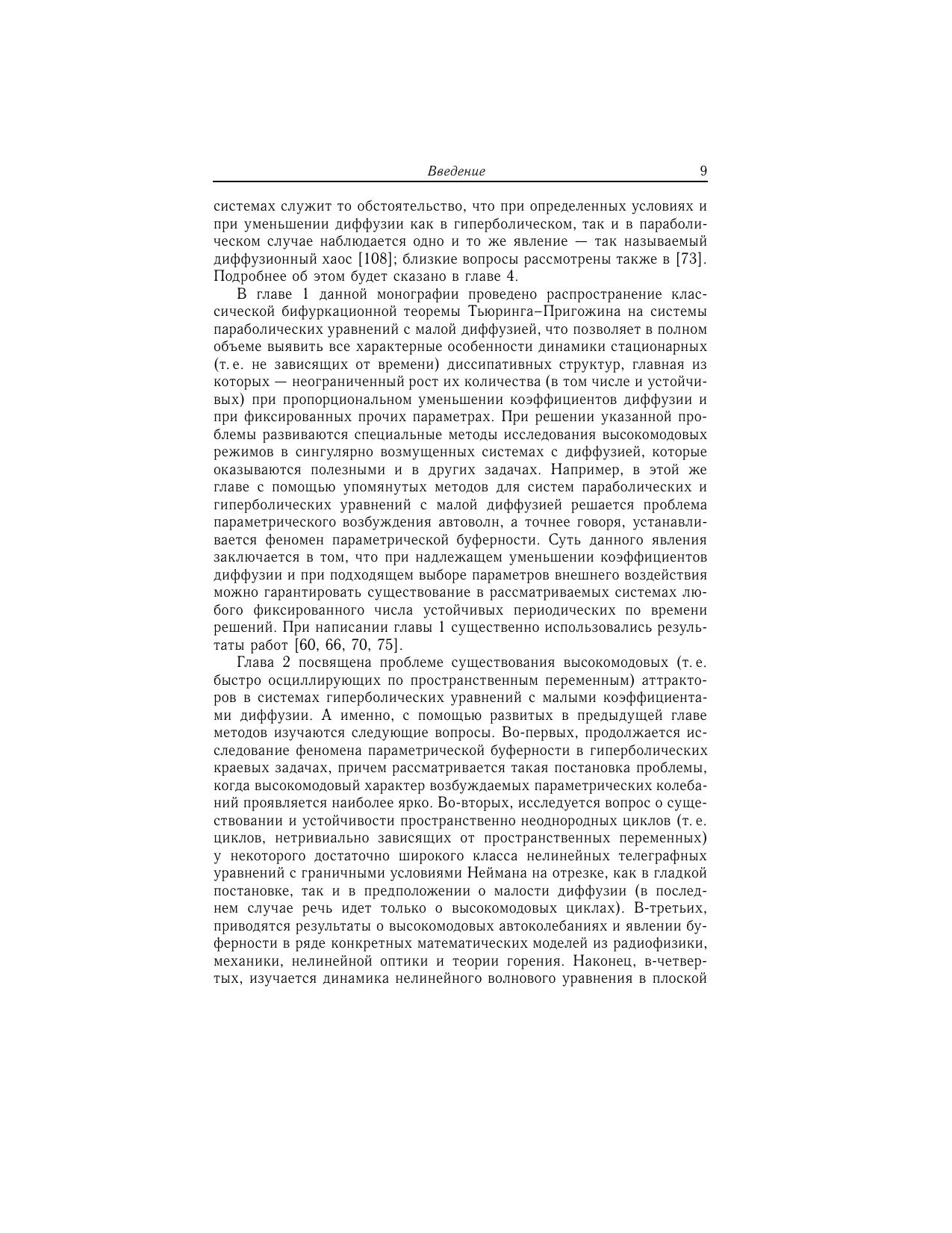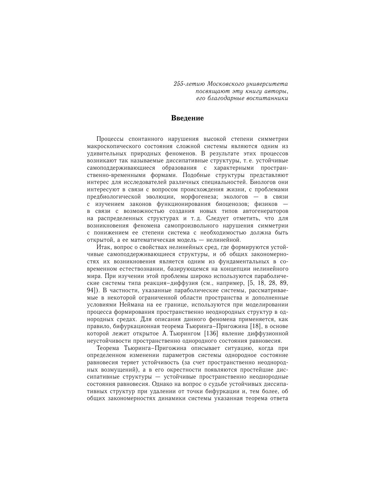 В монографии предпринимается попытка создания единой теории диссипативных структур Тьюринга--Пригожина для систем параболических и гиперболических уравнений с малой диффузией. Для этого развиваются специальныеасимптотические методы исследования проблем существования и устойчивости высокомодовых стационарных режимов в сингулярно возмущенных системах, позволяющие получить весьма тонкие утверждения о неограниченном росте количества устойчивых диссипативных структур (как стационарных, так и~периодических по времени) при уменьшении коэффициентов диффузии и при фиксированных прочих параметрах. Вырабатываются общие представления о~характере автоволновых процессов в нелинейных средах с малой диффузией на основе систематического анализа феномена буферности, высокомодовых аттракторов и диффузионного хаоса. Рассматриваются приложения из радиофизики, механики, экологии, нелинейной оптики и теории горения. Для студентов старших курсов, аспирантов математических и физических факультетов университетов, специалистов по прикладной математике, теории колебаний, нелинейной динамике.