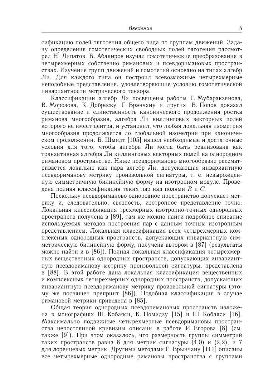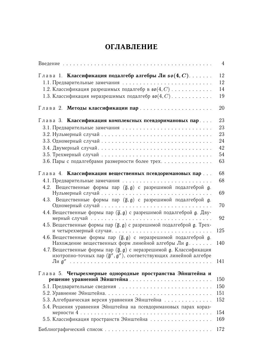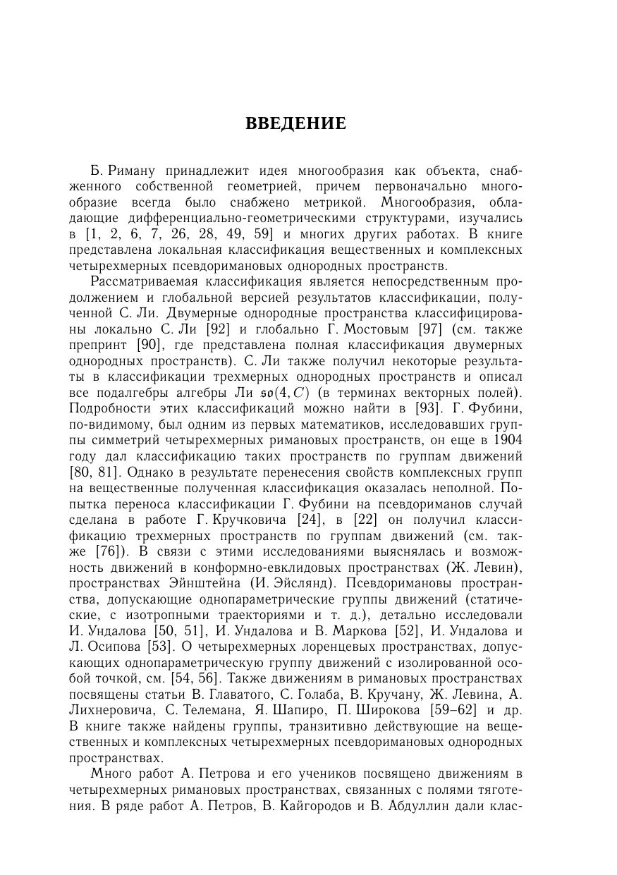 Книга посвящена изучению вещественных и комплексных четырехмерных псевдоримановых однородных пространств, также приведены четырехмерных однородные пространства Эйнштейна и решения уравнений Эйнштейна. Проведена полная локальная классификация четырехмерных псевдоримановых однородных пространств, эквивалентная описанию эффективных пар алгебр Ли. Для исследований использован алгебраический подход, а также соединение различных методов дифференциальной геометрии, теории групп и алгебр Ли и теории однородных пространств. Для научных работников, преподавателей, аспирантов и студентов, специализирующихся в области математики и ее приложений.