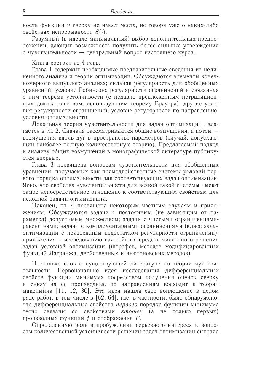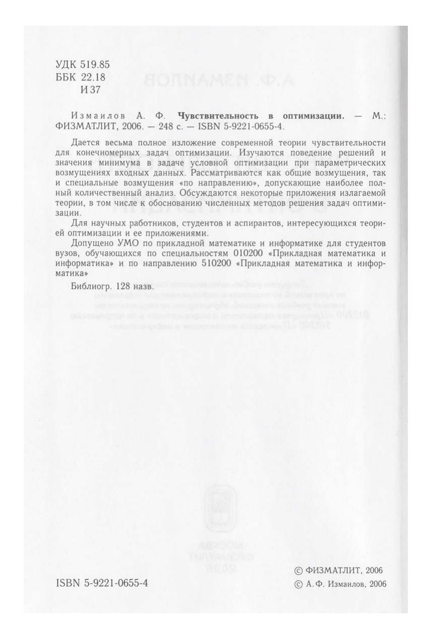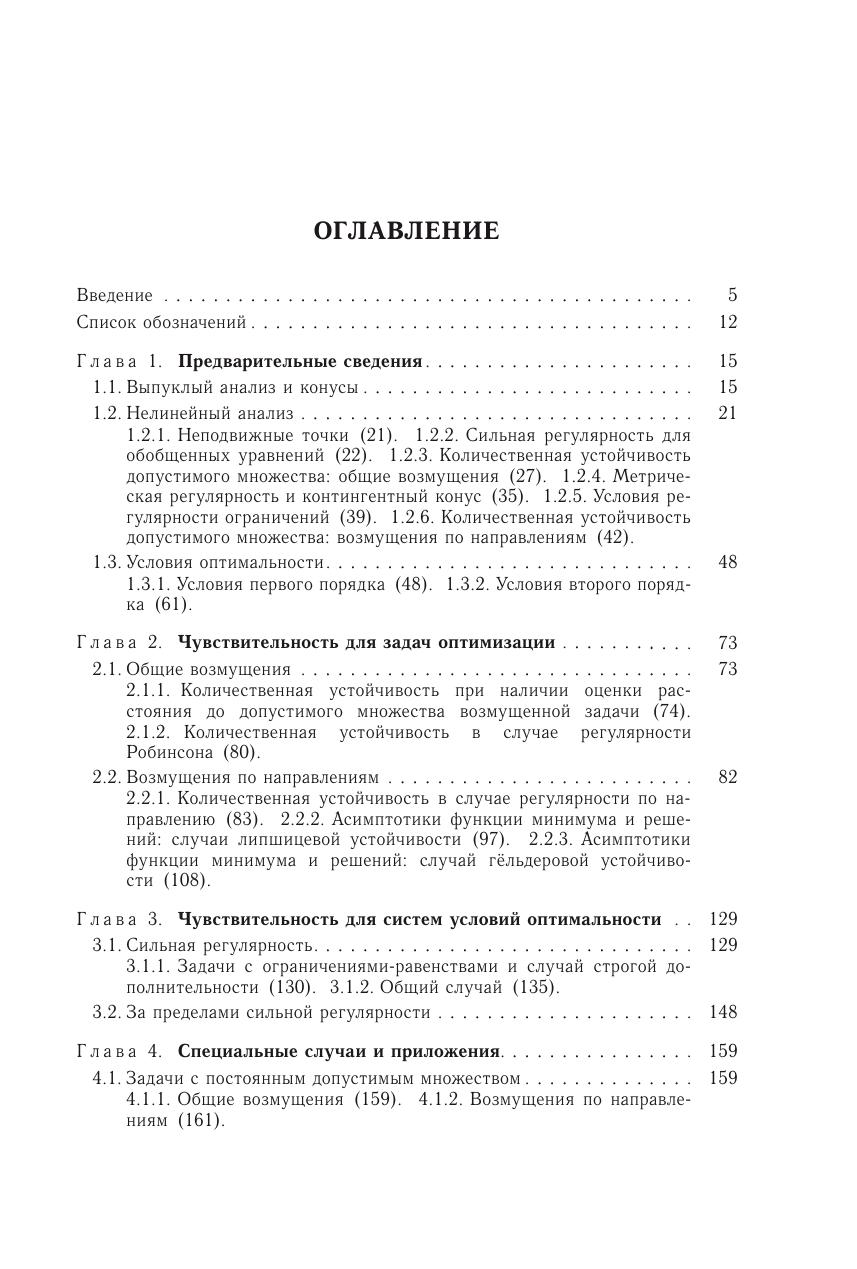 Дается весьма полное изложение современной теории чувствительности для конечномерных задач оптимизации. Изучаются поведение решений и значения минимума в задаче условной оптимизации при параметрических возмущениях входных данных. Рассматриваются как общие возмущения, так и специальные возмущения "по направлению", допускающие наиболее полный количественный анализ. Обсуждаются некоторые приложения излагаемой теории, в том числе к обоснованию численных методов решения задач оптимизации.Для научных работников, студентов и аспирантов, интересующихся теорией оптимизации и ее приложениями.