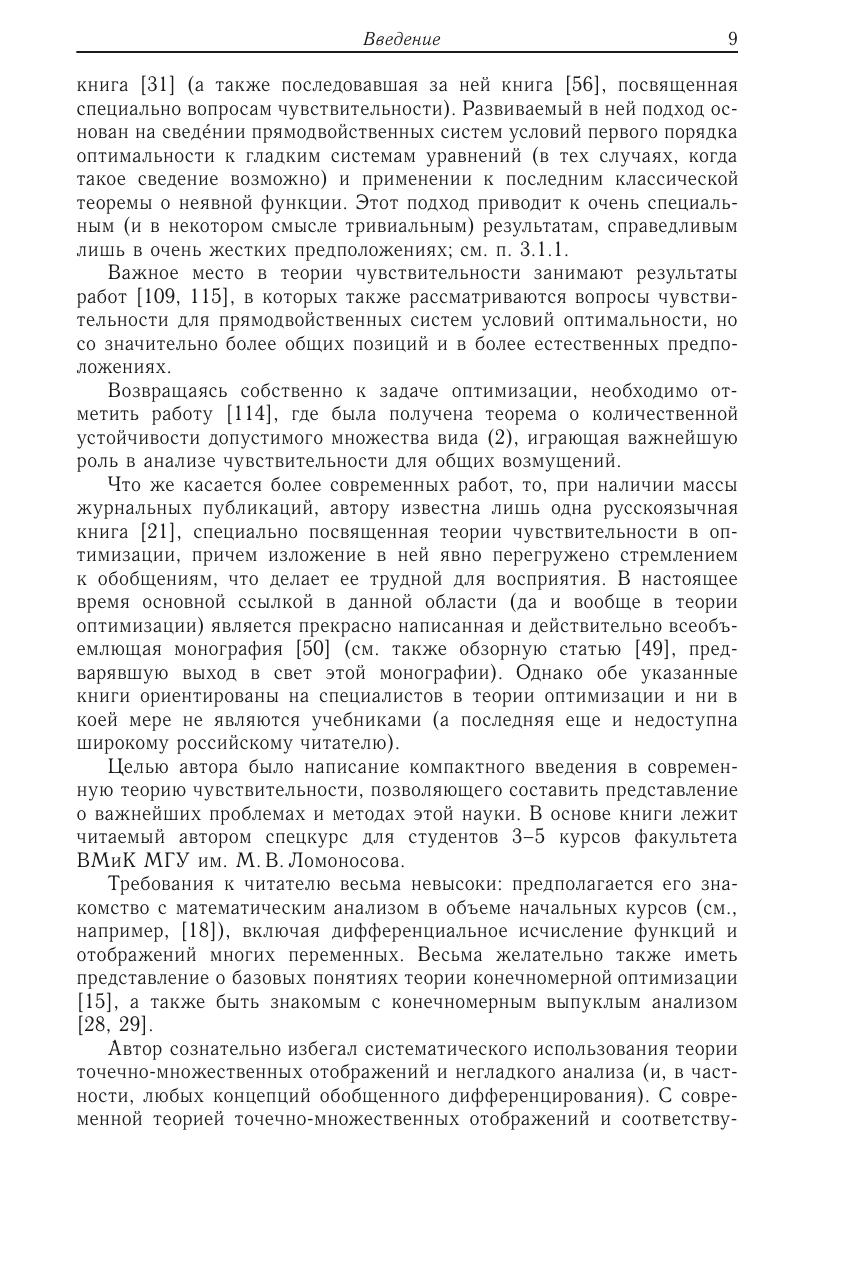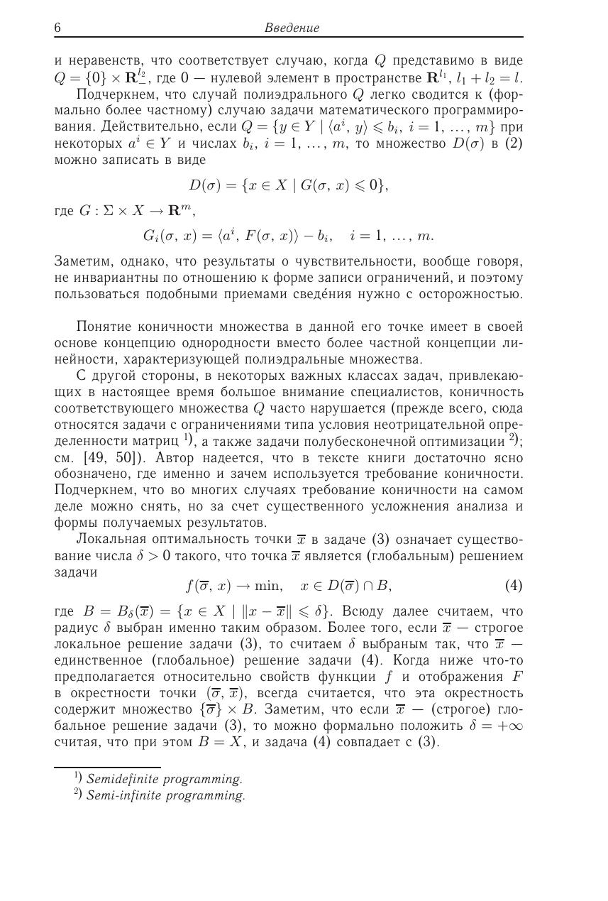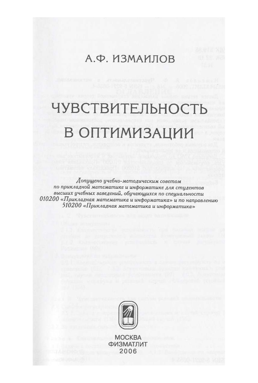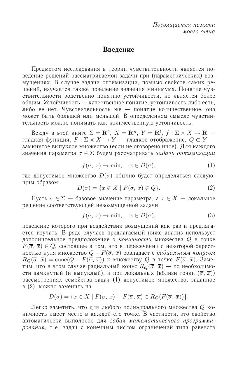 Дается весьма полное изложение современной теории чувствительности для конечномерных задач оптимизации. Изучаются поведение решений и значения минимума в задаче условной оптимизации при параметрических возмущениях входных данных. Рассматриваются как общие возмущения, так и специальные возмущения "по направлению", допускающие наиболее полный количественный анализ. Обсуждаются некоторые приложения излагаемой теории, в том числе к обоснованию численных методов решения задач оптимизации.Для научных работников, студентов и аспирантов, интересующихся теорией оптимизации и ее приложениями.