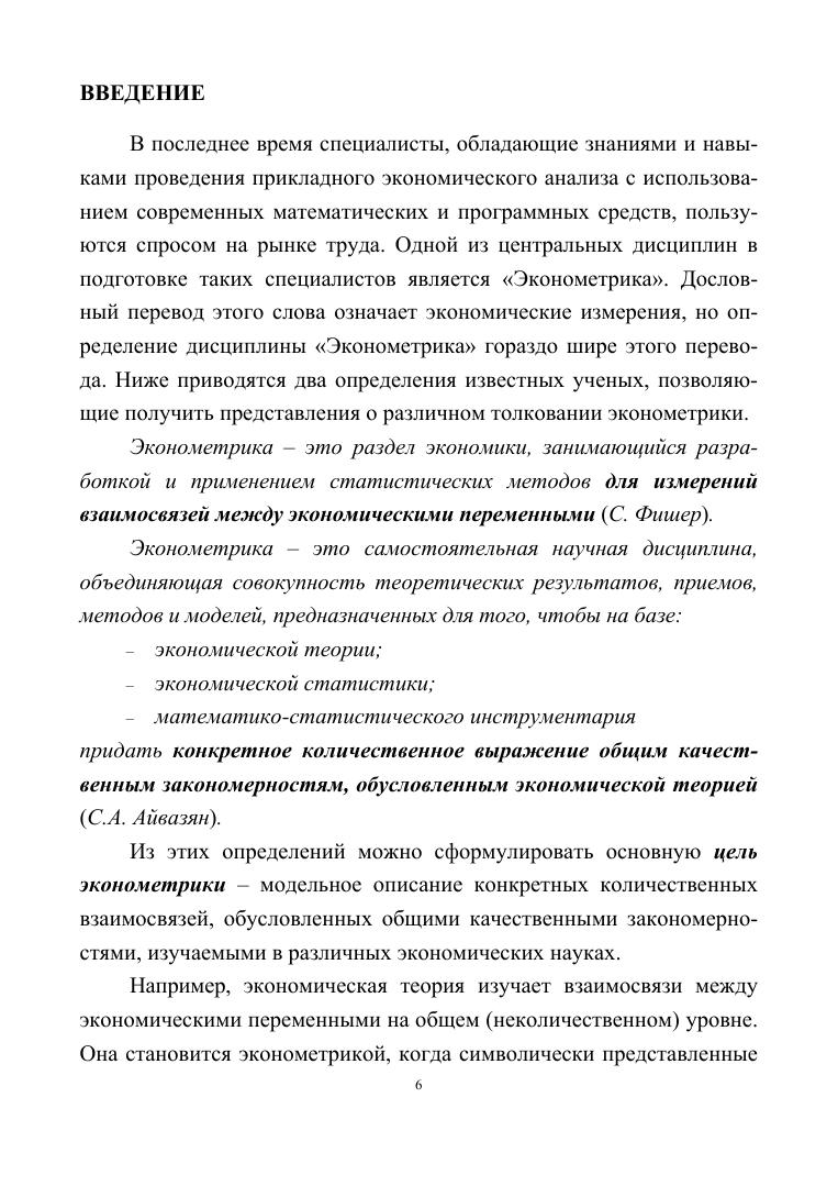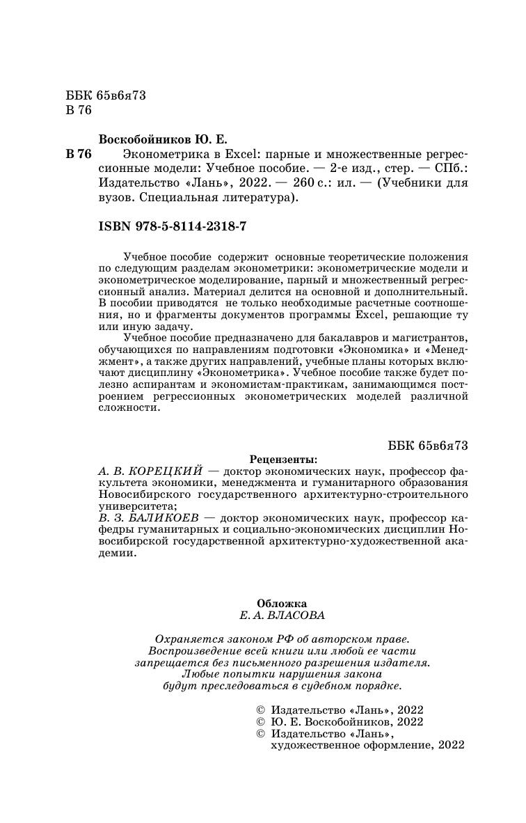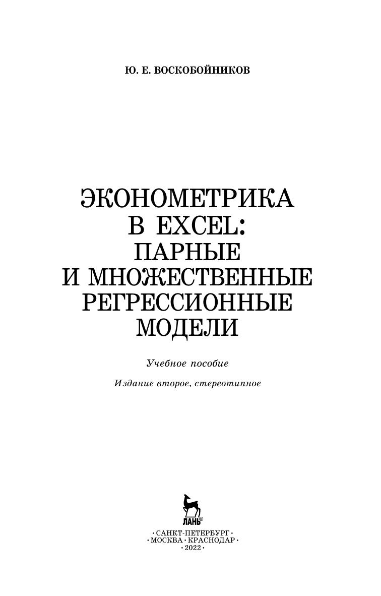 Учебное пособие содержит основные теоретические положения по следующим разделам эконометрики: эконометрические модели и эконометрическое моделирование, парный и множественный регрессионный анализ. Материал делится на основной и дополнительный. В пособии приводятся не только необходимые расчетные соотношения, но и фрагменты документов программы Excel, решающие ту или иную задачу. Учебное пособие предназначено для бакалавров и магистрантов, обучающихся направлениям подготовки «Экономика» и «Менеджмент», а также других направлений, учебные планы которых включают дисциплину «Эконометрику». Учебное пособие также будет полезно аспирантам и экономистам-практикам, занимающимся построением регрессионных эконометрических моделей различной сложности.