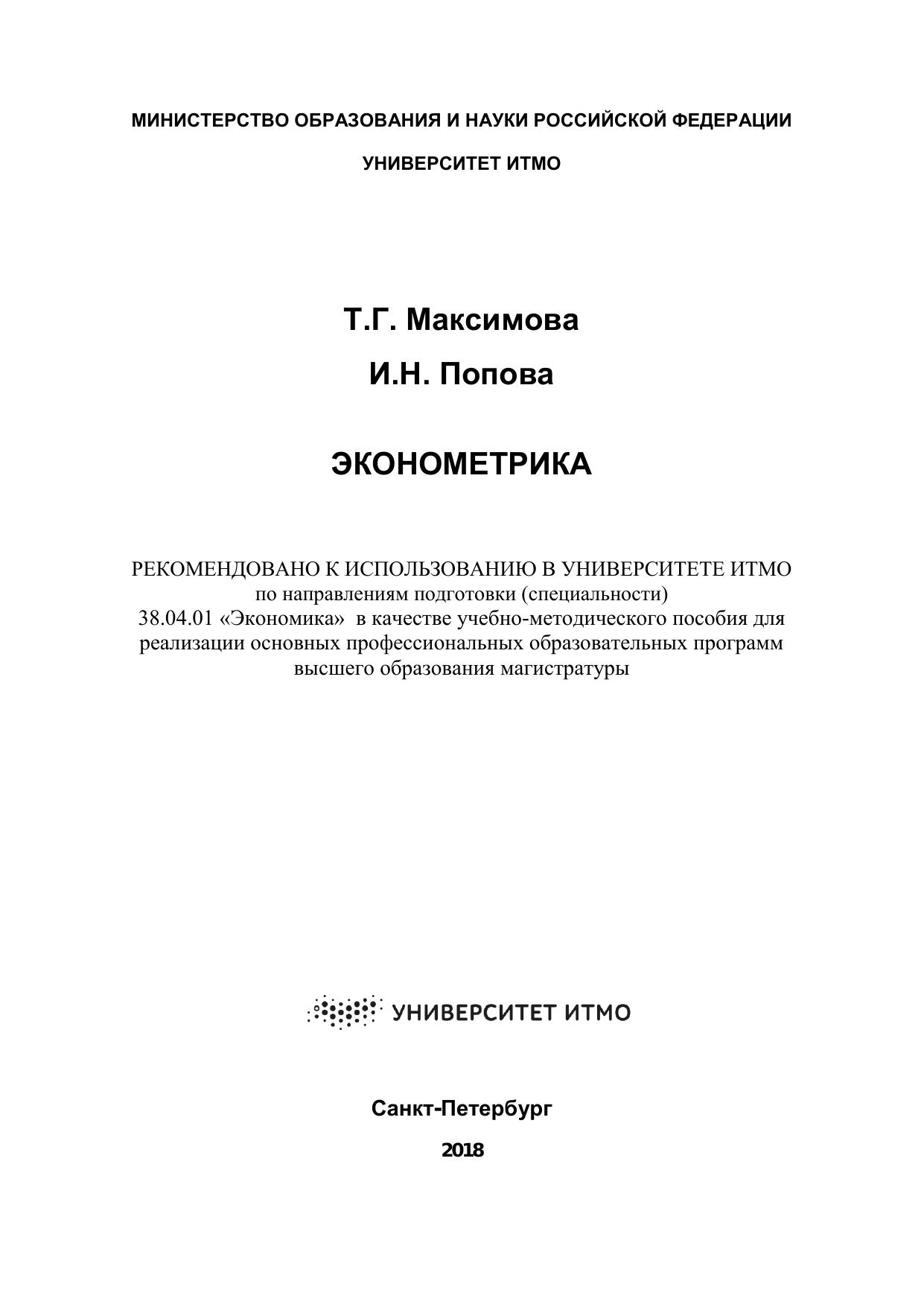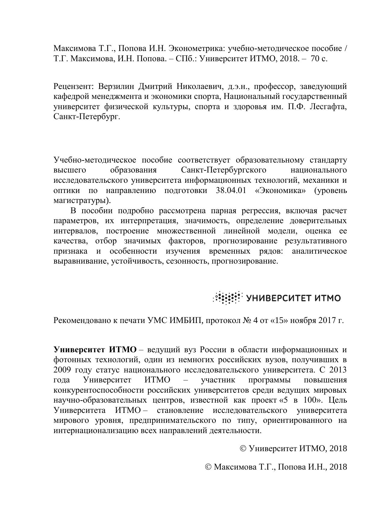 Учебно-методическое пособие соответствует образовательному стандарту высшего образования Санкт-Петербургского национального исследовательского университета информационных технологий, механики и оптики по направлению подготовки 38.04.01 «Экономика» (уровень магистратуры).