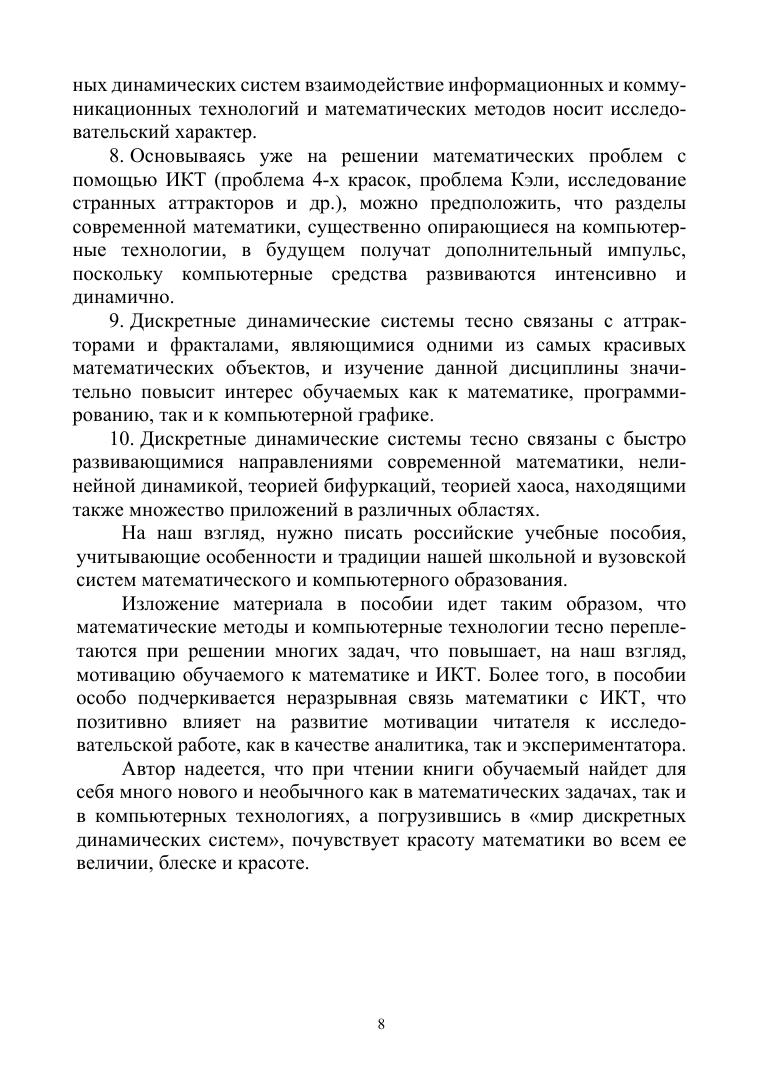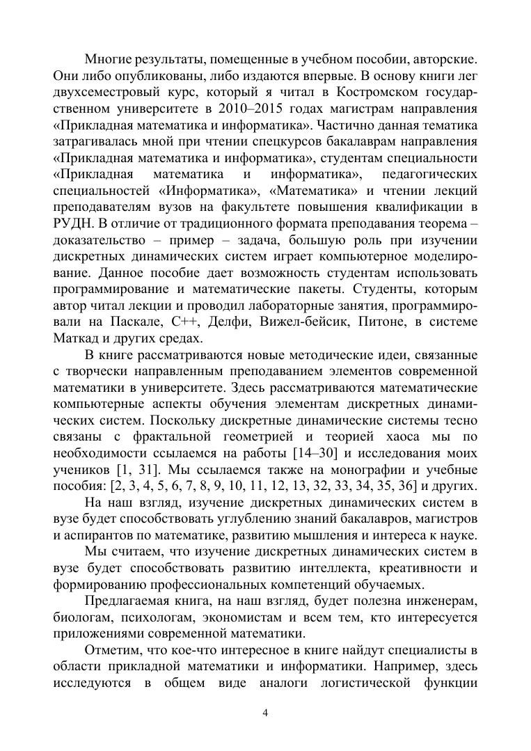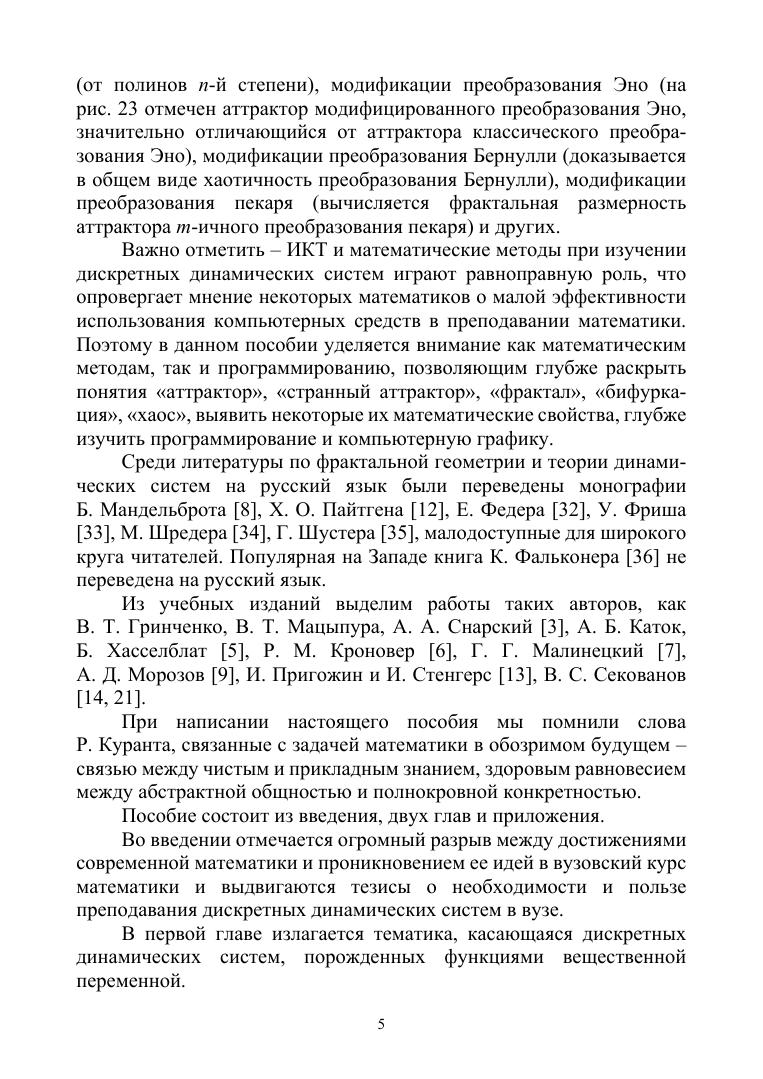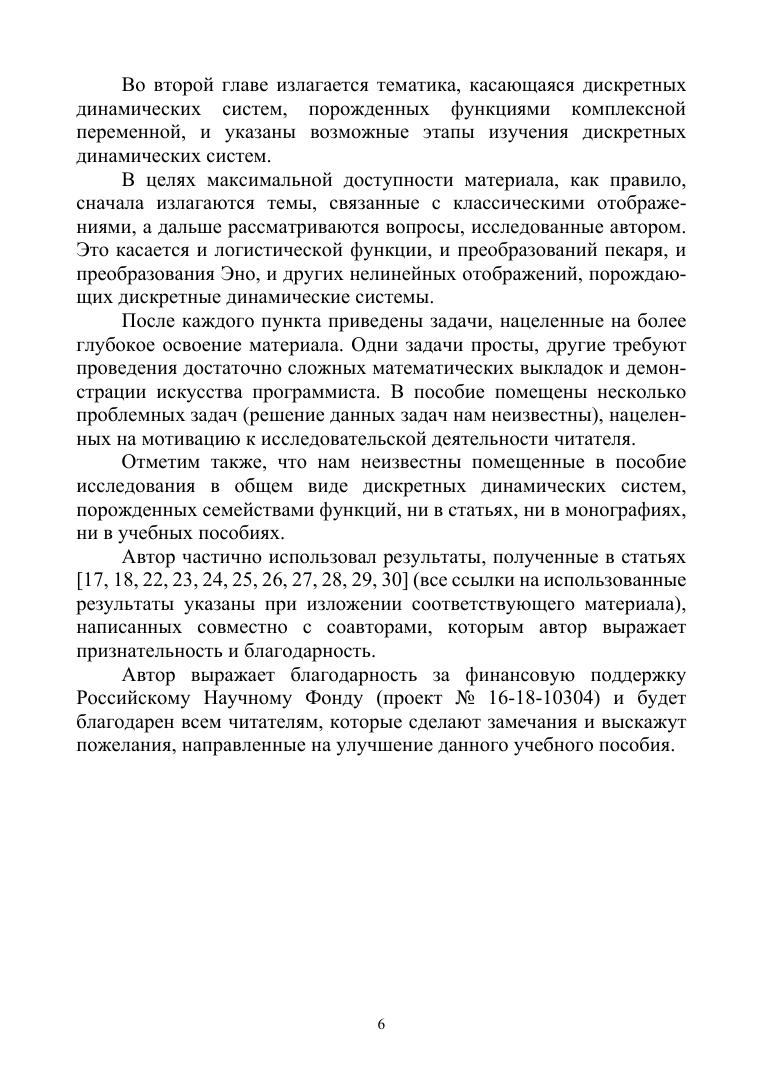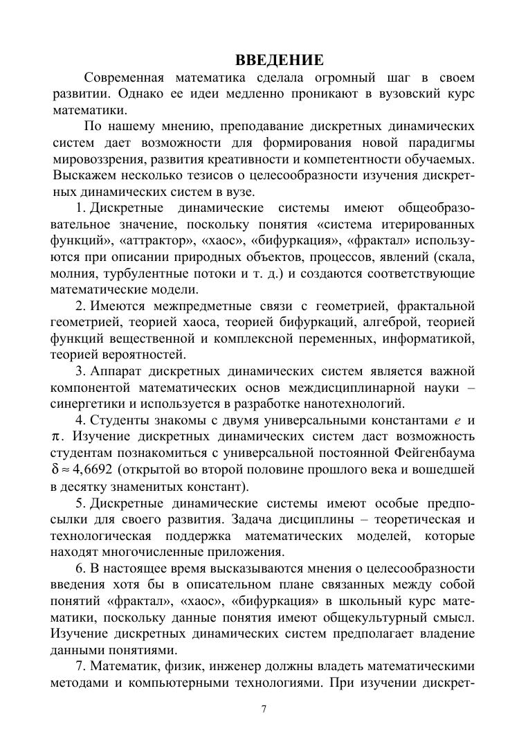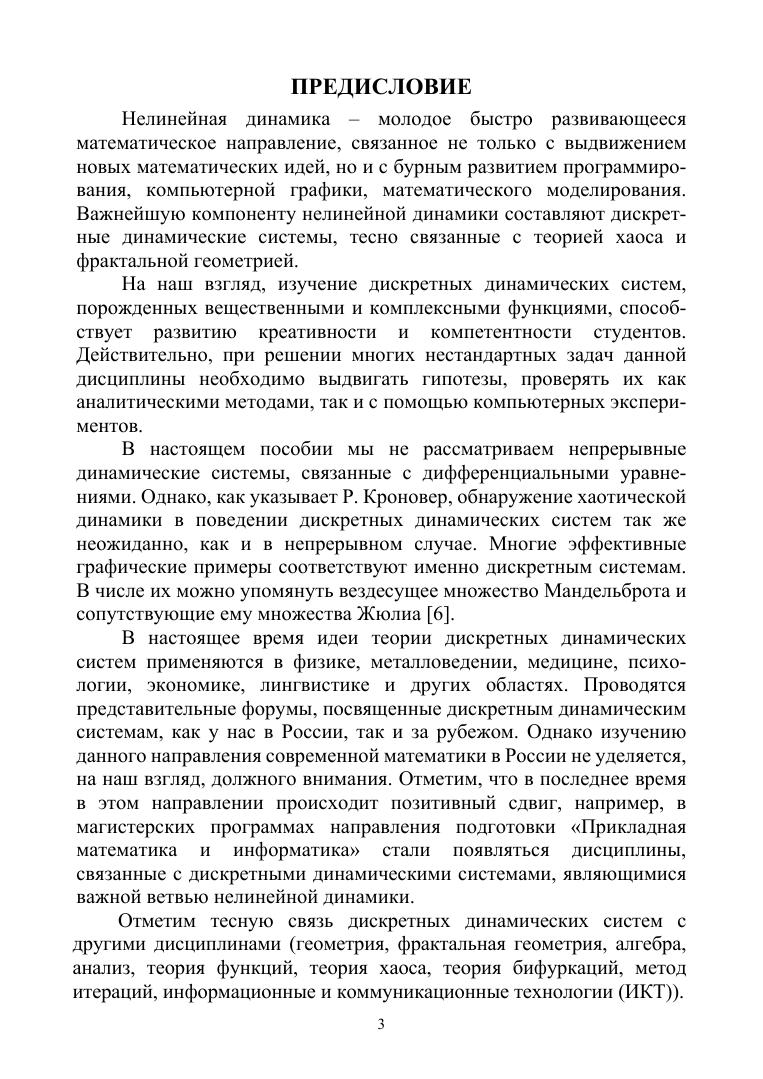 В учебном пособии рассматривается построение аттракторов нелинейных отображений в различных средах, приводится доказательство хаотичности модифицированного преобразования пекаря и сдвига Бернулли. Изложен алгоритм построения дерева Фейгенбаума для аналогов логистической функции и вычислены константы Фейгенбаума указанных функций. Вычислены размерности самоподобия некоторых аттракторов и исследовано модифицированное преобразование Эно. Указаны алгоритмы построения множеств Жюлиа полиномов и рациональных функций. Особое место уделено построению множеств Жюлиа полиномов Чебышева. В учебное пособие включены разного уровня сложности многочисленные задачи, позволяющие глубже усвоить излагаемый в пособии материал. В последнем разделе книги указано многоэтапное математико-информационное задание «Дискретные динамические системы», посвященное пошаговому изучению дисциплины и нацеленное на развитие креативности и компетентности обучаемых. Настоящее пособие адресовано бакалаврам, магистрам, аспирантам, обучающимся по направлениям подготовки и специальностям, входящим в УГС: «Математика и механика», «Компьютерные и информационные науки», «Физика и астрономия». Пособие также будет полезно специалистам в области нелинейной динамики, преподавателям математики и информатики высшей школы, а также учителям математики и информатики, ученикам средних школ с углубленным изучением математики.