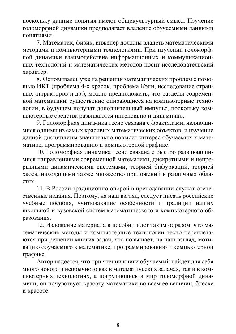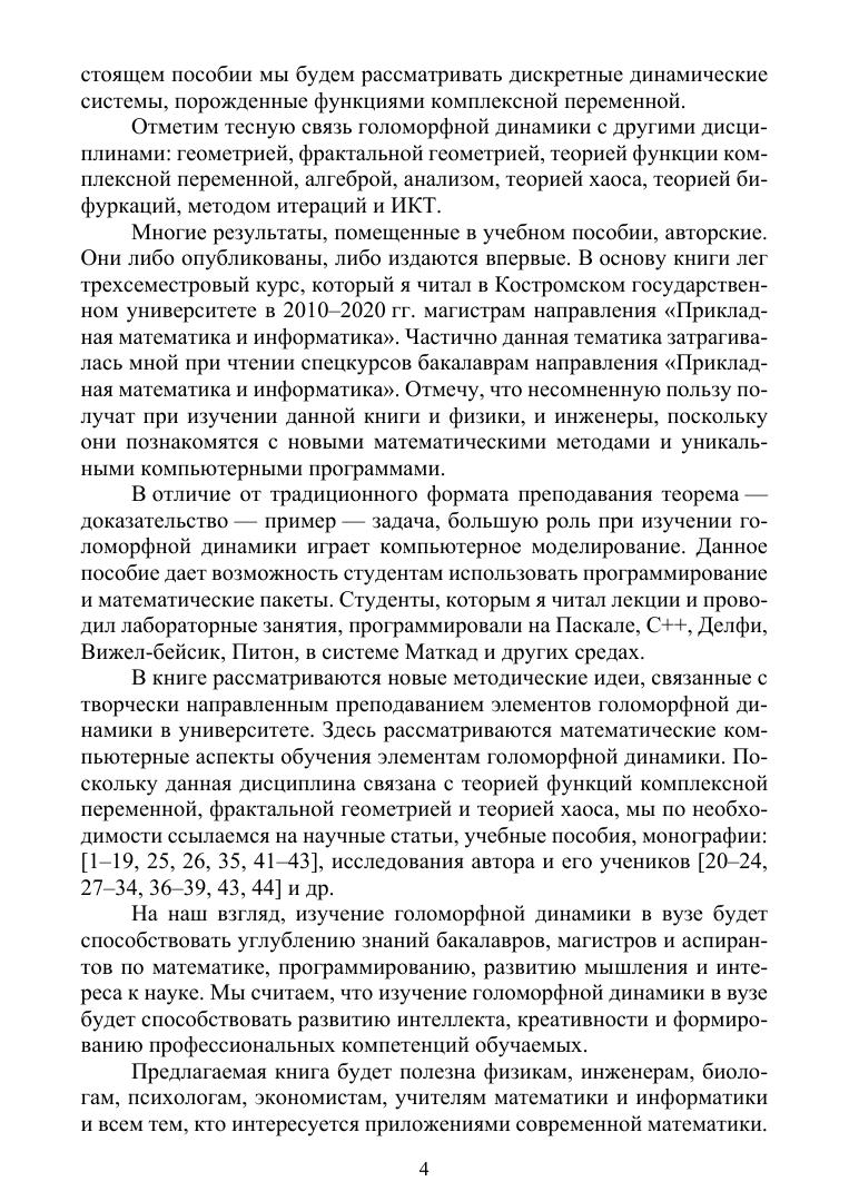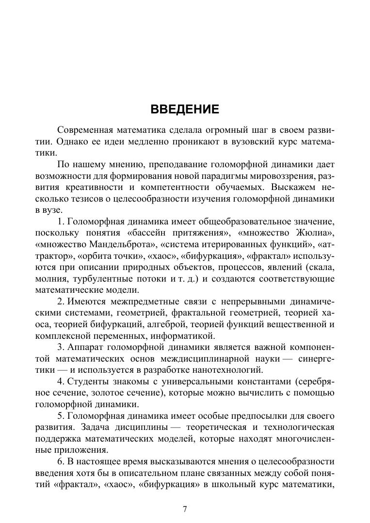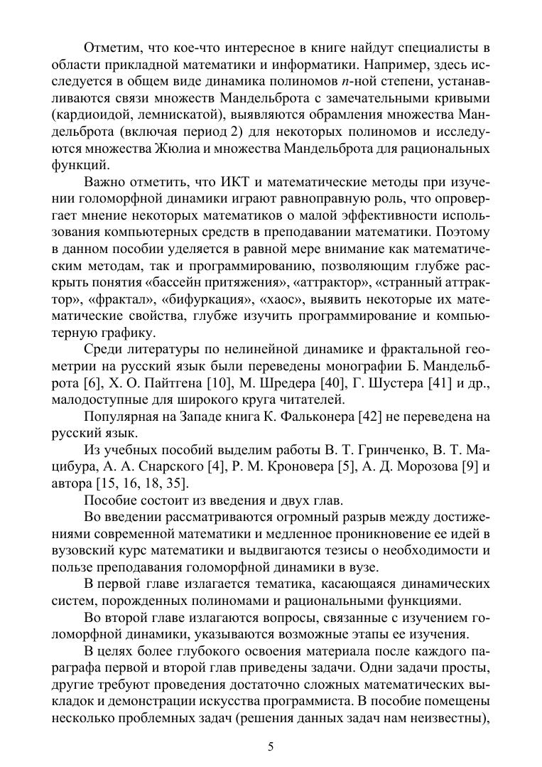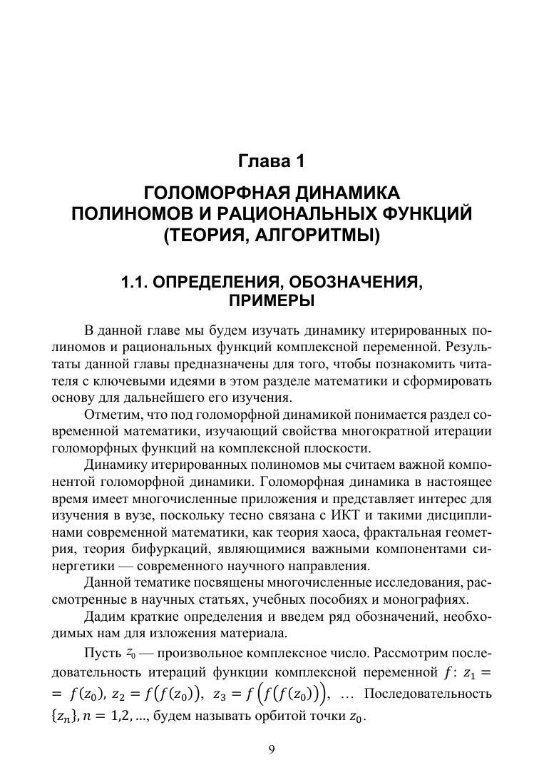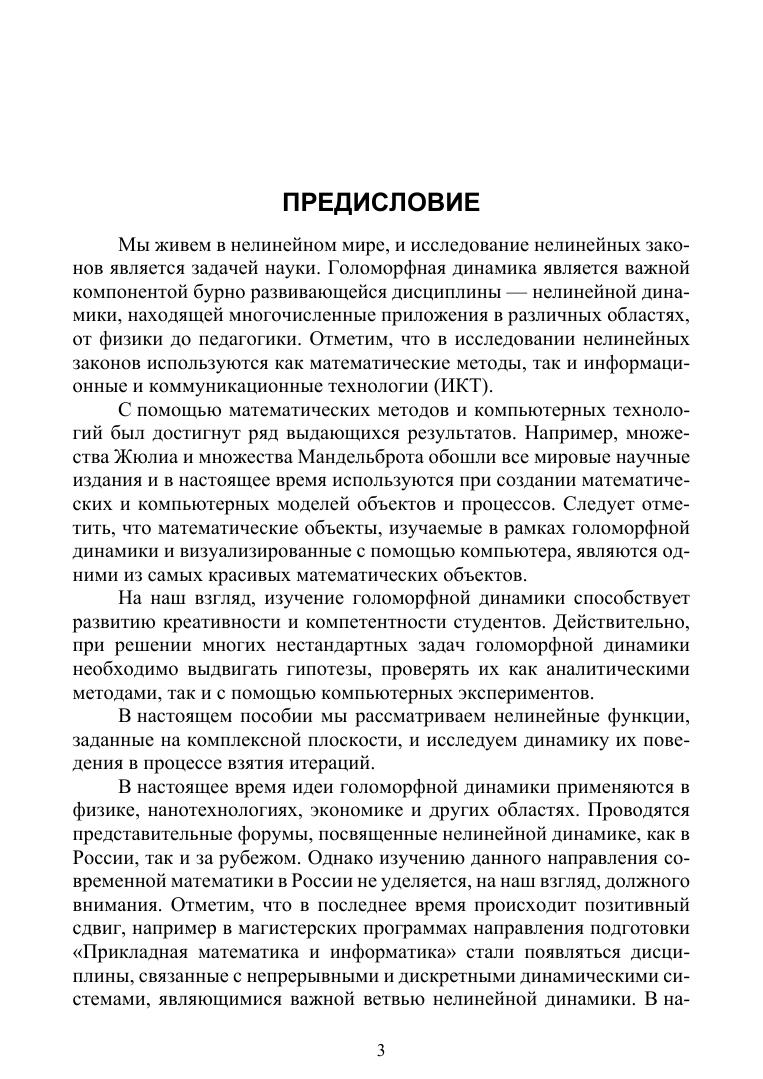 В учебном пособии рассмотрены вопросы, связанные с изучением элементов теории голоморфной динамики — важного раздела современной математики. Голоморфная динамика является компонентом дисциплины — нелинейной динамики. В пособии рассматривается изучение динамики итерированных функций комплексной переменной, исследуется структура неподвижных точек полиномов второй и третьей степеней. Изучаются множества Жюлиа и множества Мандельброта. Вводится понятие обрамления первого и второго порядков множества Мандельброта и исследуются их свойства.