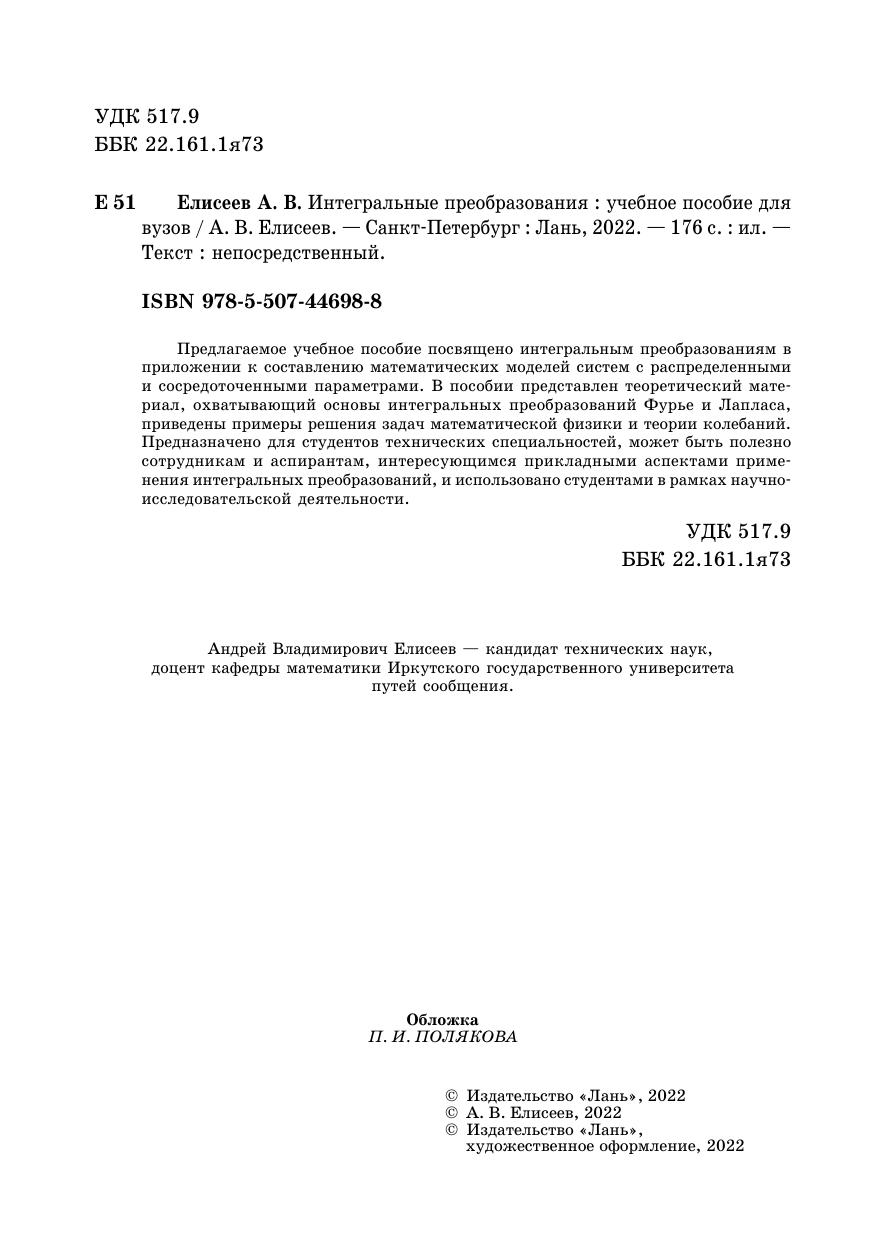 Предлагаемое учебное пособие посвящено интегральным преобразованиям в приложении к составлению математических моделей систем с распределенными и сосредоточенными параметрами. В пособии представлен теоретический материал, охватывающий основы интегральных преобразований Фурье и Лапласа, приведены примеры решения задач математической физики и теории колебаний. Предназначено для студентов технических специальностей, может быть полезно сотрудникам и аспирантам, интересующимся прикладными аспектами применения интегральных преобразований, и использовано студентами в рамках научно-исследовательской деятельности.