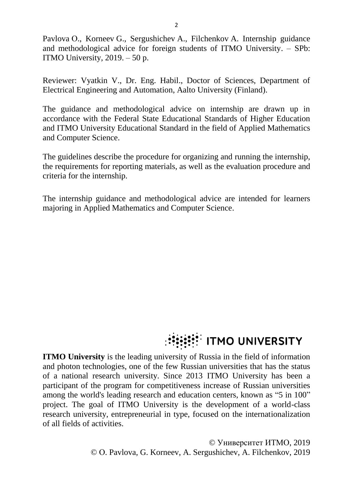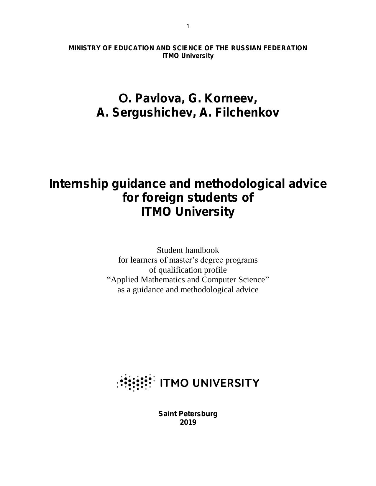 The guidance and methodological advice on internship are drawn up in accordance with the Federal State Educational Standards of Higher Education and ITMO University Educational Standard in the field of Applied Mathematics and Computer Science