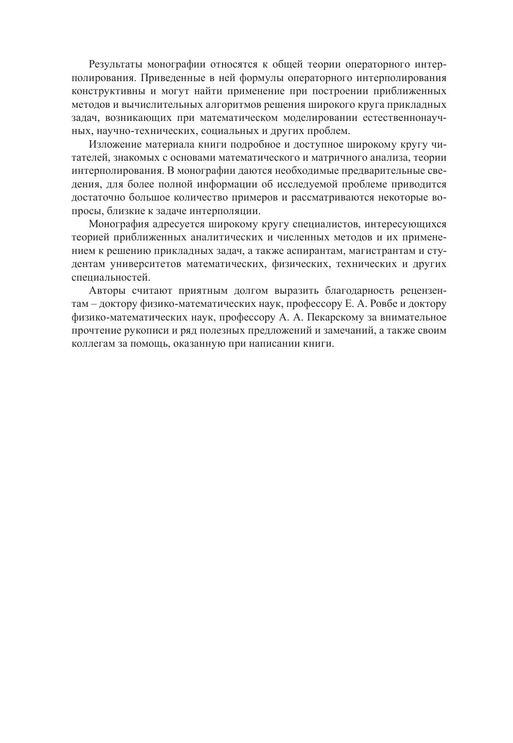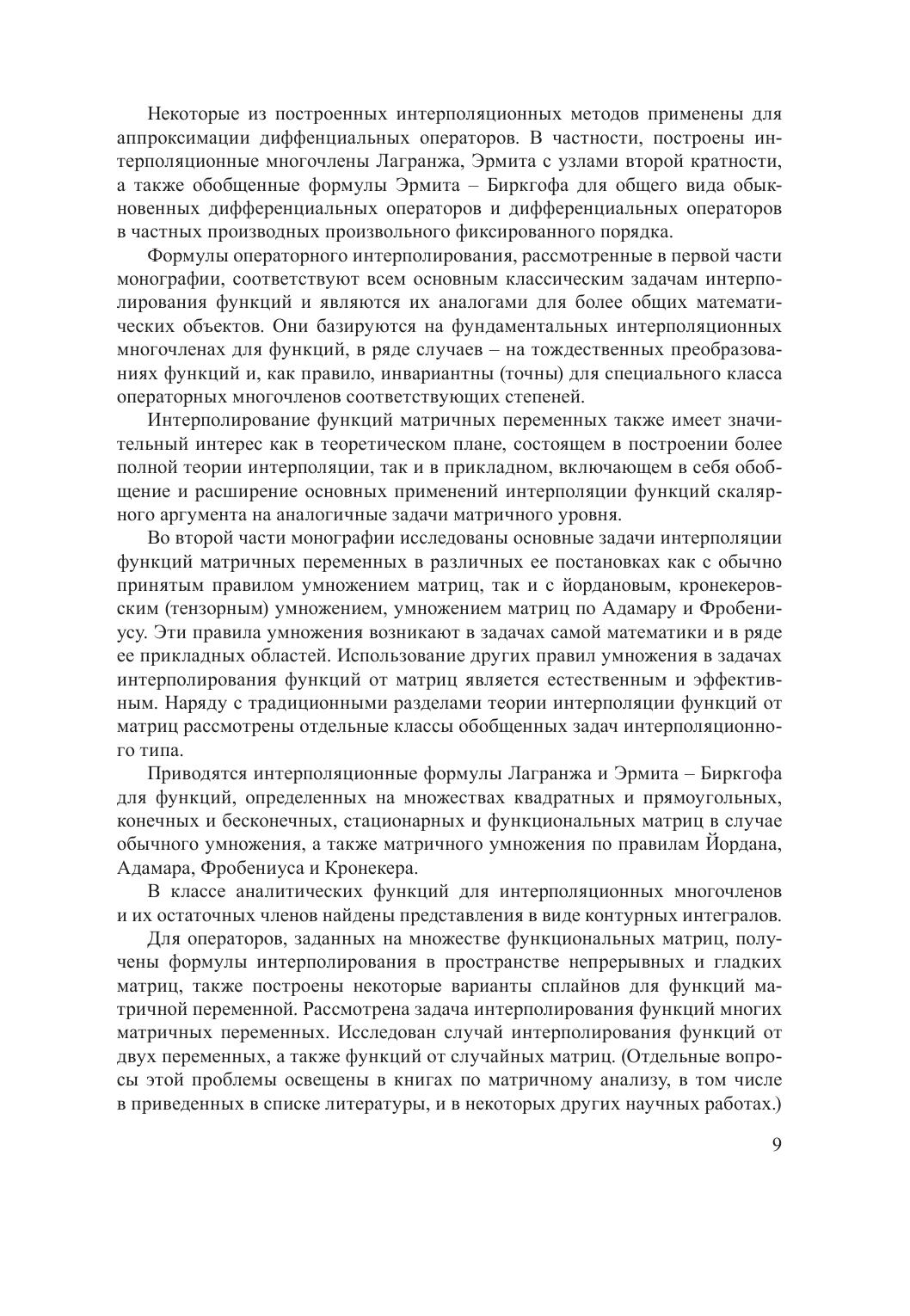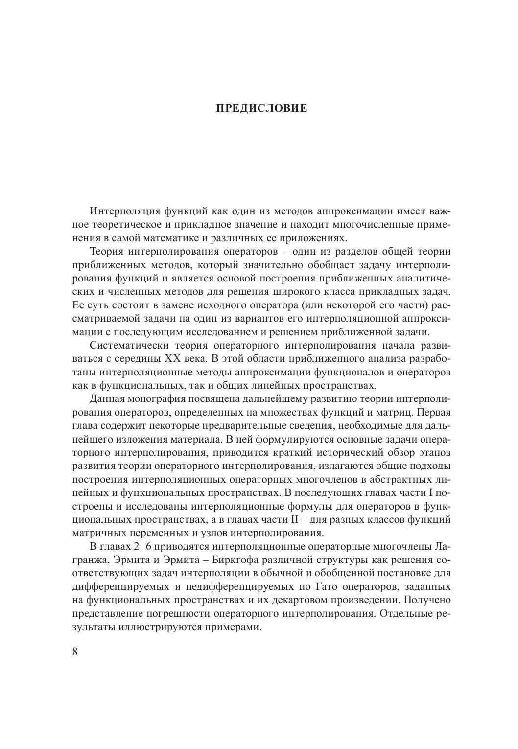 Монография посвящена интерполированию операторов, заданных соответственно на множествах функций и матриц. Приводятся интерполяционные операторные многочлены типа Лагранжа, Эрмита и Эрмита – Биркгофа различной структуры как решения соответствующих задач интерполирования в обычной и обобщенной постановке для операторов в функциональных пространствах, а также на множествах квадратных, прямоугольных и бесконечных матриц с обычным умножением, матричным умножением по Йордану, Адамару, Фробениусу, Кронекеру, а также умножением, заданным с помощью дискретной свертки Лапласа. Построены аналоги интерполяционных сплайнов для функций матричной переменной. Получено явное представление погрешности интерполирования. Для большинства интерполяционных формул указаны классы операторных многочленов, инвариантных относительно построенных интерполяционных формул.