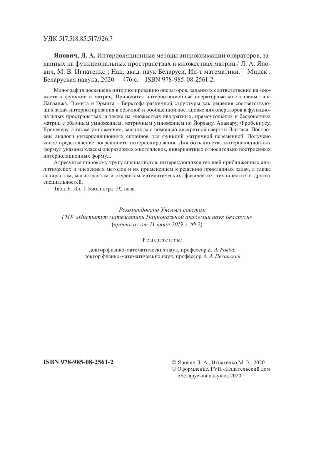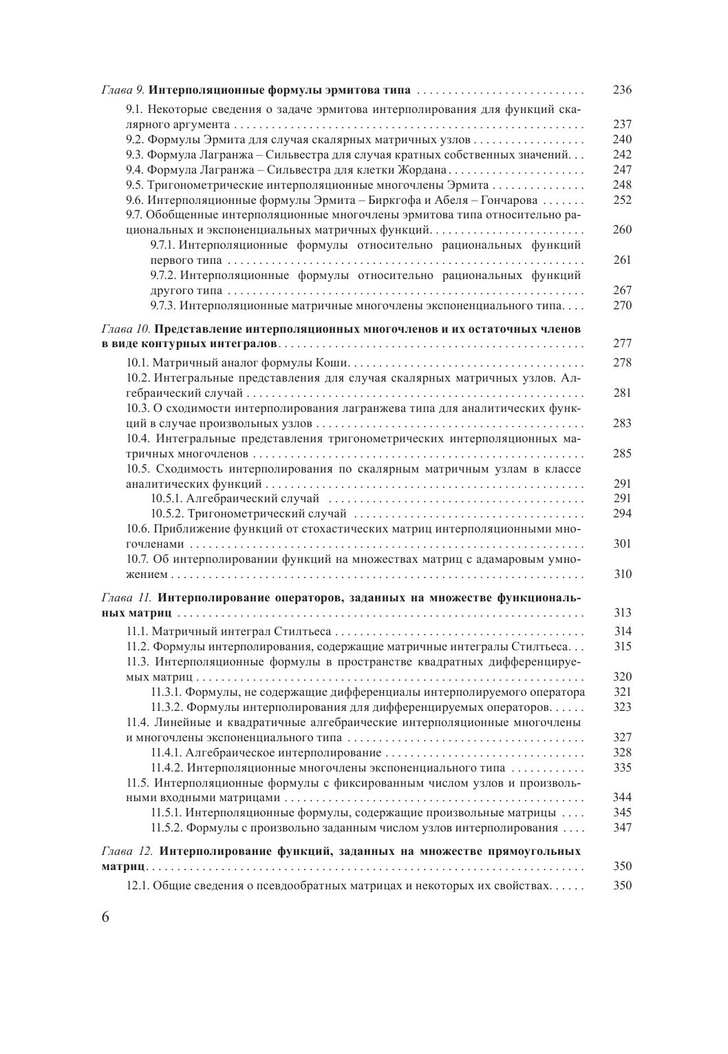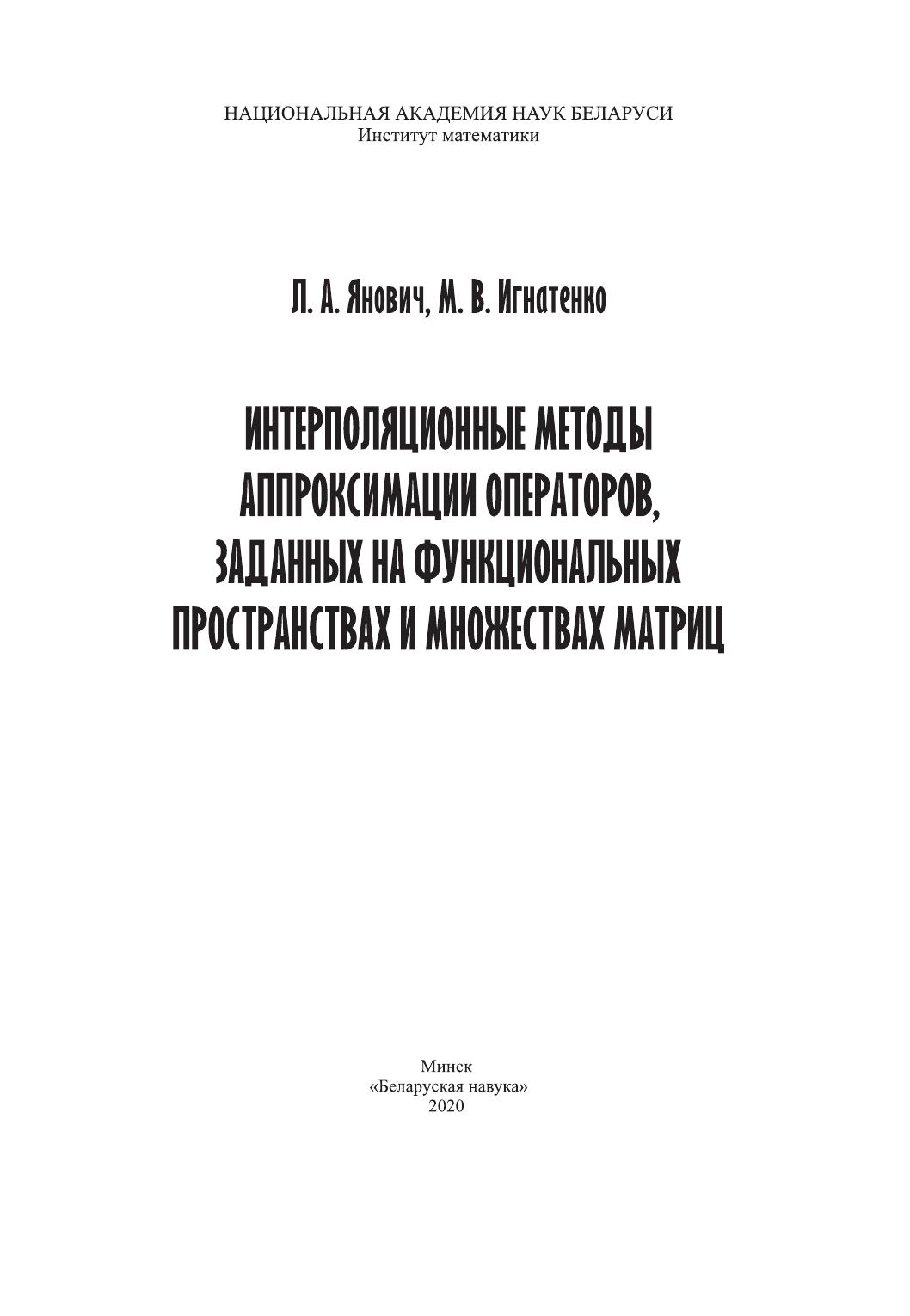 Монография посвящена интерполированию операторов, заданных соответственно на множествах функций и матриц. Приводятся интерполяционные операторные многочлены типа Лагранжа, Эрмита и Эрмита – Биркгофа различной структуры как решения соответствующих задач интерполирования в обычной и обобщенной постановке для операторов в функциональных пространствах, а также на множествах квадратных, прямоугольных и бесконечных матриц с обычным умножением, матричным умножением по Йордану, Адамару, Фробениусу, Кронекеру, а также умножением, заданным с помощью дискретной свертки Лапласа. Построены аналоги интерполяционных сплайнов для функций матричной переменной. Получено явное представление погрешности интерполирования. Для большинства интерполяционных формул указаны классы операторных многочленов, инвариантных относительно построенных интерполяционных формул.