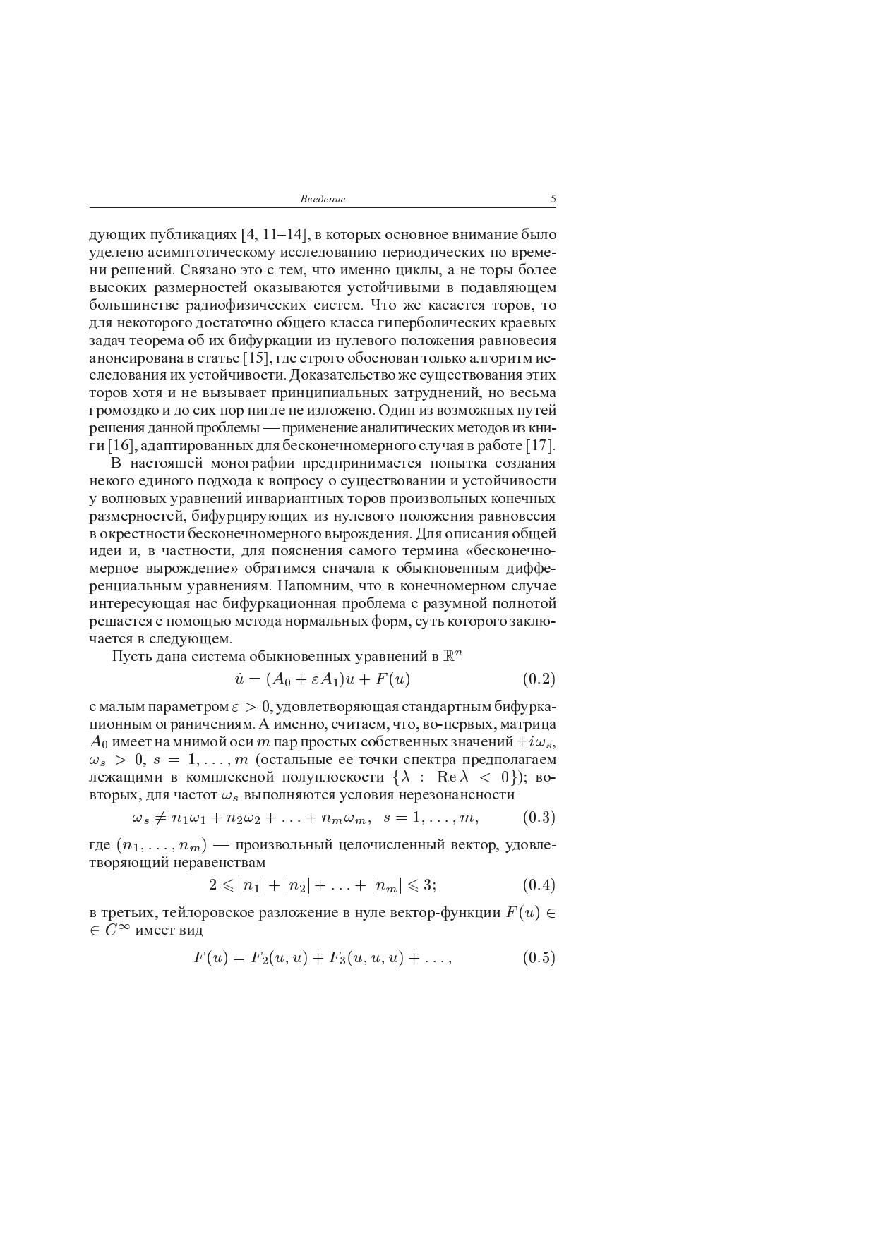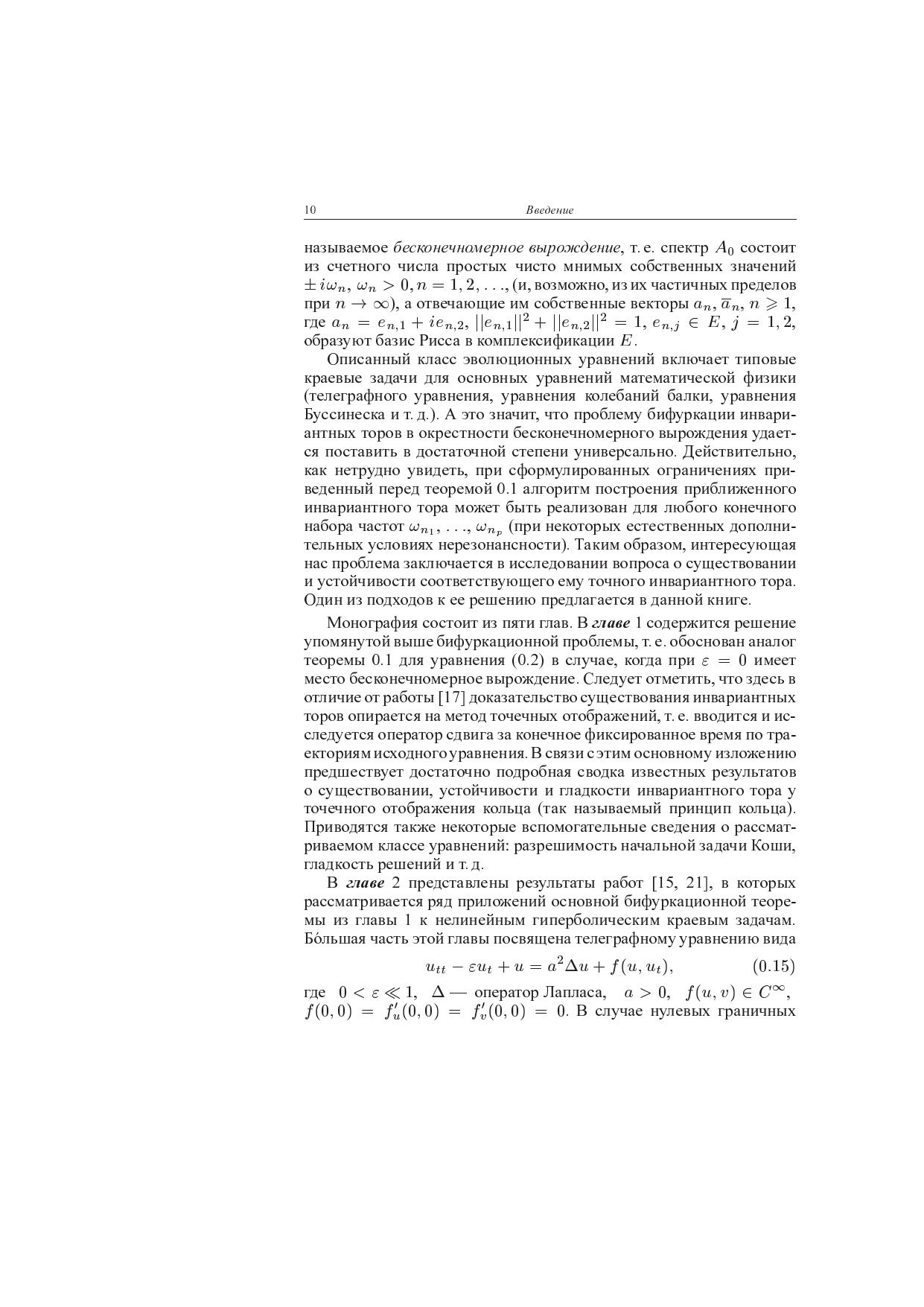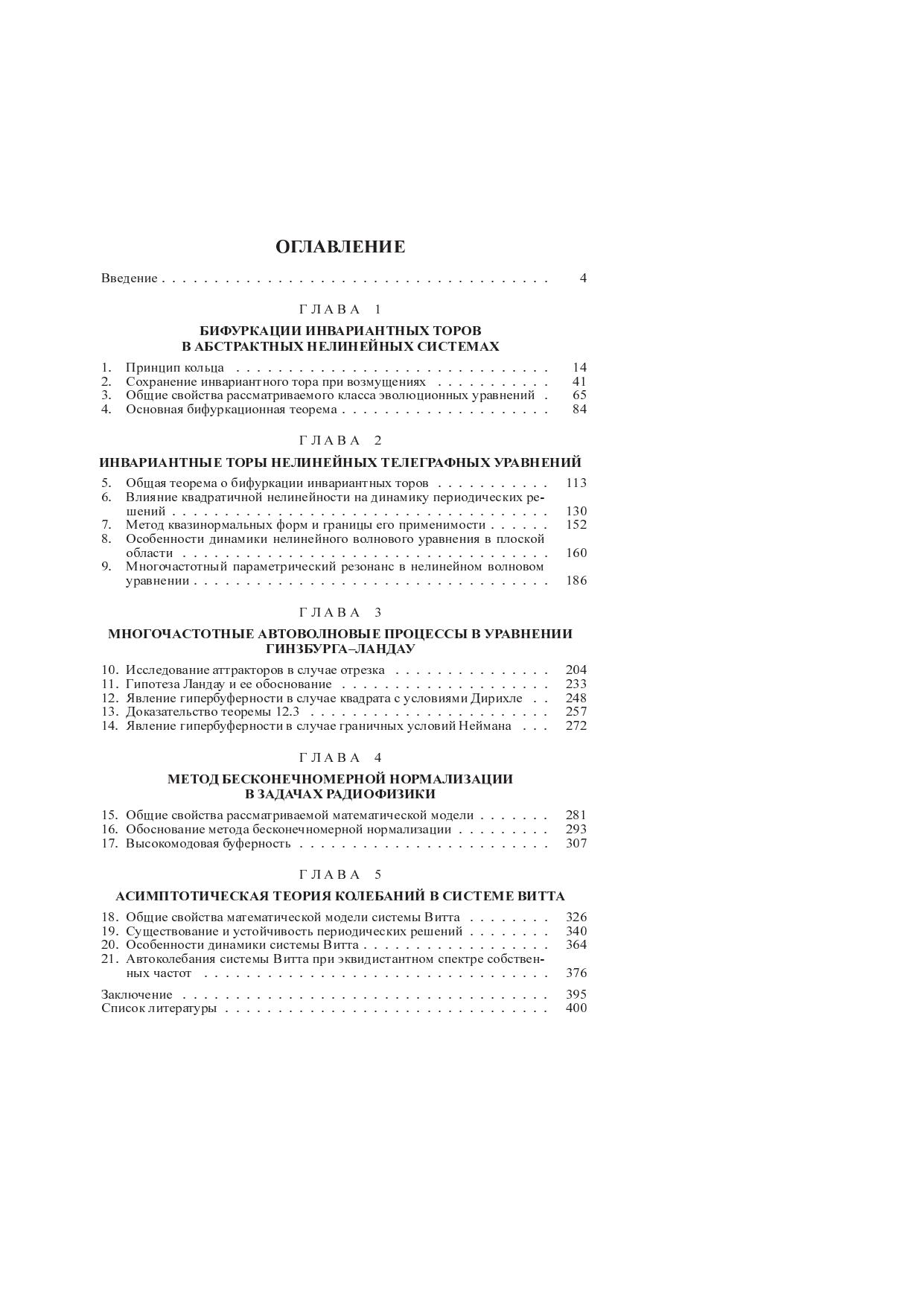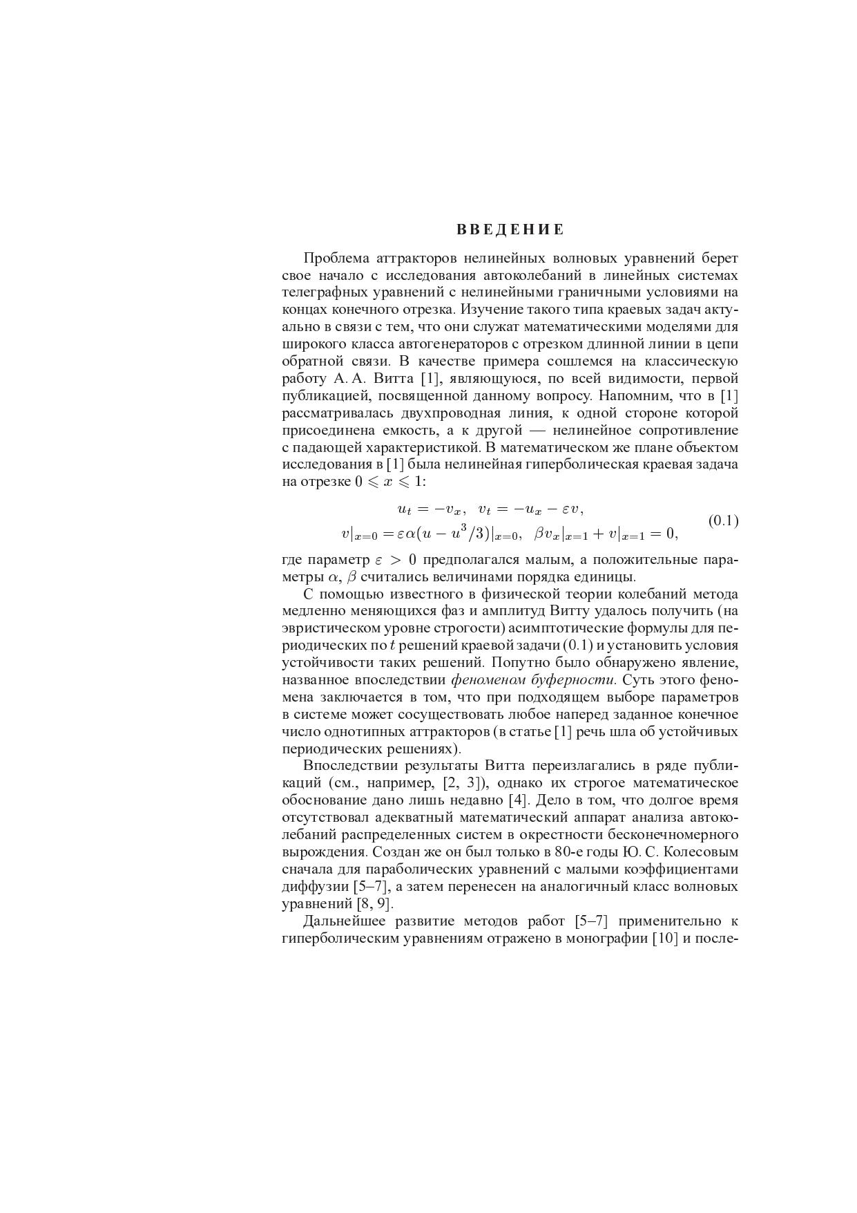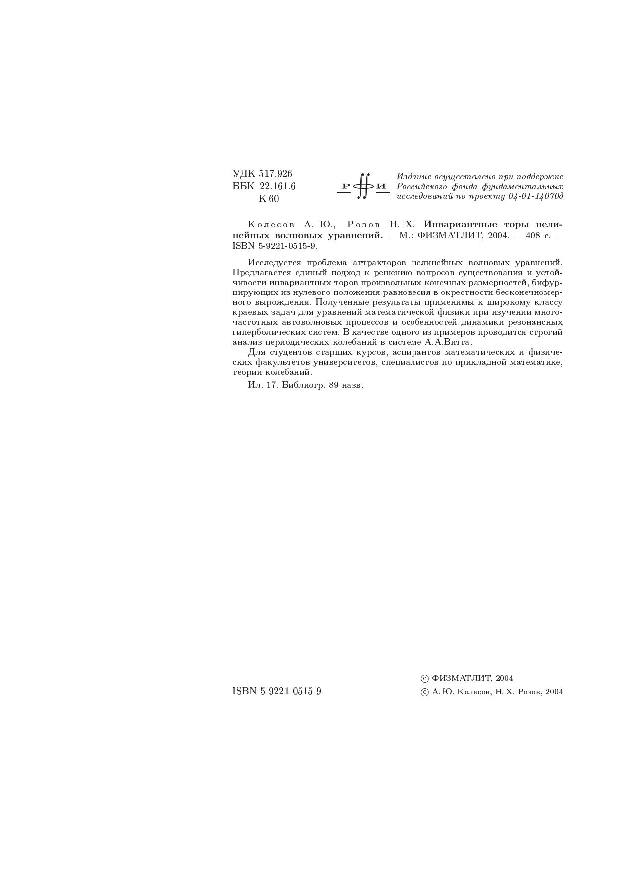 Исследуется проблема аттракторов нелинейных волновых уравнений. Предлагается единый подход к решению вопросов существования и устойчивости инвариантных торов произвольных конечных размерностей, бифурцирующих из нулевого положения равновесия в окрестности бесконечномерного вырождения. Полученные результаты применимы к широкому классу краевых задач для уравнений математической физики при изучении многочастотных автоволновых процессов и особенностей динамики резонансных гиперболических систем. В качестве одного из примеров проводится строгий анализ периодических колебаний в системе А.А.Витта. Для студентов старших курсов, аспирантов математических и физических факультетов университетов, специалистов по прикладной математике, теории колебаний.