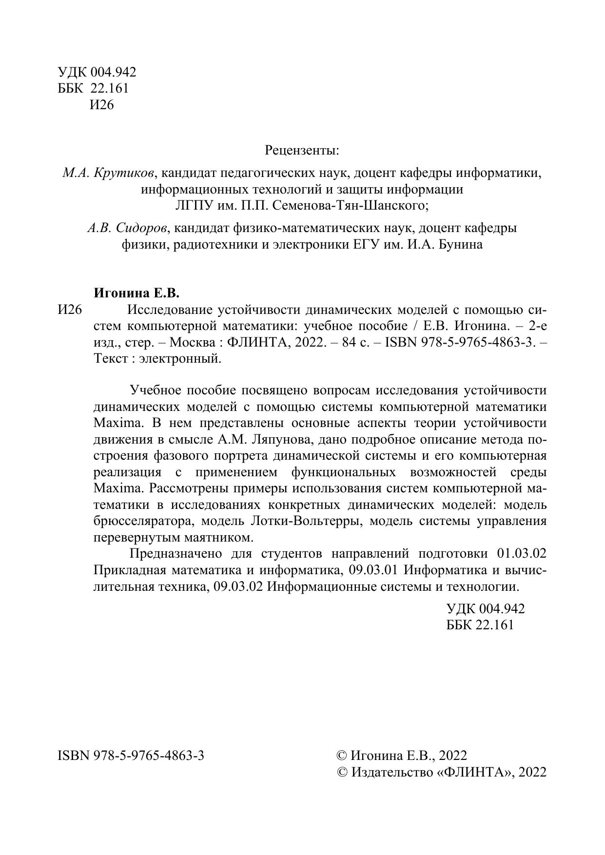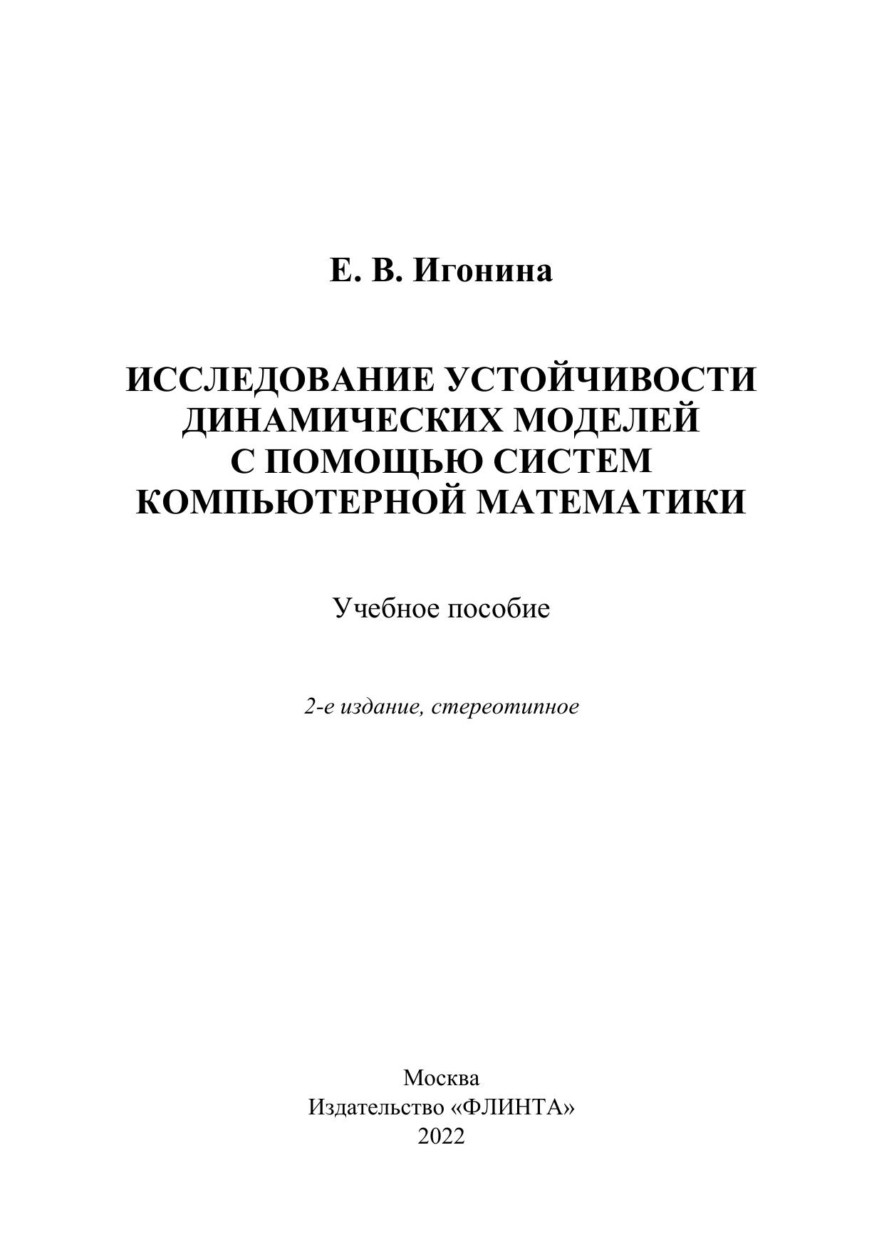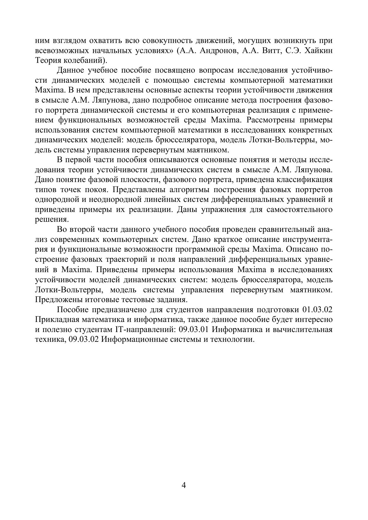 Учебное пособие посвящено вопросам исследования устойчивости динамических моделей с помощью системы компьютерной математики Maxima. В нем представлены основные аспекты теории устойчивости движения в смысле А.М. Ляпунова, дано подробное описание метода построения фазового портрета динамической системы и его компьютерная реализация с применением функциональных возможностей среды Maxima. Рассмотрены примеры использования систем компьютерной математики в исследованиях конкретных динамических моделей: модель брюсселяратора, модель Лотки-Вольтерры, модель системы управления перевернутым маятником.
