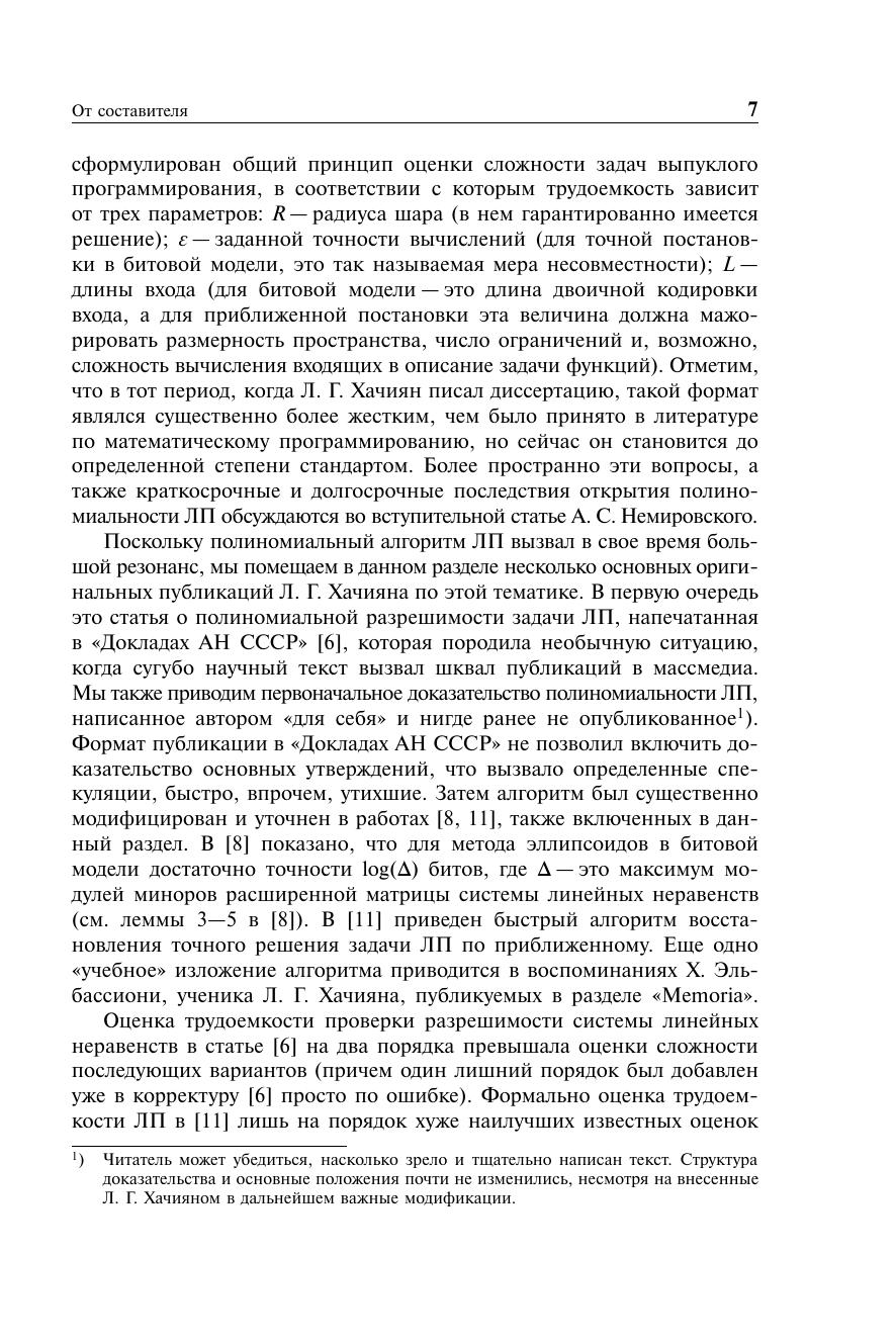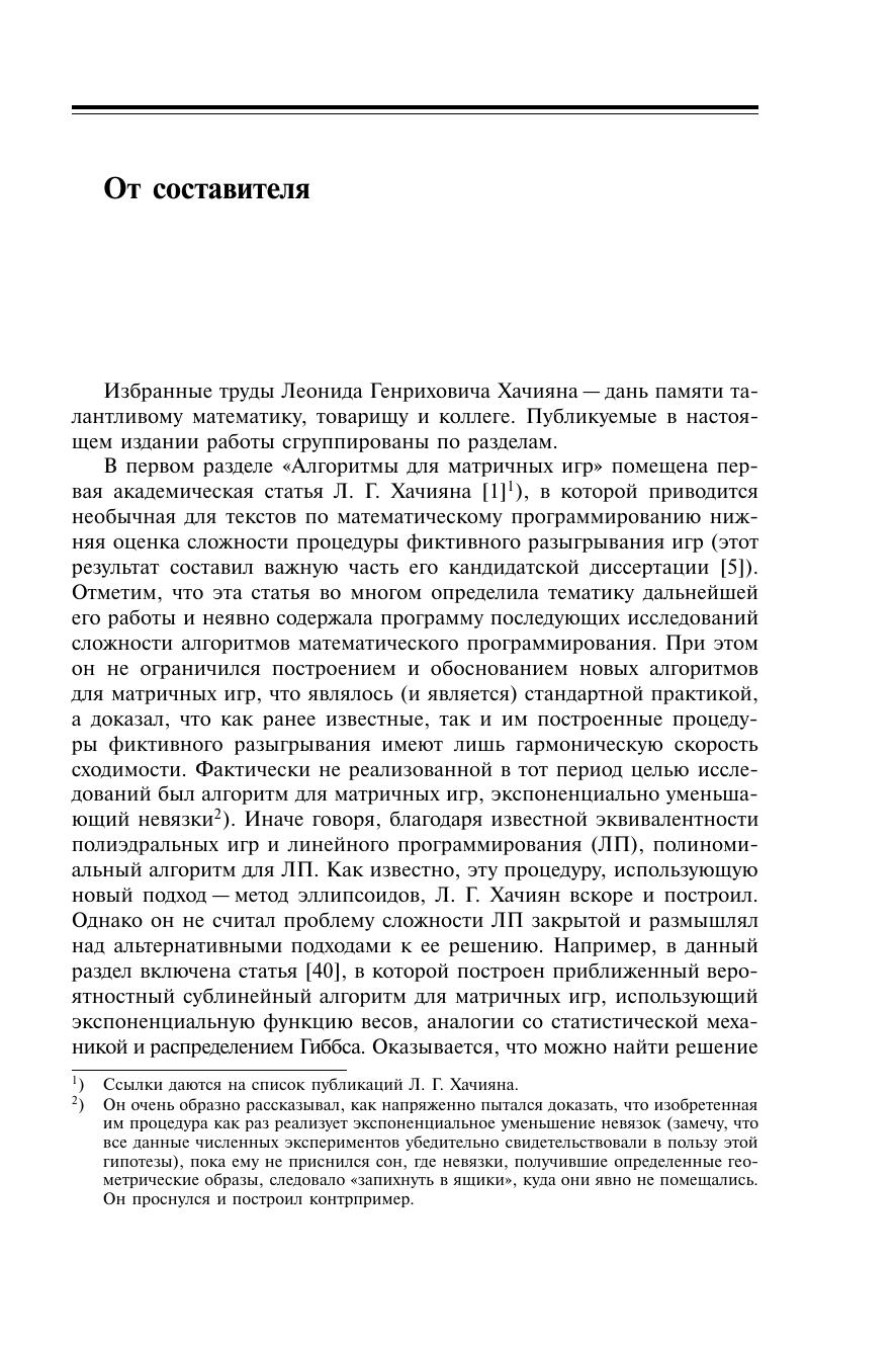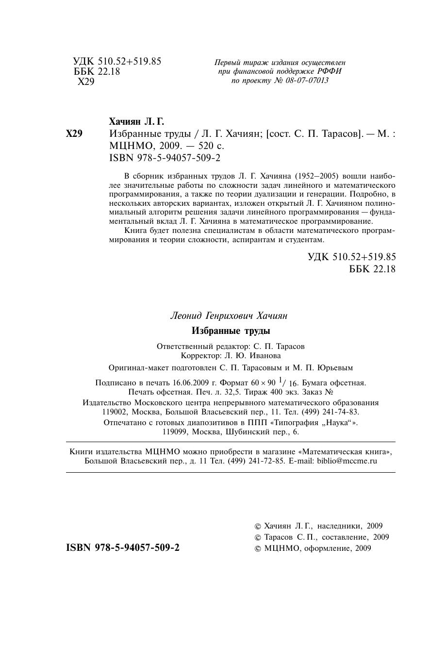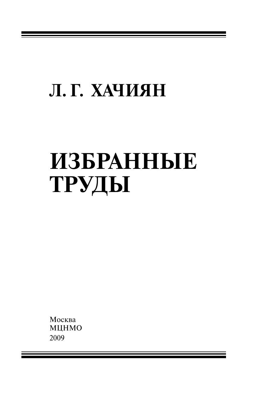 В сборник избранных трудов Л. Г. Хачияна (1952–2005) вошли наиболее значительные работы по сложности задач линейного и математического программирования, а также по теории дуализации и генерации. Подробно, в нескольких авторских вариантах, изложен открытый Л. Г. Хачияном полиномиальный алгоритм решения задачи линейного программирования — фундаментальный вклад Л. Г. Хачияна в математическое программирование.Книга будет полезна специалистам в области математического программирования и теории сложности, аспирантам и студентам.