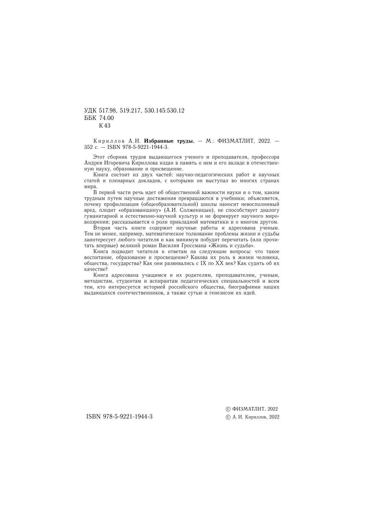 Этот сборник трудов выдающегосяученого и преподавателя, профессора Андрея Игоревича Кириллова издан в память о нем и его вкладе в отечественную науку, образование и просвещение. Книга состоит из двух частей: научно-педагогических работ и научных статей и пленарных докладов, с которыми он выступал во многих странах мира. В первой части речь идет об общественной важности науки и о том, каким трудным путем научные достиженияпревращаютсяв учебники; объясняется,
