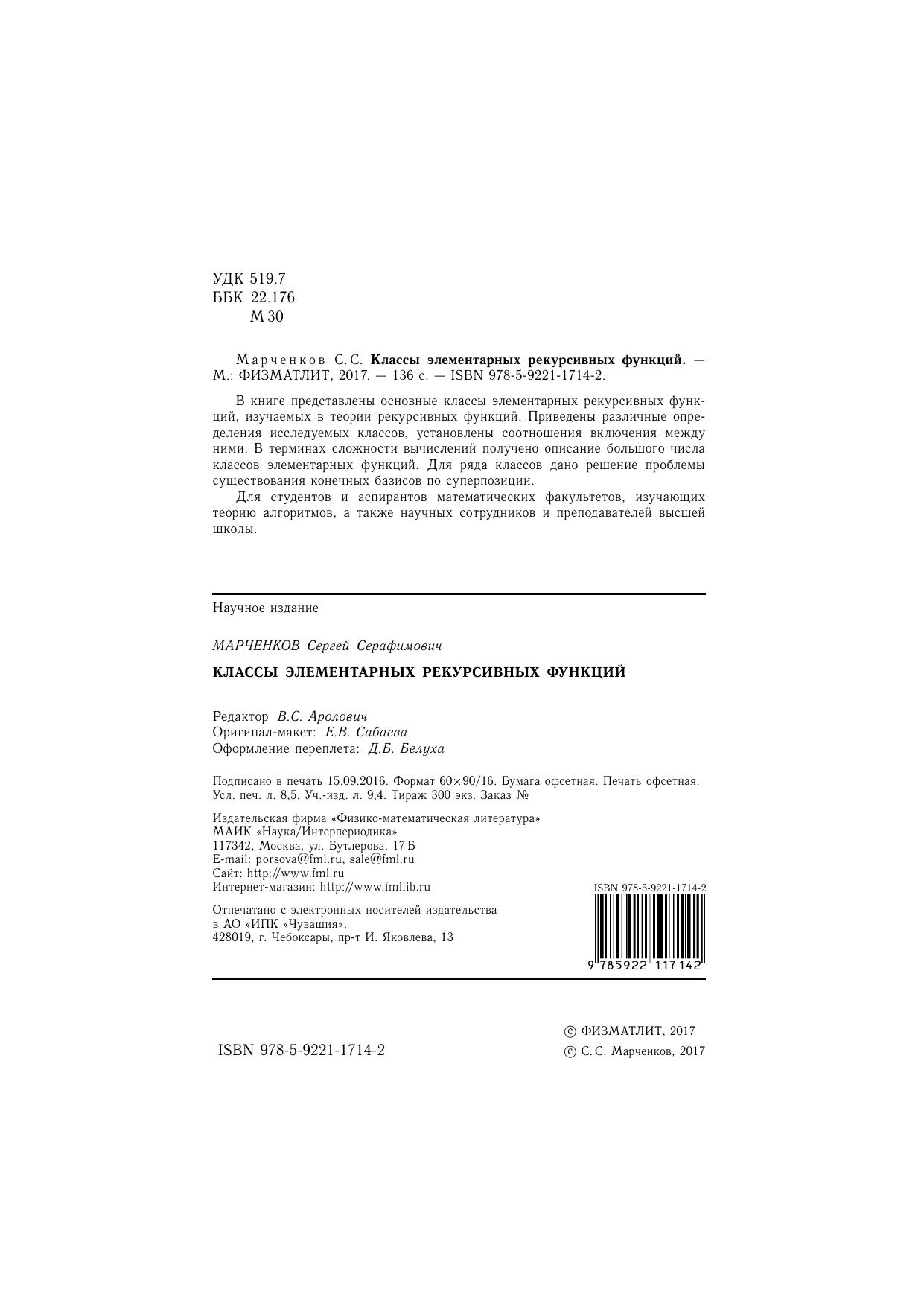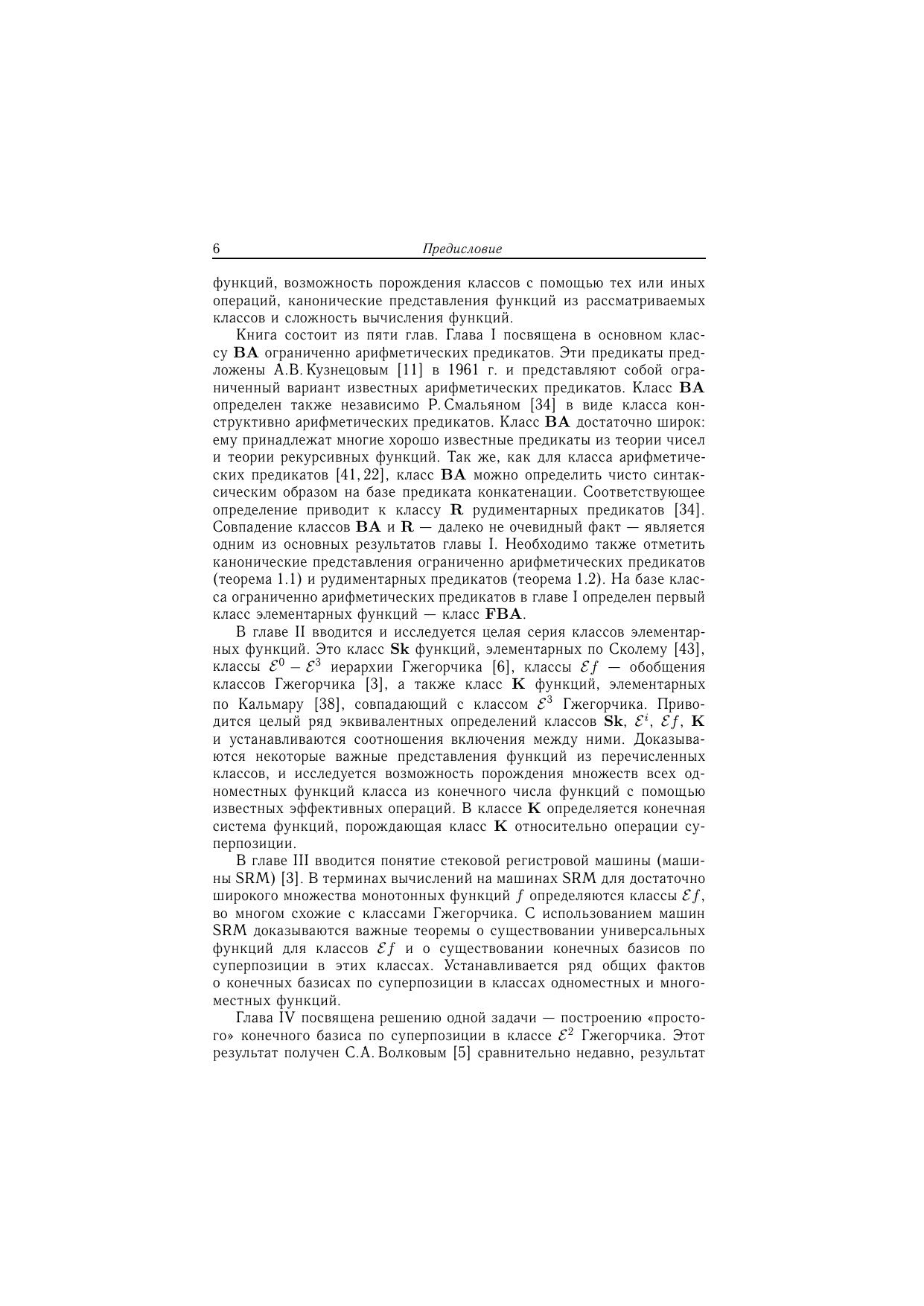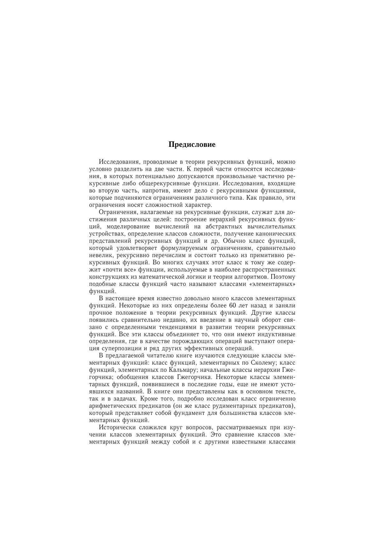 В книге представлены основные классы элементарных рекурсивных функций, изучаемых в теории рекурсивных функций. Приведены различные определения исследуемых классов, установлены соотношения включения между ними. В терминах сложности вычислений получено описание большого числа классов элементарных функций. Для ряда классов дано решение проблемы существования конечных базисов по суперпозиции. Для студентов и аспирантов математических факультетов, изучающих теорию алгоритмов, а также научных сотрудников и преподавателей высшей школы.