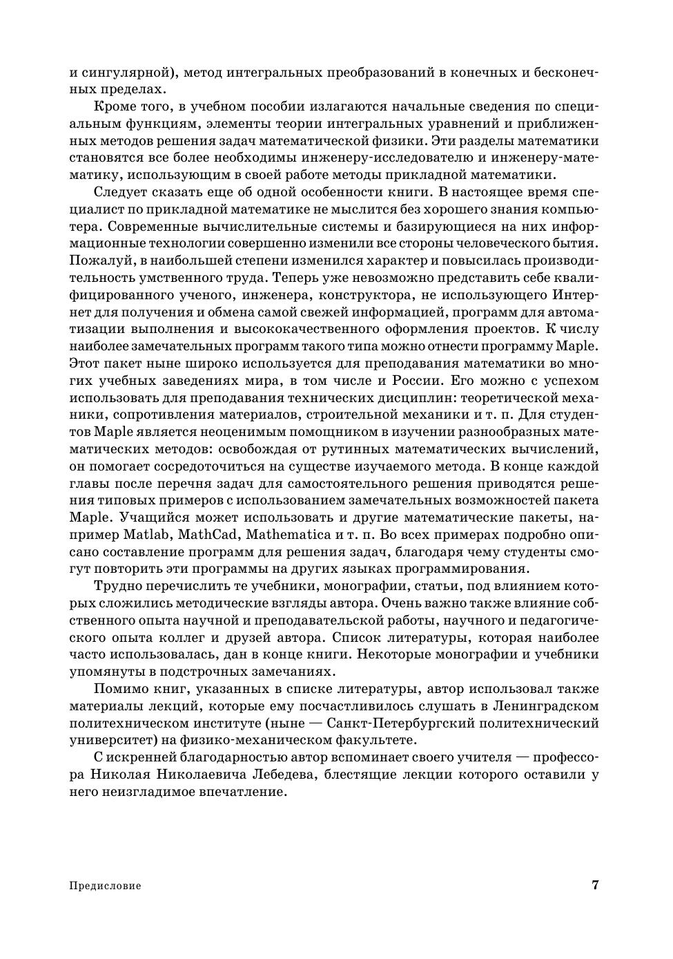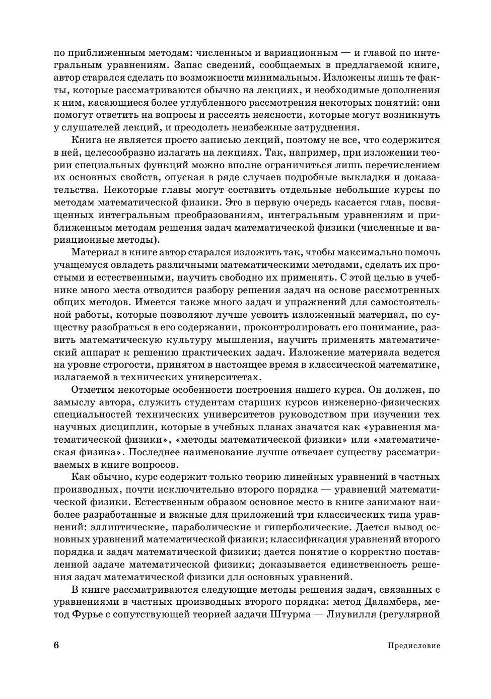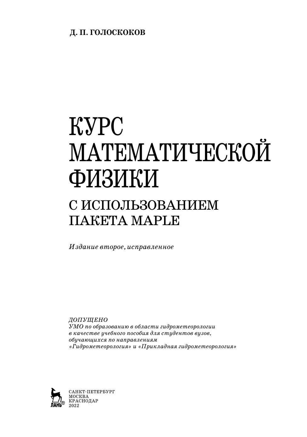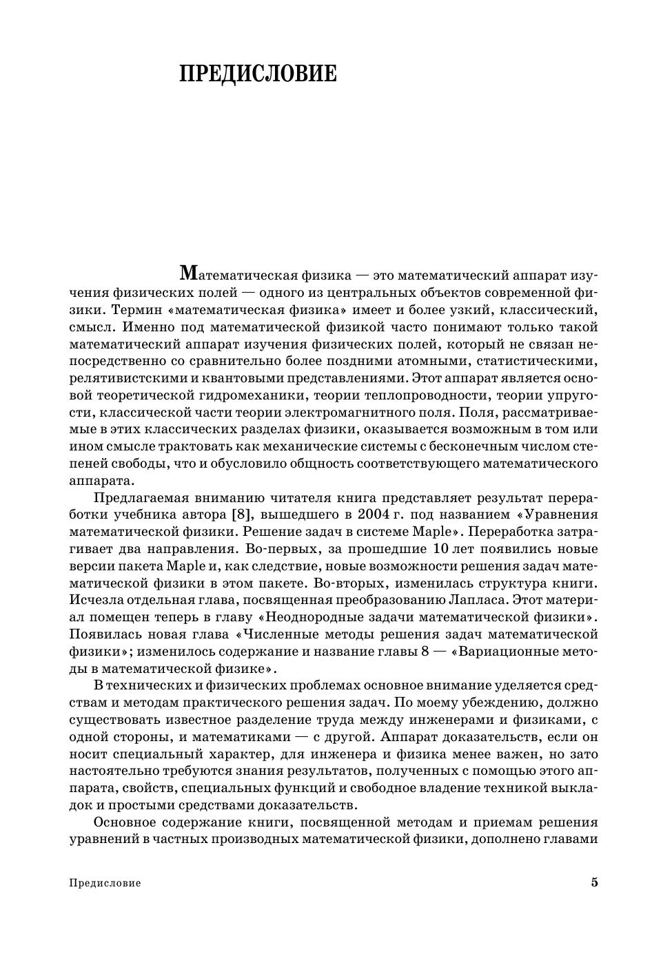 В учебном пособии рассмотрены классические методы интегрирования дифференциальных уравнений в частных производных второго порядка, метод интегральных преобразований в конечных и бесконечных пределах, элементы теории интегральных уравнений, а также приближенные методы решения задач математической физики (вариационные методы и метод сеток). Основное внимание деляется конструктивным методам, с помощью которых можно построить явное решение задачи. Изложение иллюстрируется большим количеством подробно разобранных примеров и задач. Особенностью учебного курса является широкое использование системы аналитических вычислений Maple при решении учебных задач математической физики. В конце глав приводится значительное количество задач для самостоятельного решения и примеры решения задач в Maple с текстами программ, что делает это учебное пособие пригодным для практических и лабораторных занятий по математической физике. Учебное пособие может быть рекомендовано студентам, обучающимся по направлениям «Прикладная математика и информатика» и другим физико математическим и инженерно техническим направлениям технических университетов.