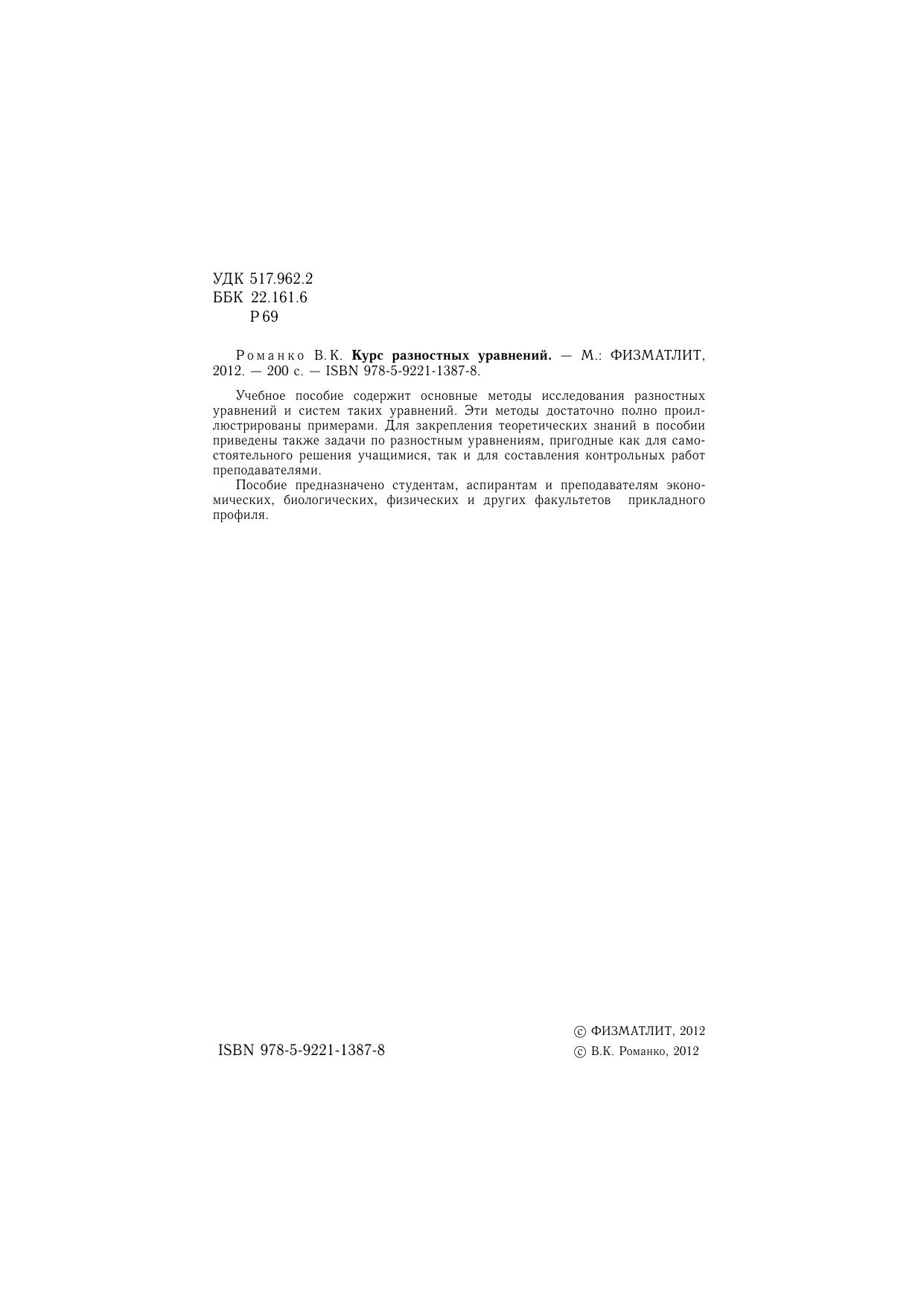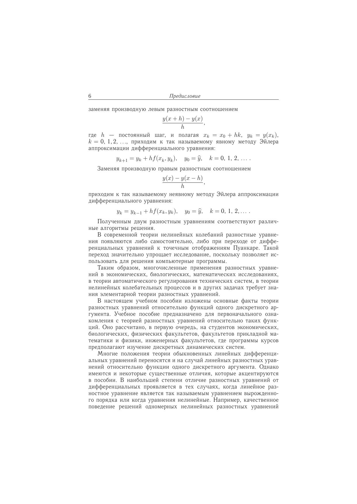 Учебное пособие содержит основные методы исследования разностных уравнений и систем таких уравнений. Эти методы достаточно полно проиллюстрированы примерами. Для закрепления теоретических знаний в пособии приведены также задачи по разностным уравнениям, пригодные как для самостоятельного решения учащимися, так и для составления контрольных работ преподавателями. Пособие предназначено студентам, аспирантам и преподавателям экономических, биологических, физических и других факультетов прикладного профиля.