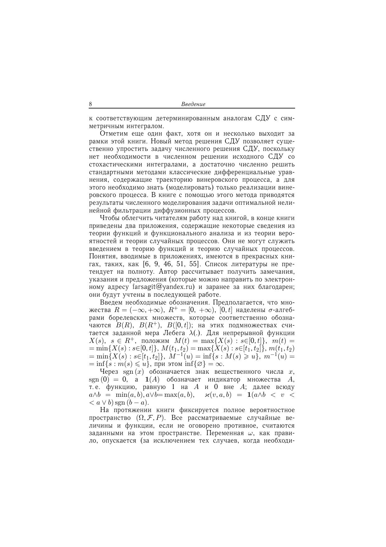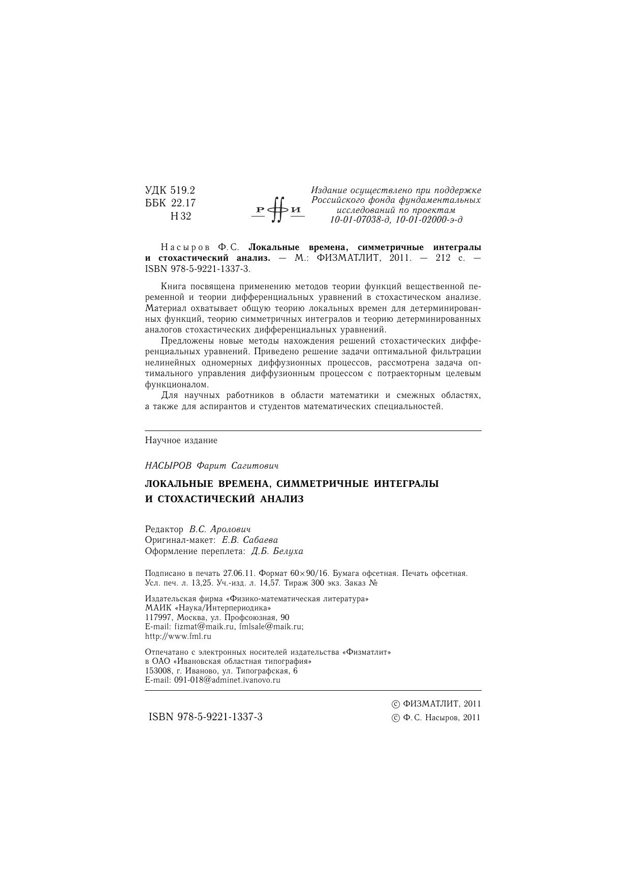 Книга посвящена применению методов теории функций вещественной переменной и теории дифференциальных уравнений в стохастическом анализе. Материал охватывает общую теорию локальных времен для детерминированных функций, теорию симметричных интегралов и теорию детерминированных аналогов стохастических дифференциальных уравнений. Предложены новые методы нахождения решений стохастических дифференциальных уравнений. Приведено решение задачи оптимальной фильтрации нелинейных одномерных диффузионных процессов, рассмотрена задача оптимального управления диффузионным процессом с потраекторным целевым функционалом. Для научных работников в области математики и смежных областях, а также для аспирантов и студентов математических специальностей.