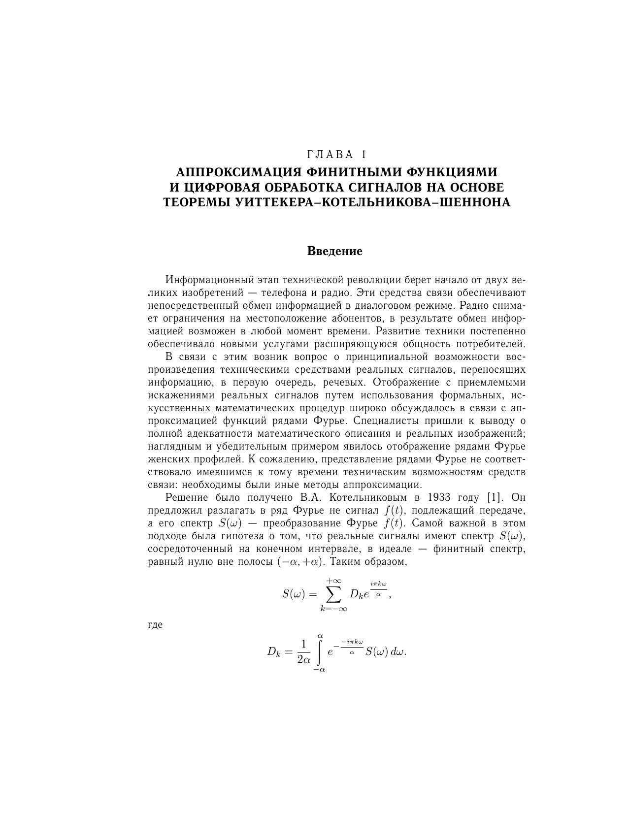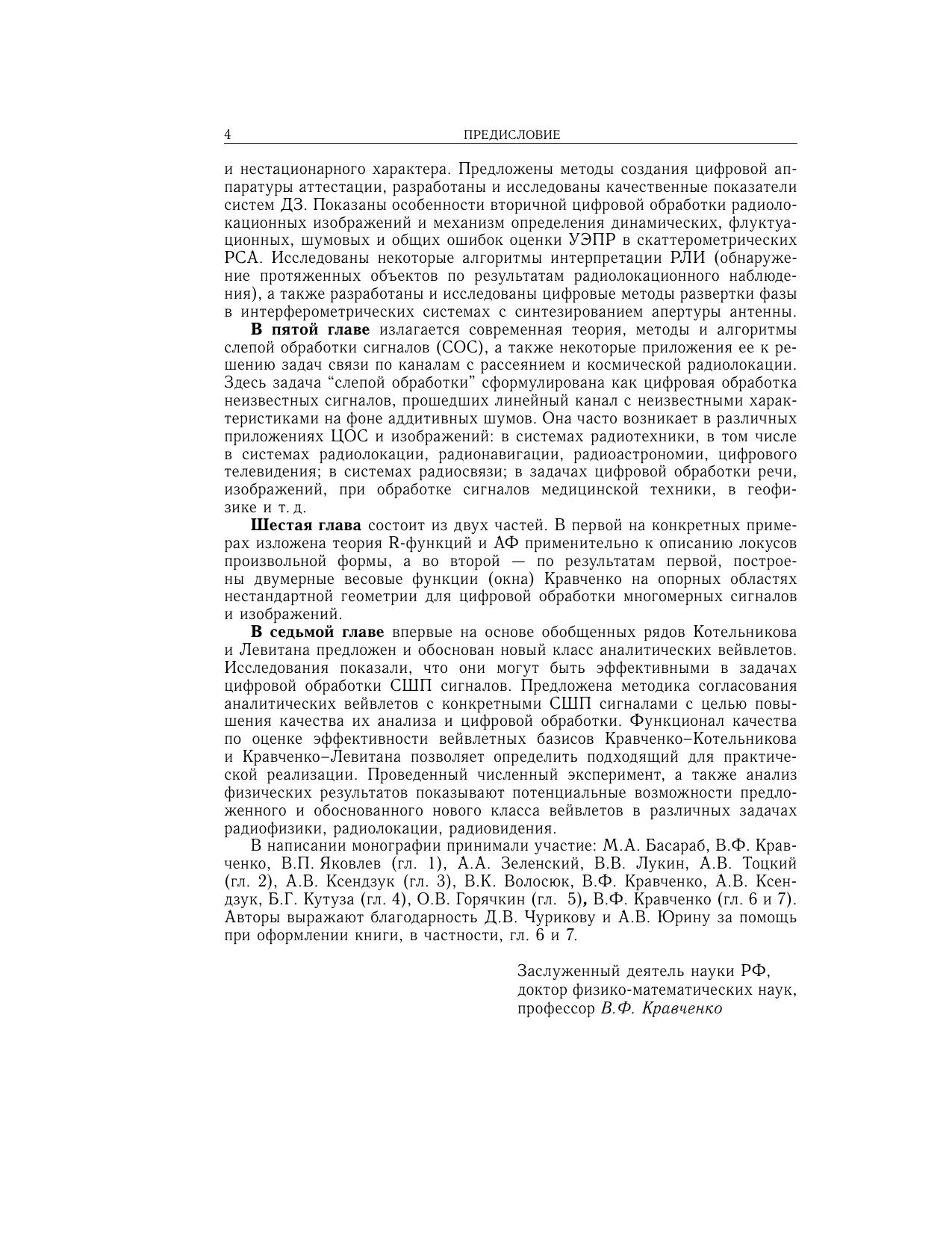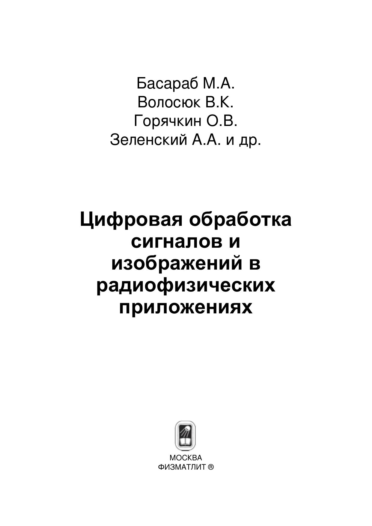 В монографии изложены новые перспективные направления цифровой обработки сигналов применительно к задачам радиофизики и радиотехники. Монография состоит из семи глав. В первой главе рассмотрены и обоснованы новые методы аппроксимации сигналов с помощью финитных функций, включая новый класс атомарных функций, на основе теоремы Уиттекера-Котельникова-Шеннона. Во второй главе рассмотрено использование биспектрального анализа в цифровой обработке сигналов. Третья глава посвящена многопозиционным радиолокационным системам с синтезированием апертуры антенн. В четвертой главе рассмотрены некоторые аспекты цифровой обработки сигналов в обзорных РЛС и РСА. Разработке алгоритмов для слепой обработки сигналов посвящена пятая глава. Шестая глава состоит из двух частей. В первой изложена теория R-функций и атомарных функций (АФ) применительно к описанию локусов произвольной формы, а во второй по результатам первой построены двумерные весовые функции (окна) Кравченко на опорных областях нестандартной геометрии для цифровой обработки многомерных сигналов и изображений. В седьмой главе впервые на основе обобщенных рядов Котельникова и Левитана предложен и обоснован новый класс аналитических вейвлетов. Численный эксперимент и анализ физических результатов показывают потенциальные возможности предложенного и обоснованного нового класса вейвлетов в различных задачах радиофизики, радиолокации, радиовидения. Для научных работников, аспирантов и студентов старших курсов радиофизических и радиотехнических специальностей, а также для специалистов, работающих в области вычислительной математики и физики.