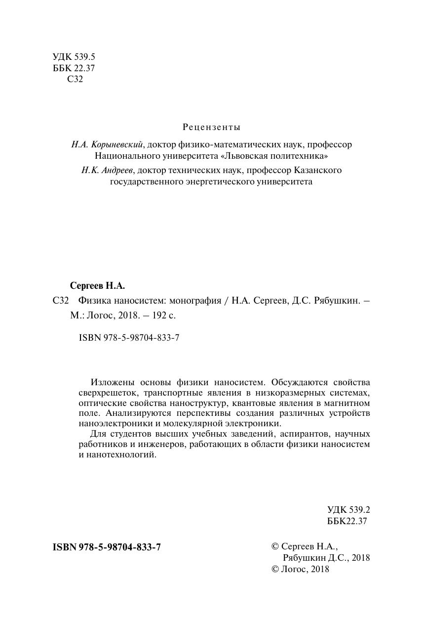 Изложены основы физики наносистем. Обсуждаются свойства сверхрешеток, транспортные явления в низкоразмерных системах, оптические свойства наноструктур, квантовые явления в магнитном поле. Анализируются перспективы создания различных устройств наноэлектроники и молекулярной электроники. Для студентов высших учебных заведений, аспирантов, научных работников и инженеров, работающих в области физики наносистем и нанотехнологий.