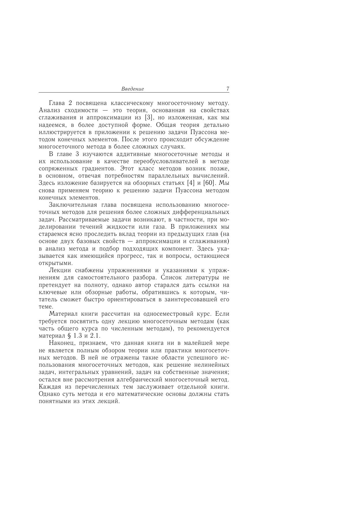 Лекции вводят в многосеточные методы и их приложения к численному решению задач математической физики. Изучается геометрический многосеточный метод, включающий классические V- и W-циклы, и аддитивный многосеточный метод. Сначала теория применяется к простому примеру задачи Пуассона. Далее в лекциях рассматриваются более сложные дифференциальные задачи. Основным методом дискретизации служит метод конечных элементов. Теория иллюстрируется численными примерами и упражнениями. Книга дополняет стандартные учебники по численным методам и рассчитана на студентов старших курсов и аспирантов. Может служить учебным пособием к практикуму по численным методам и основой для дополнительного курса. Материалы лекций будут полезны для исследователей в области численного анализа.