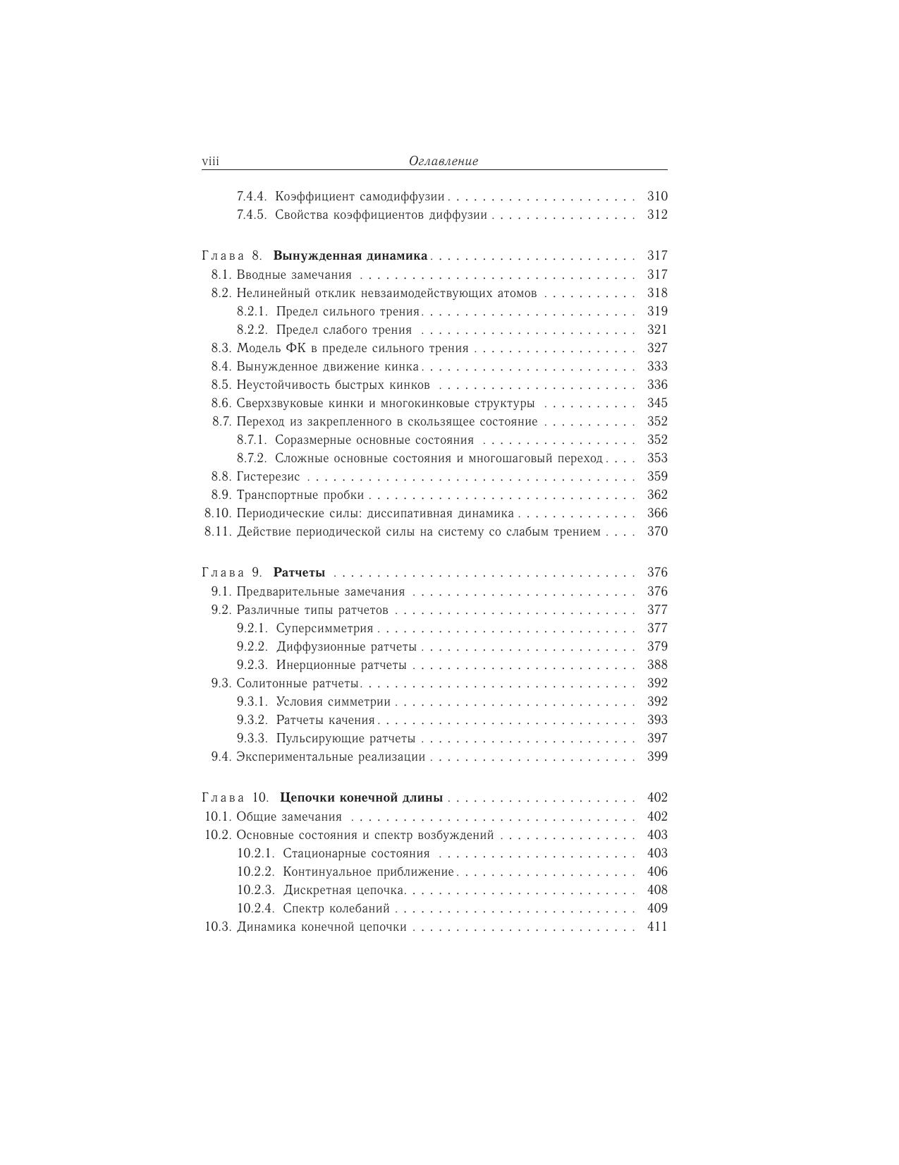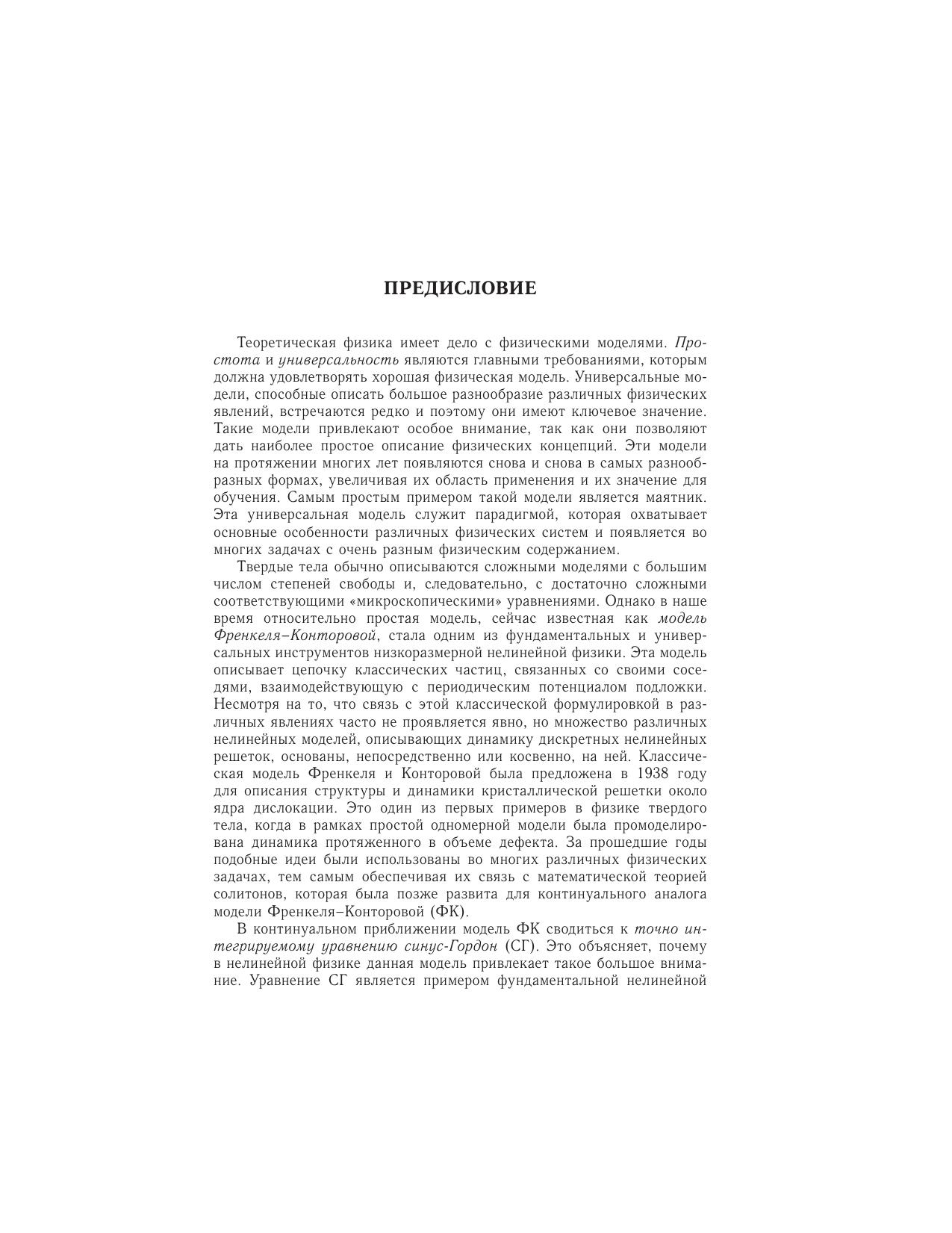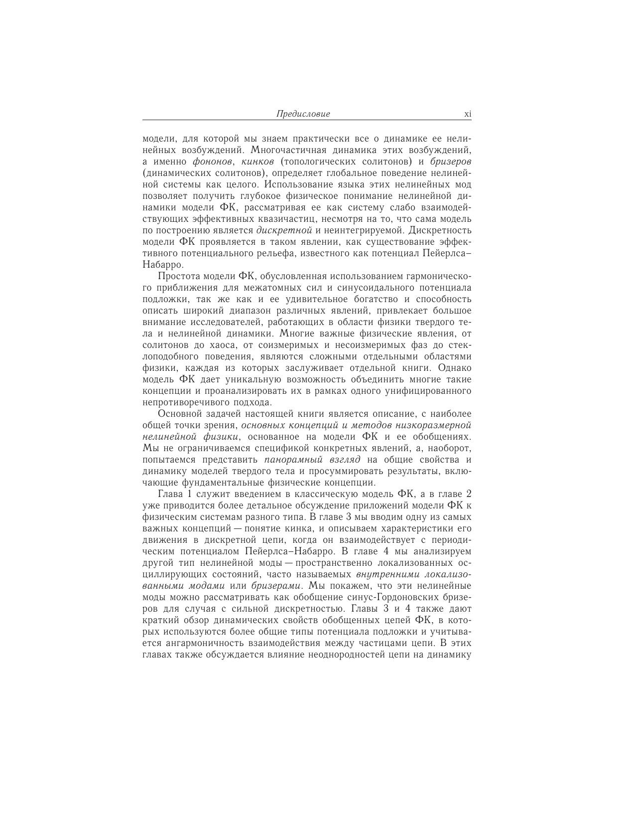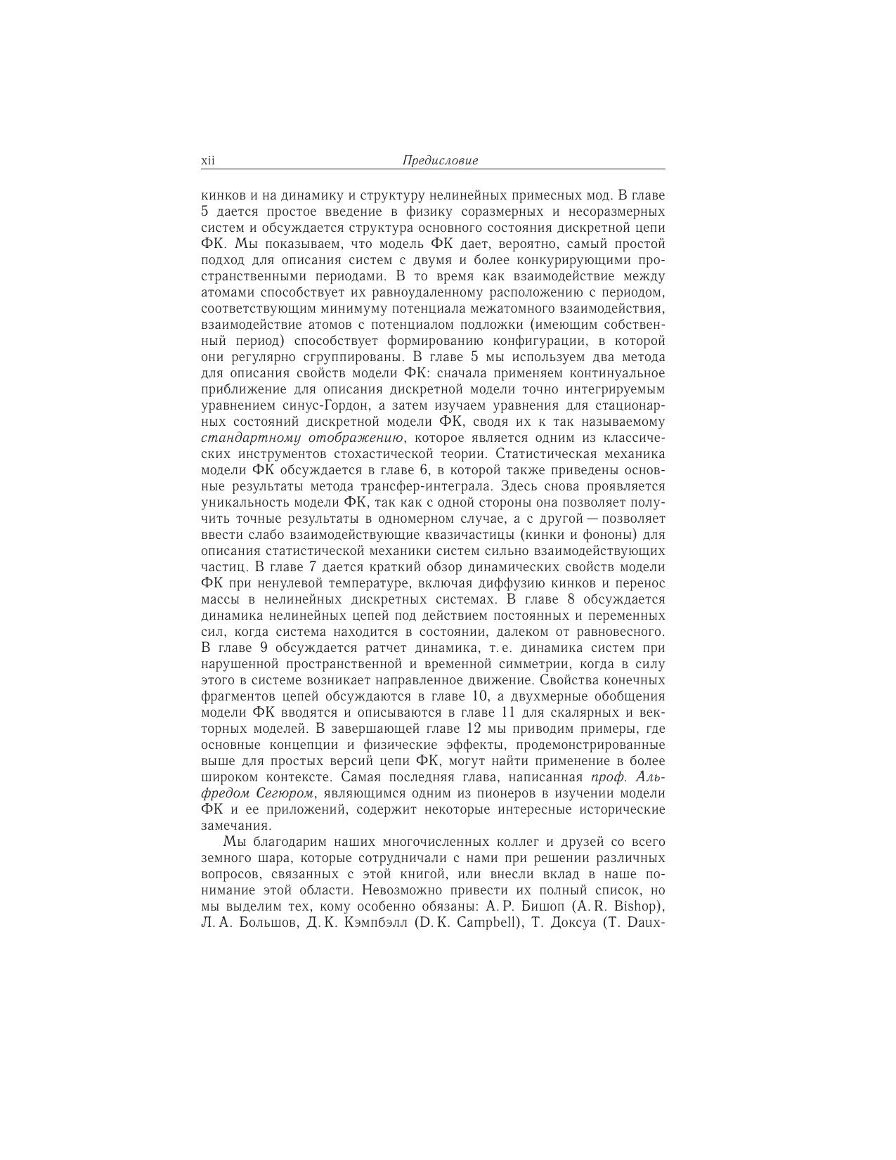 В книге известных специалистов по нелинейной динамике и теории солитонов О.М. Брауна и Ю.С. Кившаря систематически изложены, с наиболее общей точки зрения, концепции и методы низкоразмерной нелинейной физики, базирующиеся на модели ФК и ее обобщениях. Представлен панорамный взгляд на общие свойства и нелинейную динамику моделей твердого тела, включая фундаментальные физические понятия. Приведено детальное обсуждение приложений модели ФК к физическим системам разного типа (дислокации и краудионы в твердых телах, доменные границы, джозефсоновские контакты, биологические молекулы и поверхности кристаллов). Введены и описаны многие важные понятия, такие, как нелинейная динамика дискретных систем, динамика солитонов и их взаимодействие, соизмеримые и несоизмеримые системы, статистическая механика нелинейных систем, ратчеты и неравновесная динамика взаимодействующих многочастичных систем. Рассмотрены также соответствующие нелинейные уравнения, исследованы свойства их решений и детально описаны методы их анализа. Книга дает возможность неспециалисту ознакомиться с основами современных междисциплинарных концепций и методов физики твердого тела и нелинейной динамики. Она найдет широкий круг читателей в среде аспирантов и научных сотрудников.
