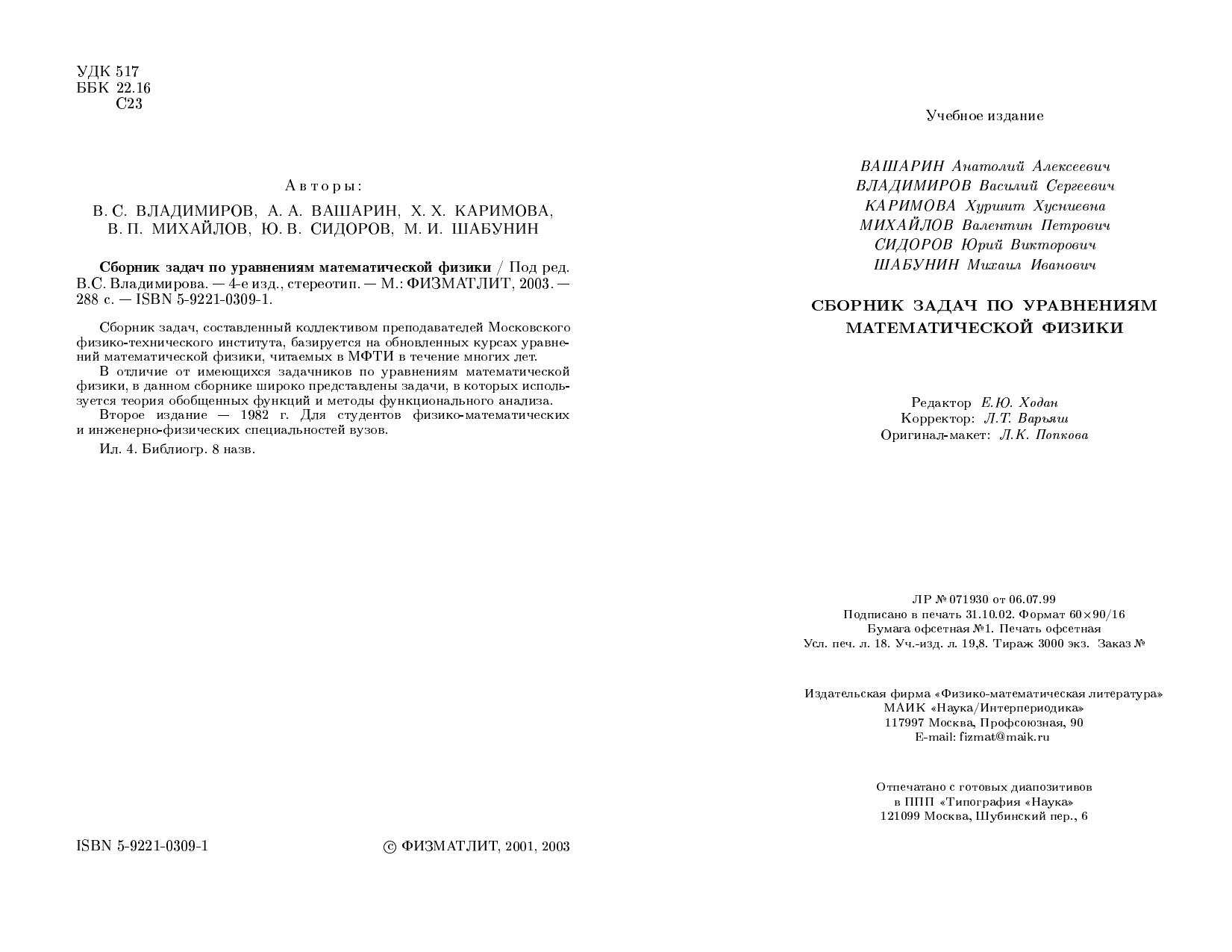 Сборник задач, составленный коллективом преподавателей Московского физико-технического института, базируется на обновленных курсах уравнений математической физики, читаемых в МФТИ в течение многих лет. В отличие от имеющихся задачников по уравнениям математической физики, в данном сборнике широко представлены задачи, в которых используется теория обобщенных функций и методы функционального анализа. В настоящее издание внесены уточнения и исправления. Третье издание - 2001 г. Для студентов физико-математических и инженерно-физических специальностей вузов.