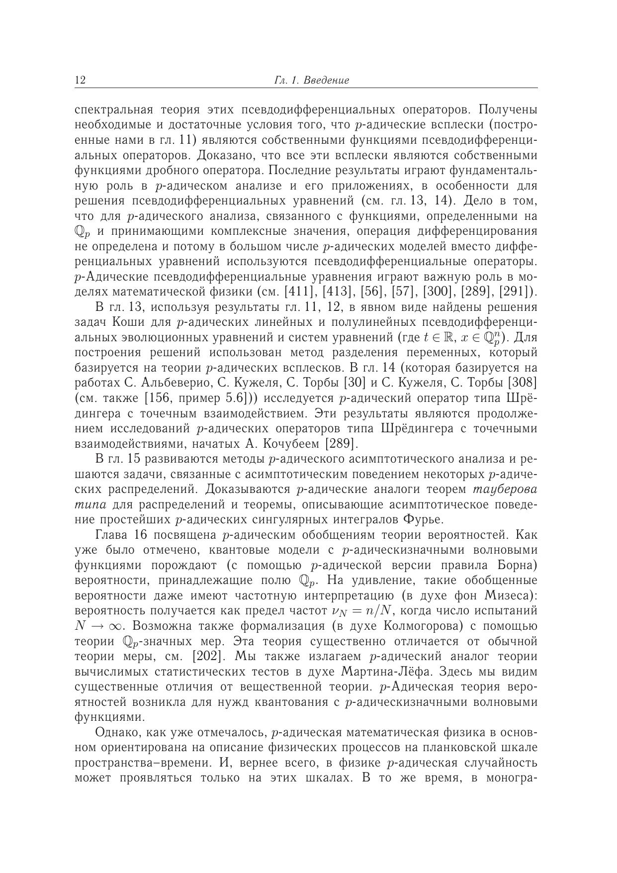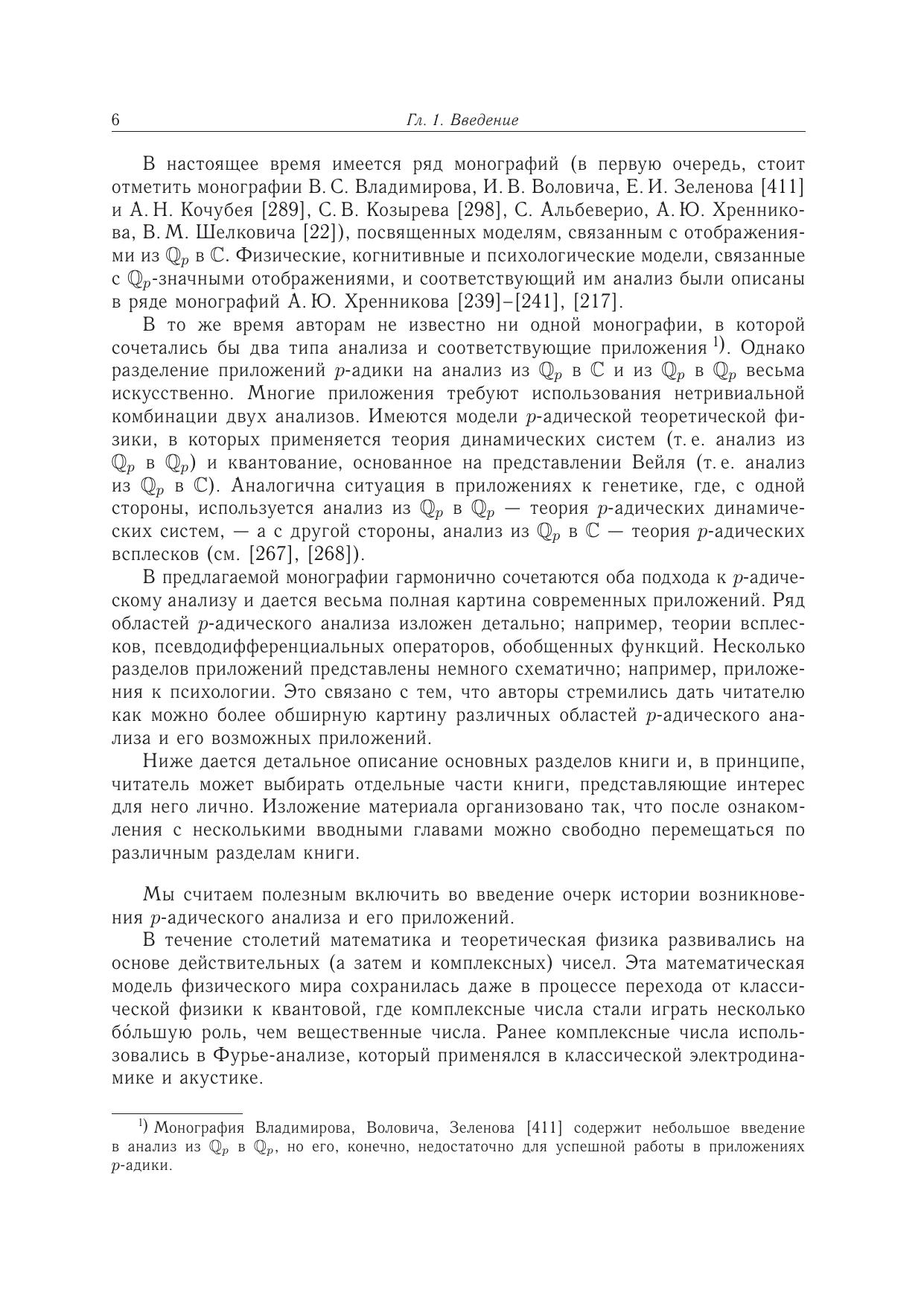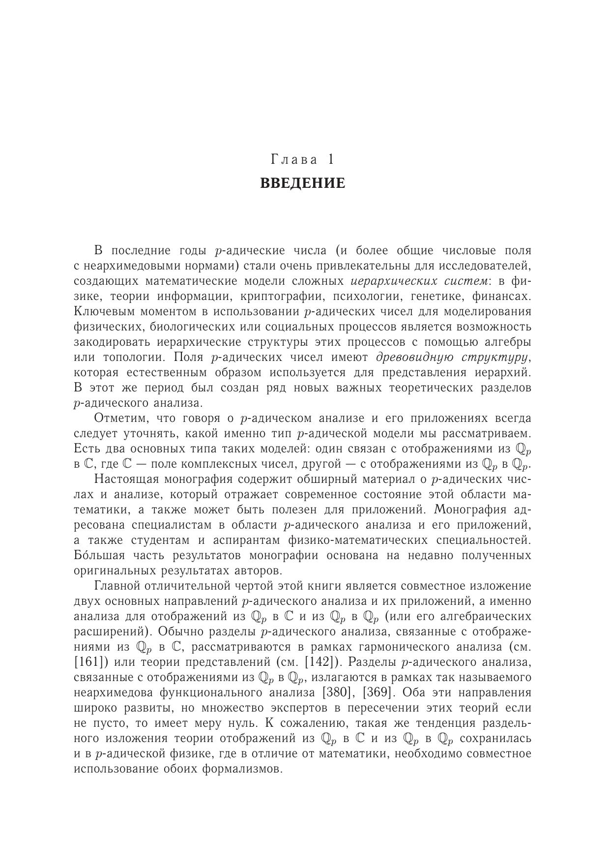 Монография содержит обширный материал о p-адическом анализе, который отражает современное состояние этой области математики и дает представление о приложениях. Отличительная черта книги — совместное изложение двух основных направлений p-адического анализа: анализа для отображений из поля p-адических чисел в поле комплексных чисел и из поля p-адических чисел в это же самое поле (или его алгебраические расширения). Основные результаты монографии базируются на недавно полученных авторами оригинальных результатах. Большие разделы посвящены теории p-адических всплесков, псевдодифференциальных операторов и уравнений, p-адической квантовой механике и теории динамических систем. Монография адресована специалистам в области p-адического анализа и его приложений, а также студентам и аспирантам физико-математических специальностей. Изложение материала организовано так, что после ознакомления с несколькими вводными главами читатель, знакомый с основами стандартных университетских курсов функционального анализа и алгебры, может свободно перемещаться по различным разделам книги.