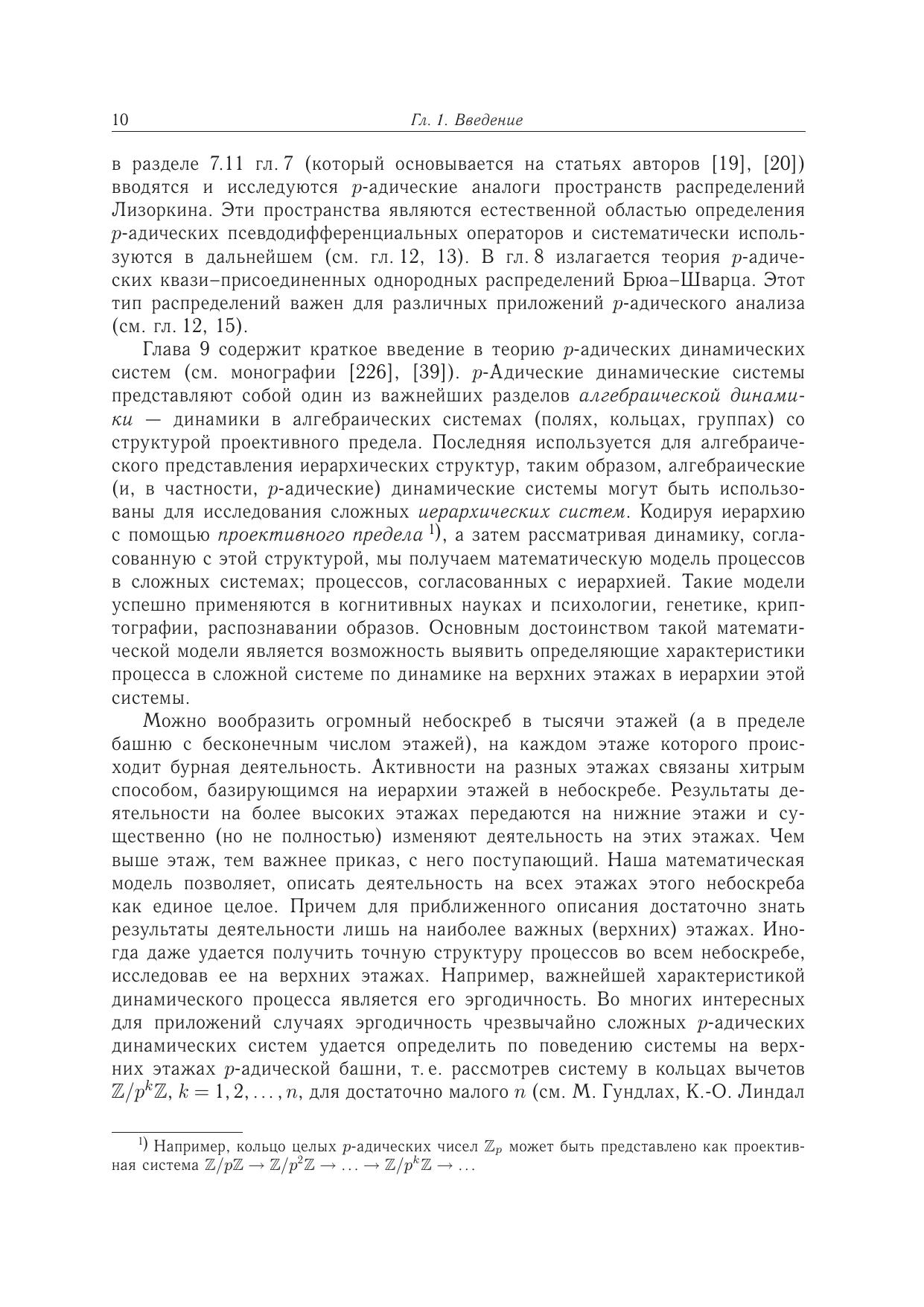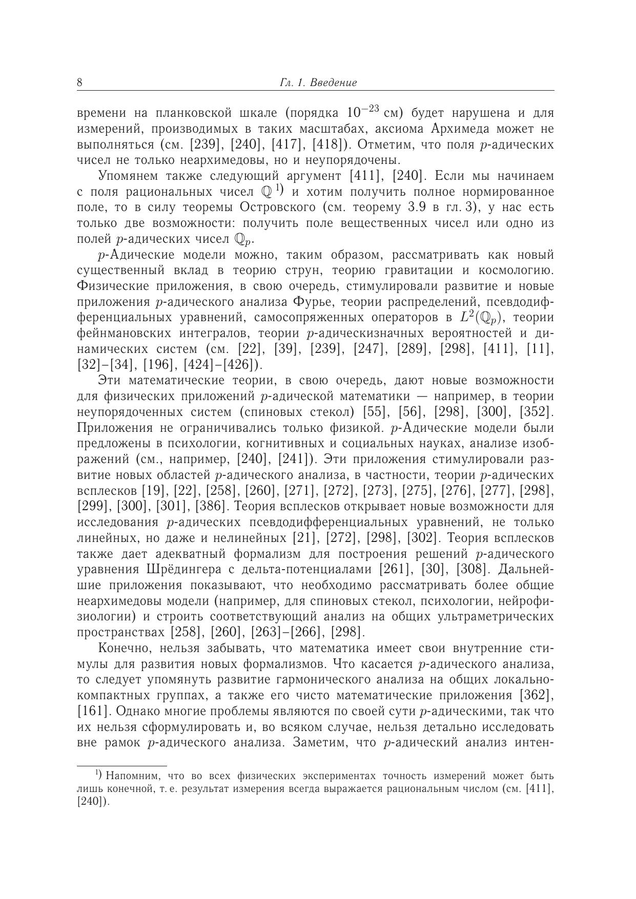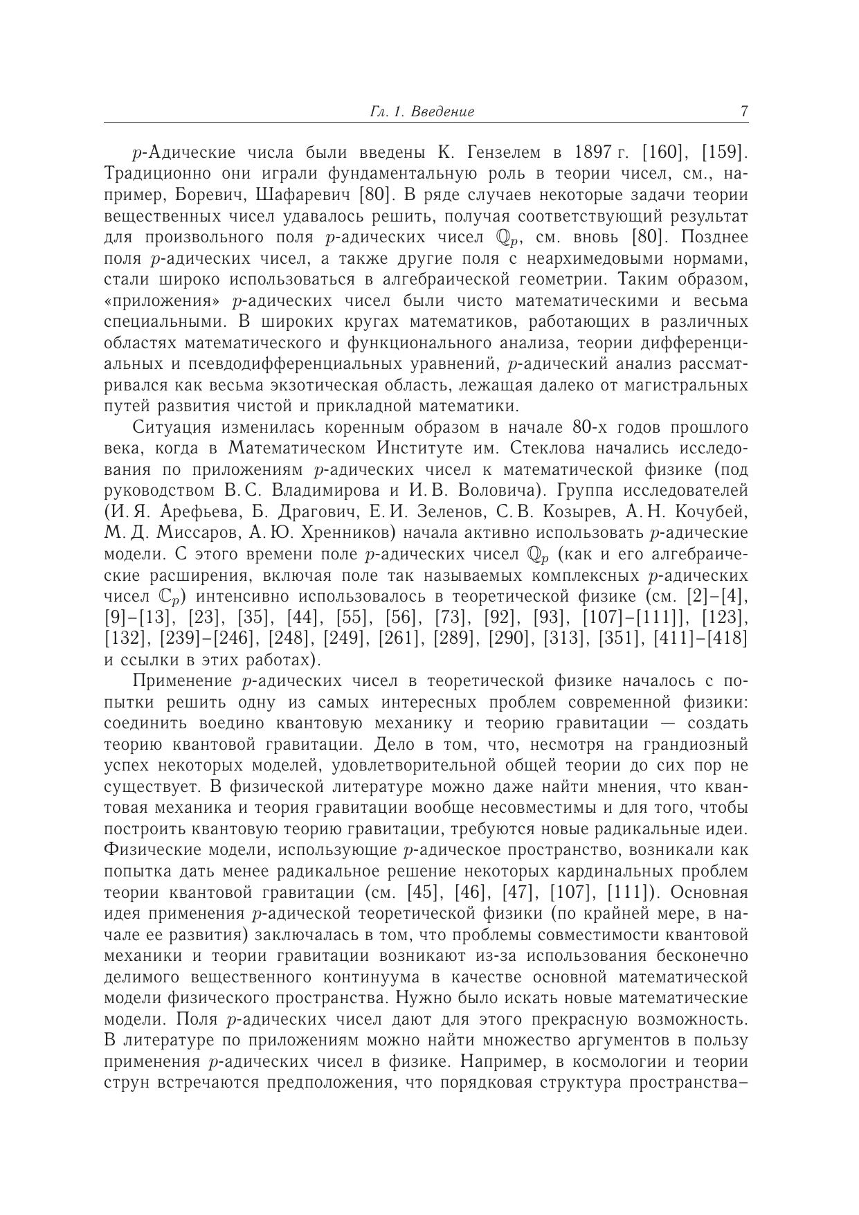 Монография содержит обширный материал о p-адическом анализе, который отражает современное состояние этой области математики и дает представление о приложениях. Отличительная черта книги — совместное изложение двух основных направлений p-адического анализа: анализа для отображений из поля p-адических чисел в поле комплексных чисел и из поля p-адических чисел в это же самое поле (или его алгебраические расширения). Основные результаты монографии базируются на недавно полученных авторами оригинальных результатах. Большие разделы посвящены теории p-адических всплесков, псевдодифференциальных операторов и уравнений, p-адической квантовой механике и теории динамических систем. Монография адресована специалистам в области p-адического анализа и его приложений, а также студентам и аспирантам физико-математических специальностей. Изложение материала организовано так, что после ознакомления с несколькими вводными главами читатель, знакомый с основами стандартных университетских курсов функционального анализа и алгебры, может свободно перемещаться по различным разделам книги.
