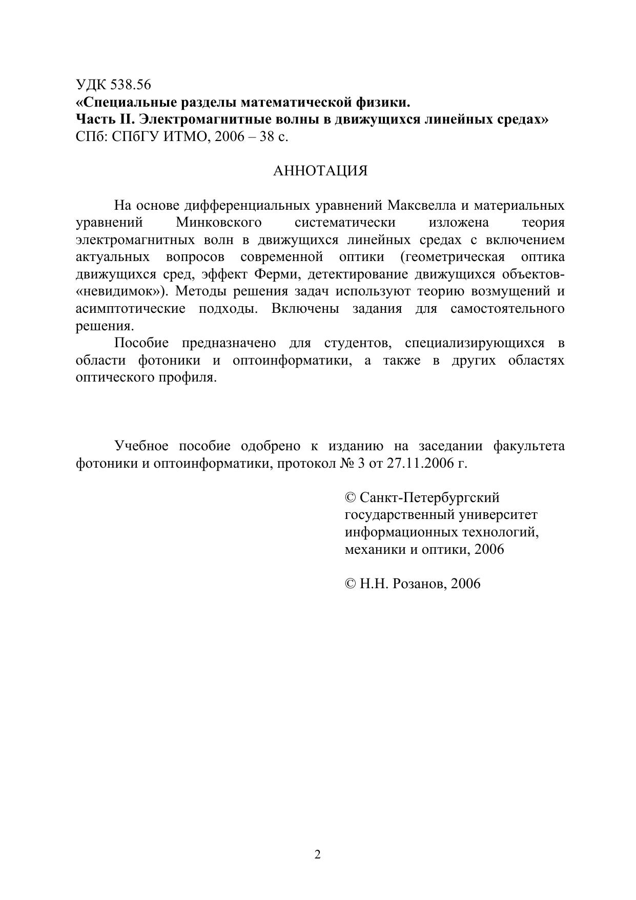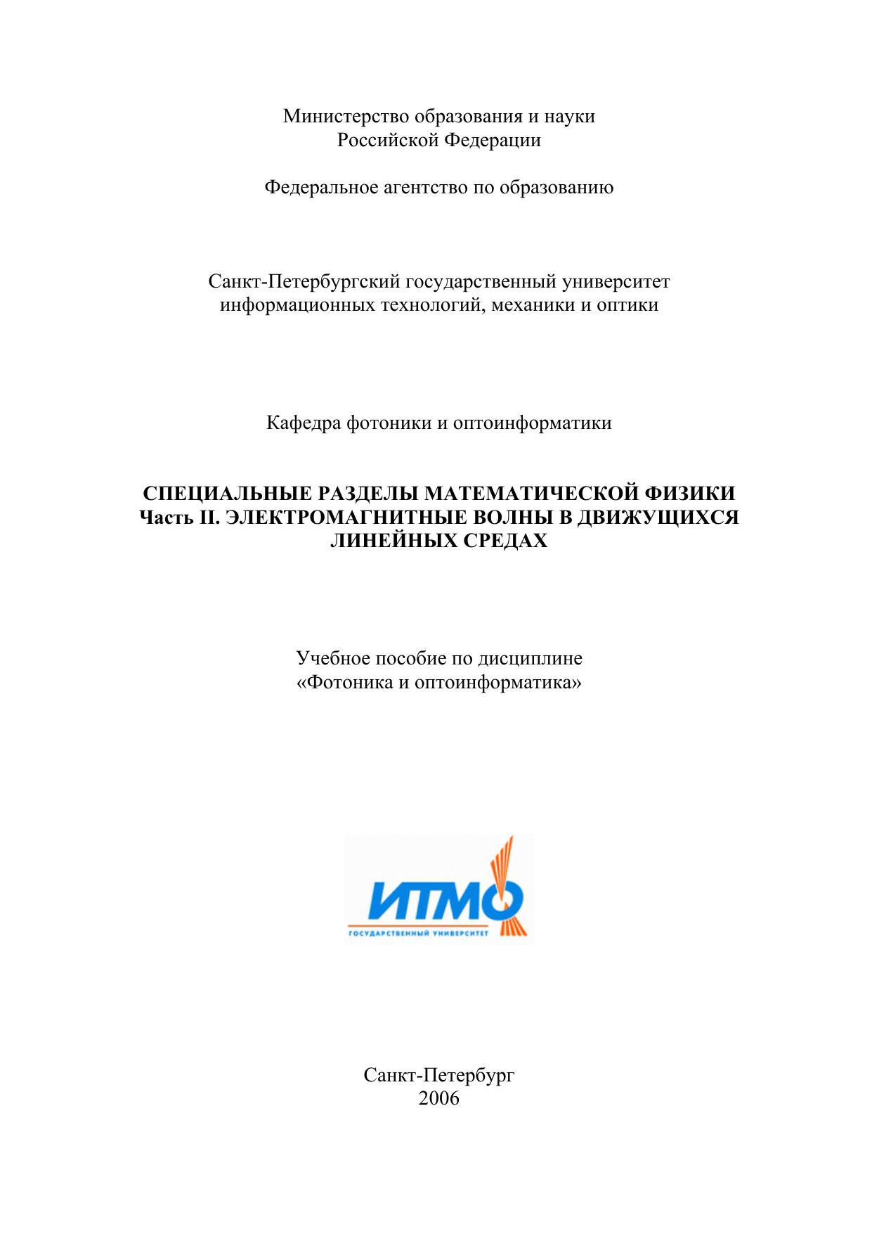 На основе дифференциальных уравнений Максвелла и материальных уравнений Минковского систематически изложена теория электромагнитных волн в движущихся линейных средах с включением актуальных вопросов современной оптики (геометрическая оптика движущихся сред, эффект Ферми, детектирование движущихся объектов-«невидимок»). Методы решения задач используют теорию возмущений и асимптотические подходы. Включены задания для самостоятельного решения. Пособие предназначено для студентов, специализирующихся в области фотоники и оптоинформатики, а также в других областях оптического профиля.
