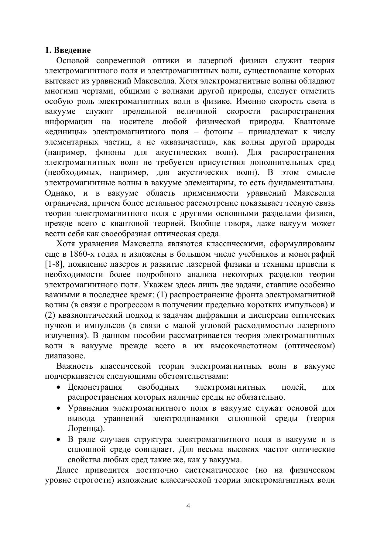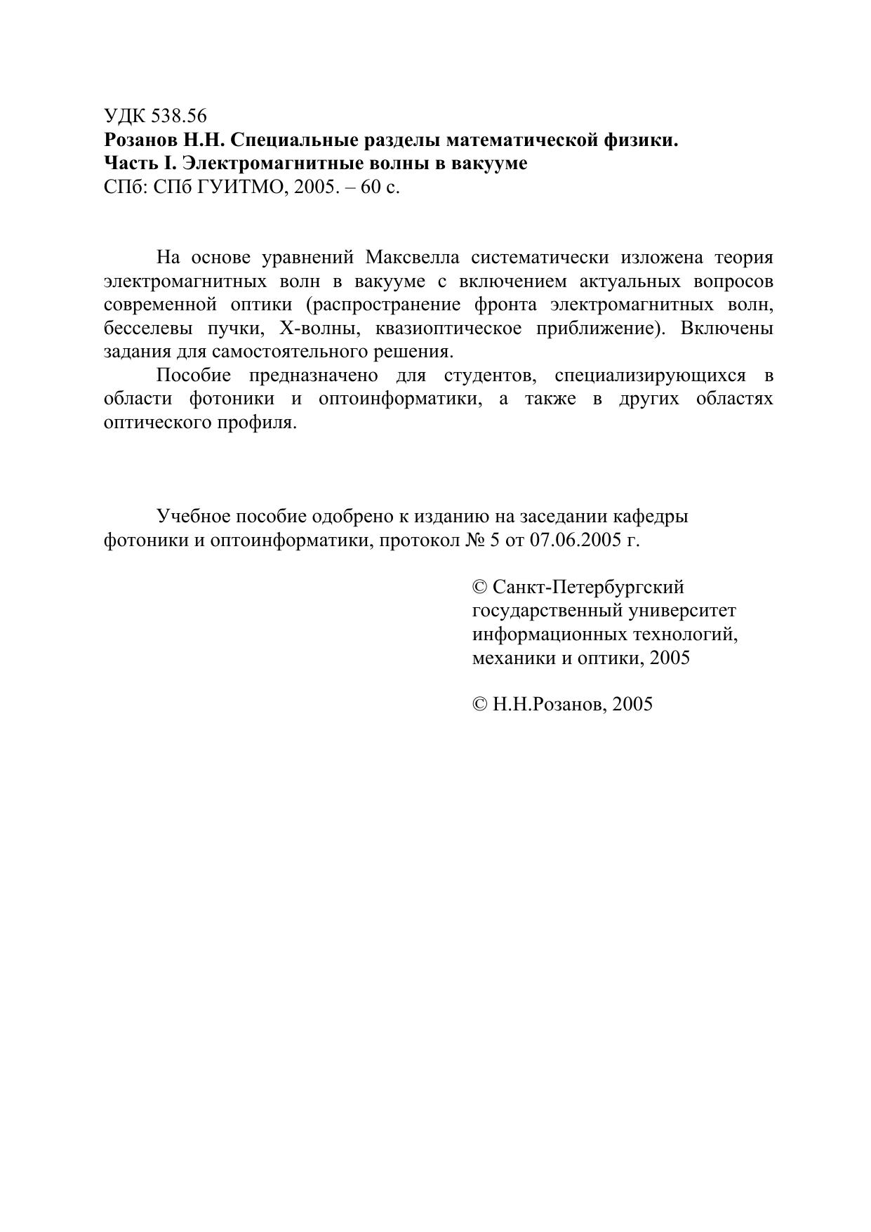 На основе уравнений Максвелла систематически изложена теория электромагнитных волн в вакууме с включением актуальных вопросов современной оптики (распространение фронта электромагнитных волн, бесселевы пучки, Х-волны, квазиоптическое приближение). Включены задания для самостоятельного решения. Пособие предназначено для студентов, специализирующихся в области фотоники и оптоинформатики, а также в других областях оптического профиля.