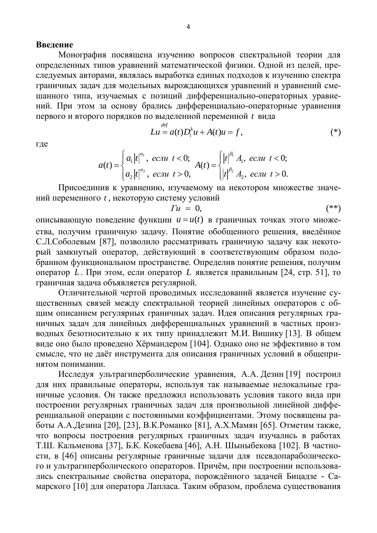 Монография посвящена изучению вопросов спектральной теории для определенных типов уравнений математической физики. Одной из целей, которые преследовали авторы, являлась выработка единых подходов к изучению спектра граничных задач для модельных вырождающихся уравнений и уравнений смешанного типа, изучаемых с позиций дифференциально-операторных уравнений. При этом за основу брались дифференциально-операторные уравнения первого и второго порядков по выделенной переменной t .