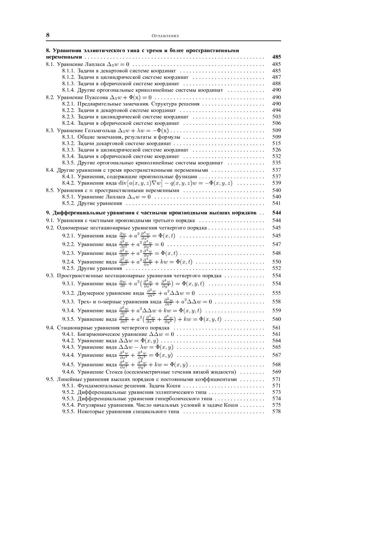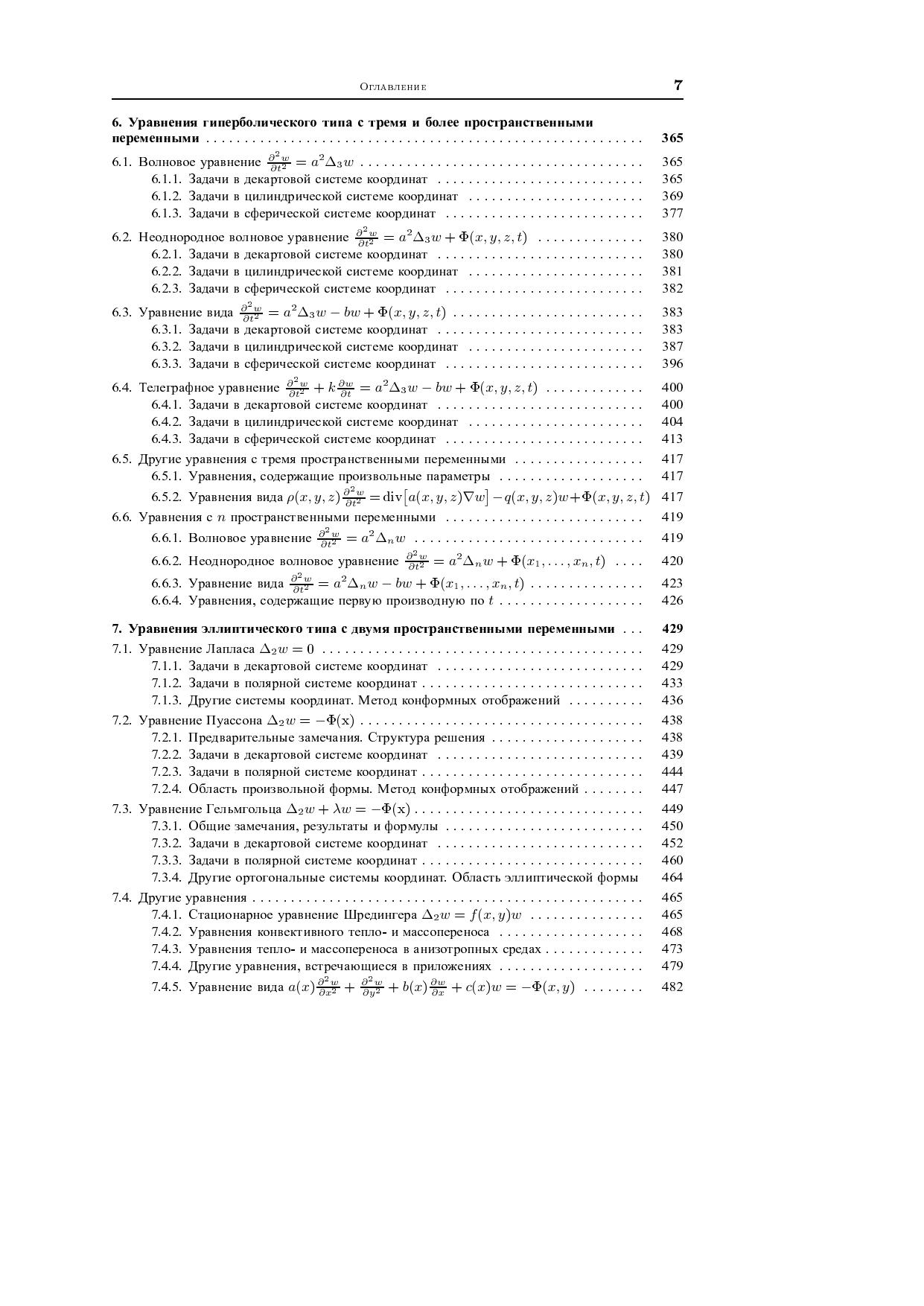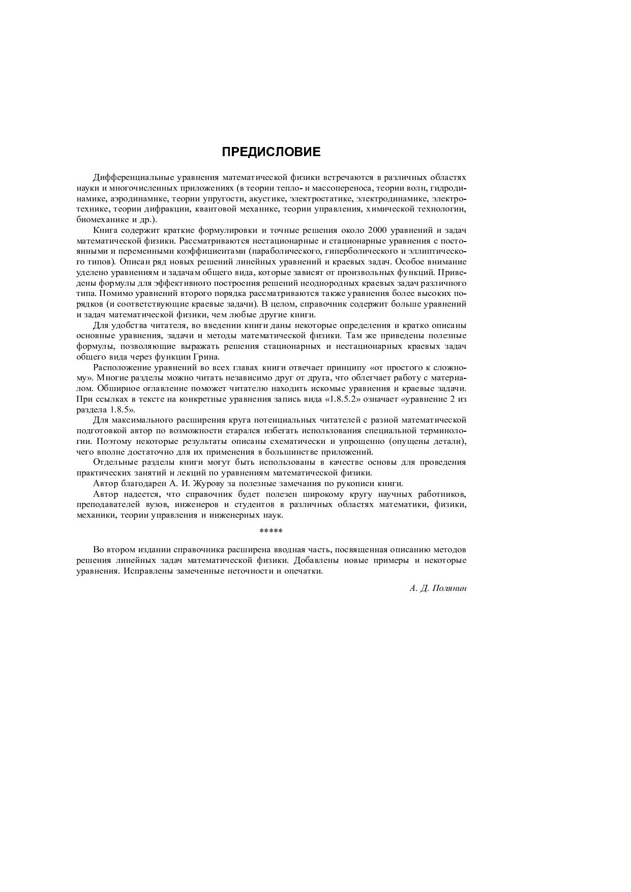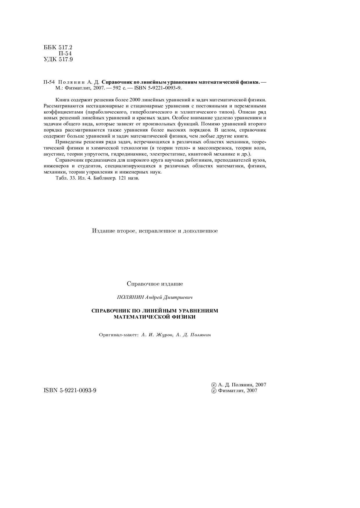 Справочник содержит решения более 2000 линейных уравнений и задач математической физики. Рассматриваются нестационарные и стационарные уравнения с постоянными и переменными коэффициентами (параболического, гиперболического и эллиптического типа). Особое внимание уделено уравнениям и задачам общего вида, которые зависят от произвольных функций. Помимо уравнений второго порядка рассматриваются также уравнения более высоких порядков. В целом справочник содержит больше уравнений и задач математической физики, чем любые другие книги. Приведены решения ряда задач, встречающихся в различных областях механики, теоретической физики и химической технологии (в теории тепло- и массопереноса, теории волн, акустике, теории упругости, гидродинамике, электростатике, квантовой механике и др.). Справочник предназначен для широкого круга научных работников, преподавателей вузов, инженеров и студентов, специализирующихся в различных областях математики, физики, механики, теории управления и инженерных наук.