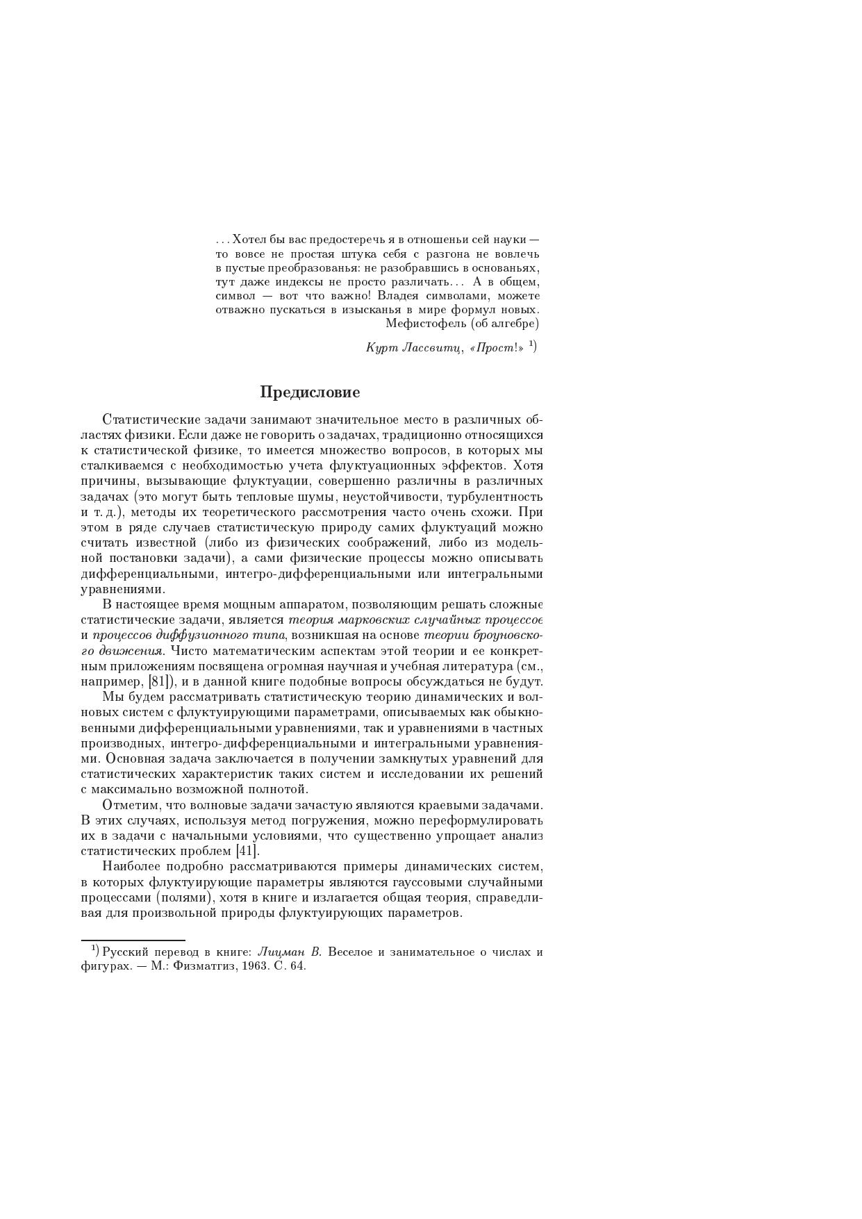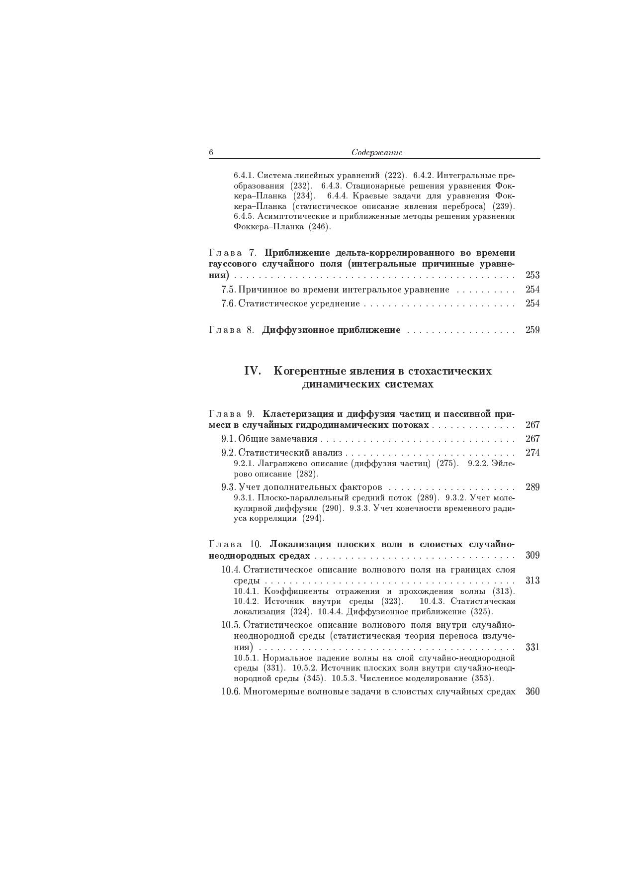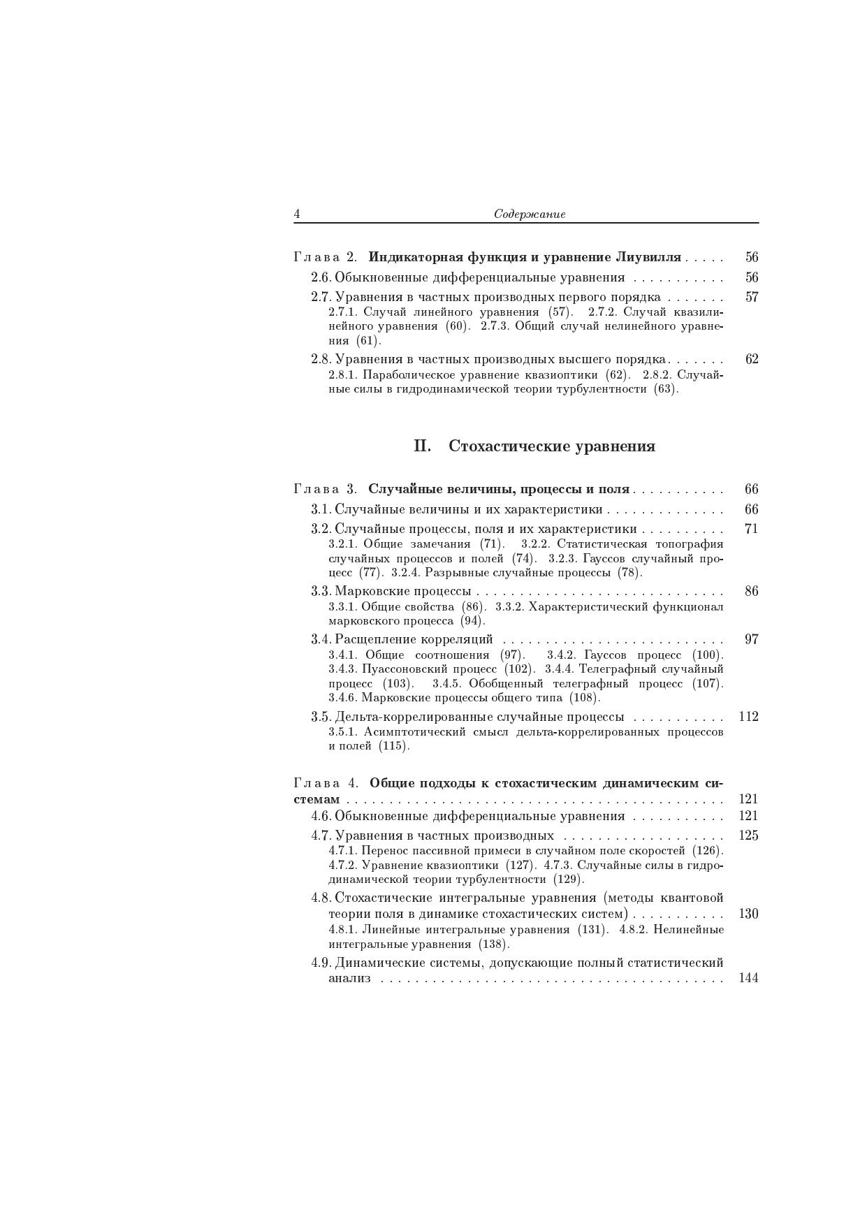 На основе функционального подхода излагается теория стохастических уравнений (обыкновенные дифференциальные уравнения, уравнения в частных производных, краевые задачи и интегральные уравнения). Развитый подход позволяет получить точное решение стохастических задач для ряда моделей флуктуирующих параметров (телеграфный, обобщенный телеграфный процессы, марковские процессы с конечным числом состояний, гауссовский марковский процесс и функции от этих процессов). Рассматриваются также и асимптотические методы анализа стохастических динамических систем, такие как приближение дельтакоррелированного случайного процесса (поля), диффузионное приближение и описание на основе этих методов когерентных явлений в стохастических динамических системах (кластеризации частиц и пассивной примеси в случайном поле скоростей, динамической локализации плоских волн в слоистых случайных средах, образование каустической структуры волнового поля в многомерных случайных средах). Книга предназначена для научных работников, специализирующихся в области гидродинамики, акустики, радиофизики, теоретической и математической физики, прикладной математике, имеющих дело со стохастическими динамическими системами, а также для студентов старших курсов и аспирантов