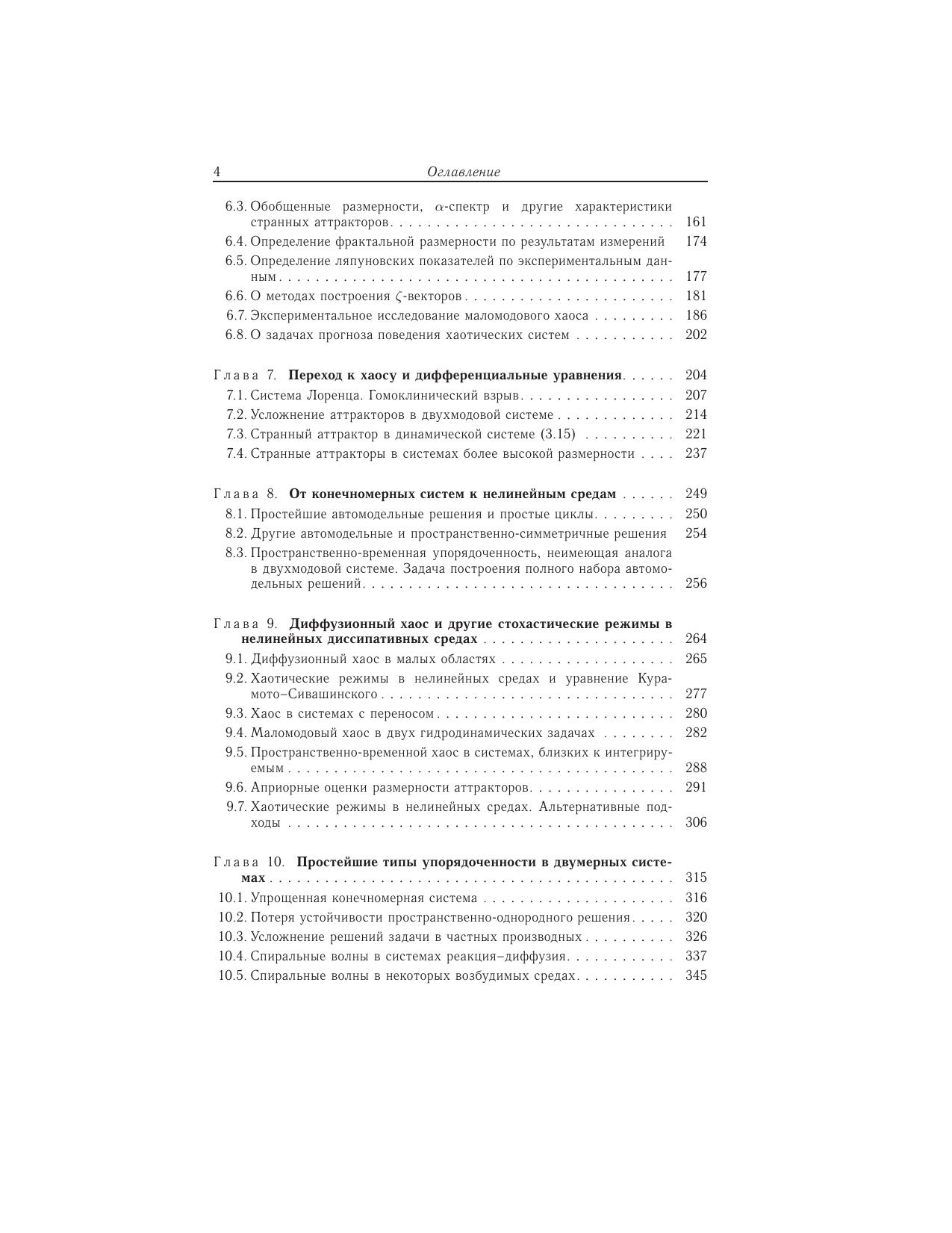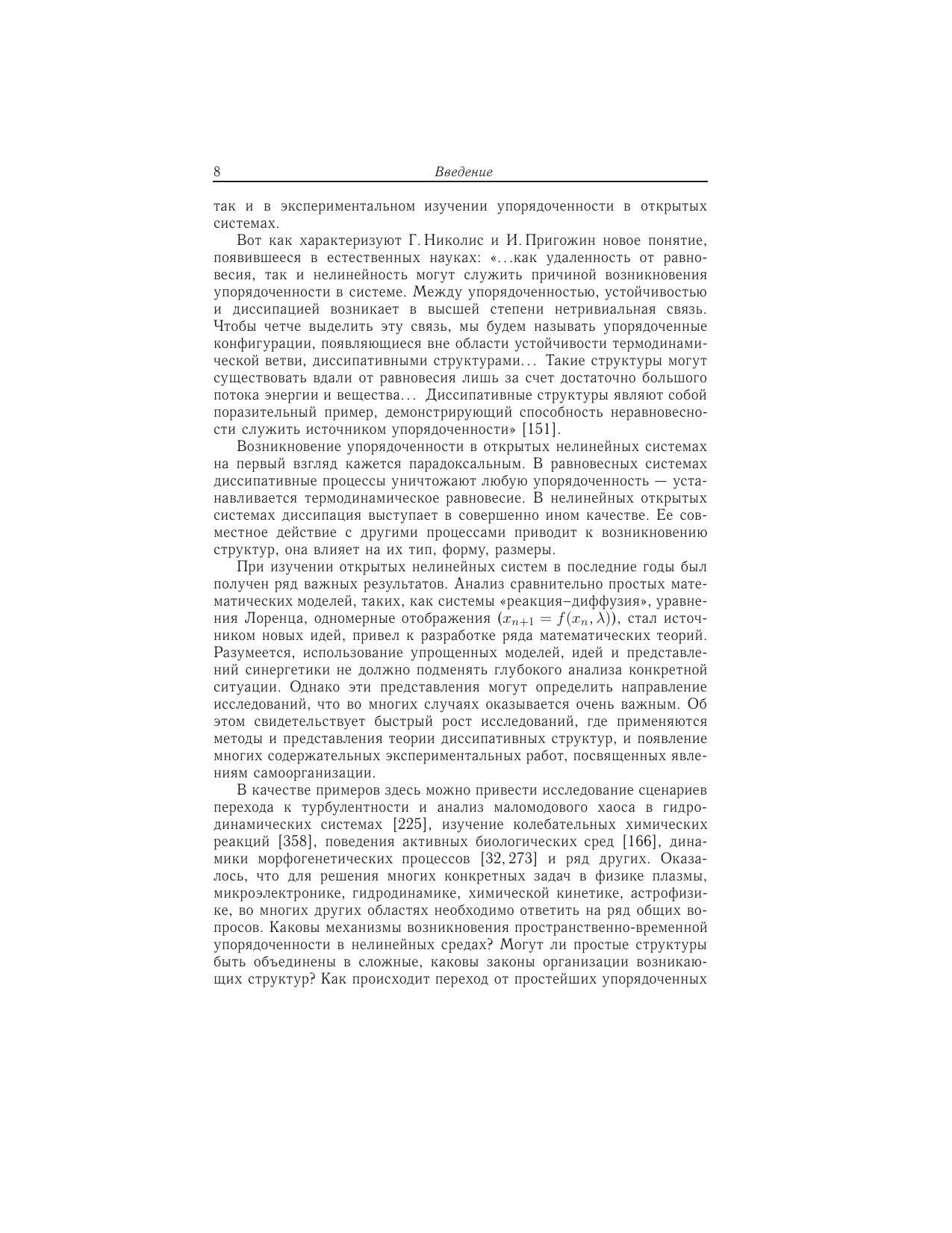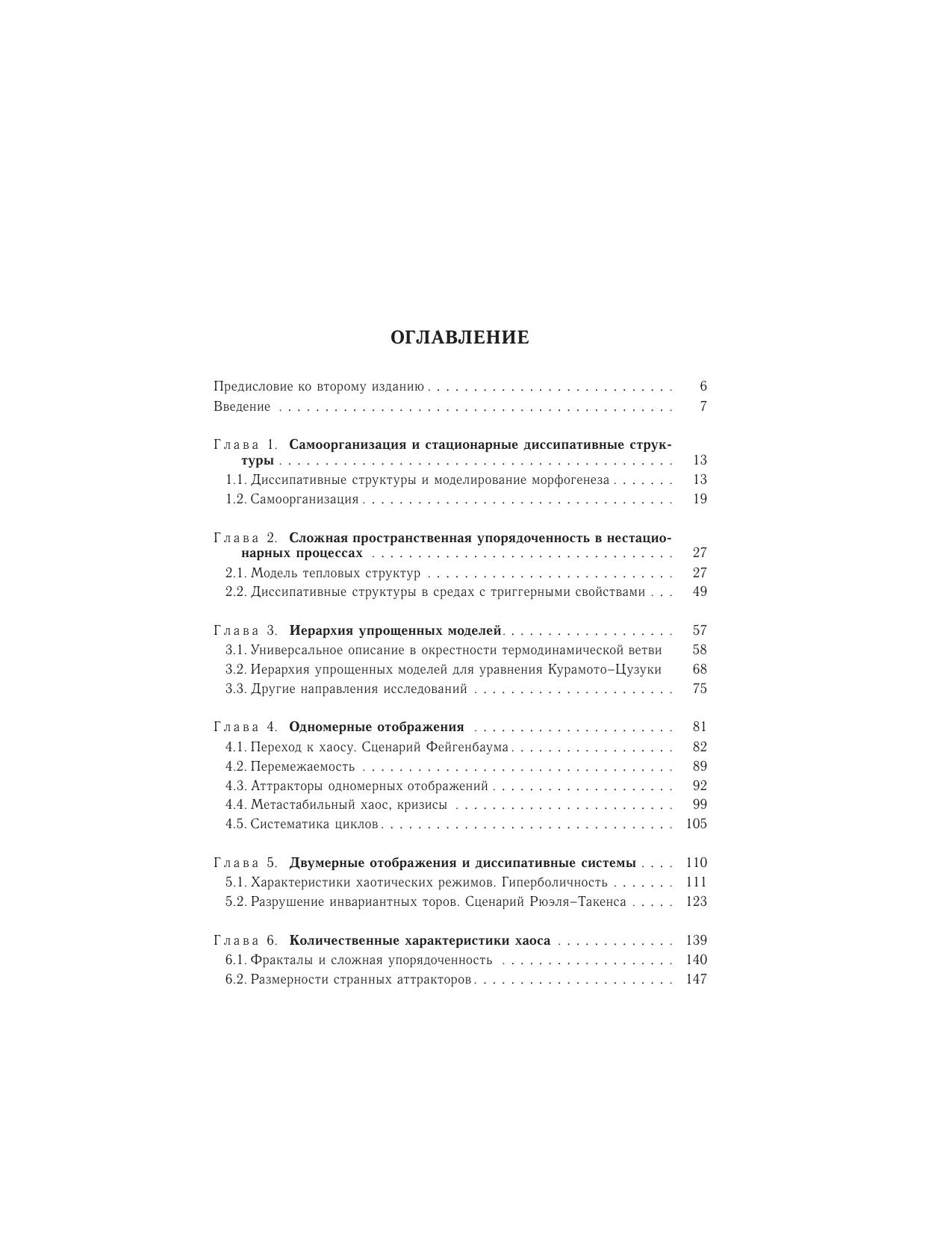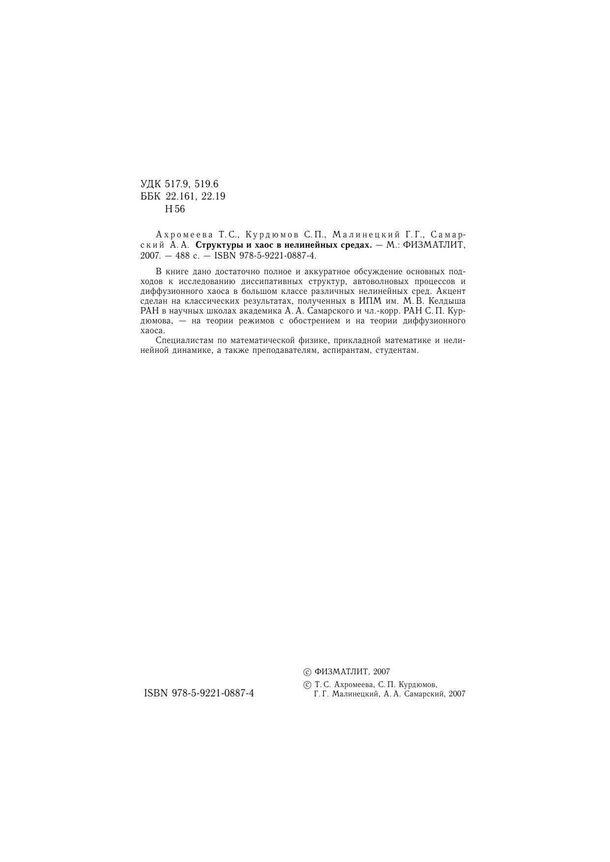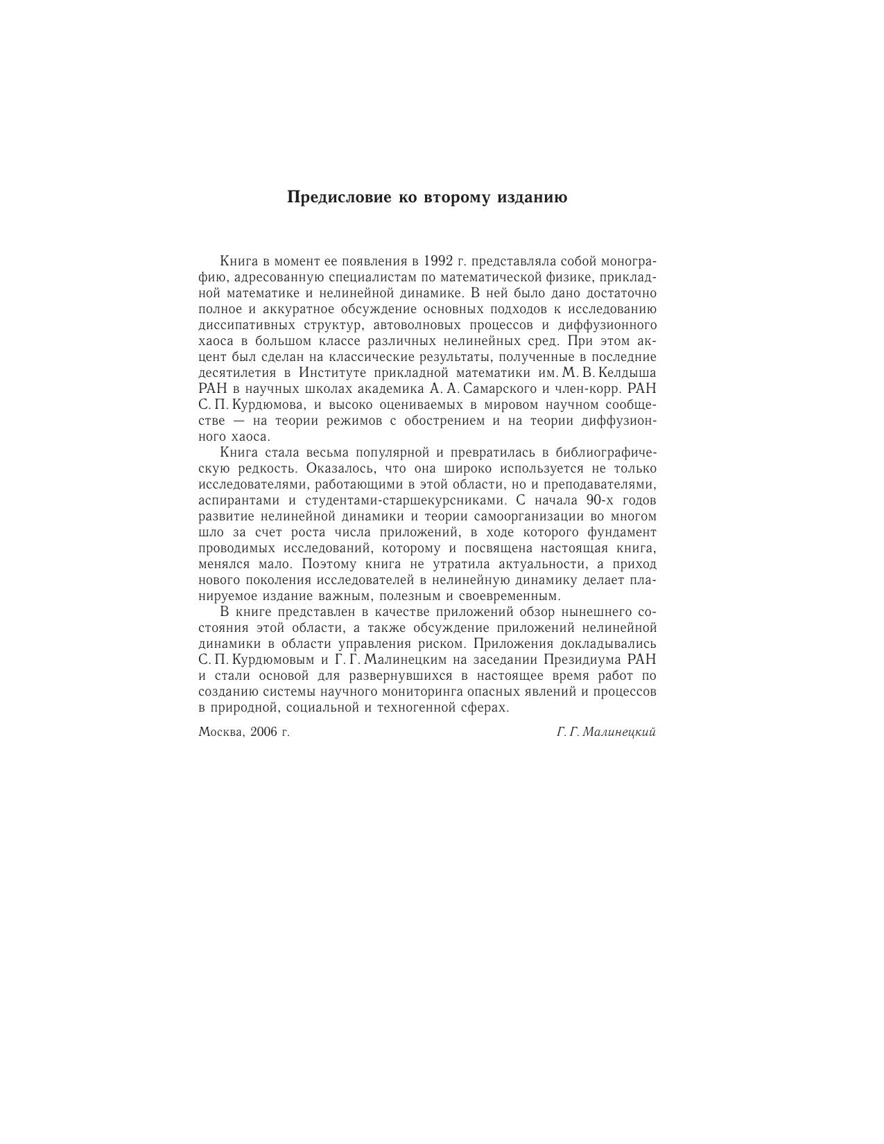 В книге дано достаточно полное и аккуратное обсуждение основных подходов к исследованию диссипативных структур, автоволновых процессов и диффузионного хаоса в большом классе различных нелинейных сред. Акцент сделан на классических результатах, полученных в ИПМ им. М.В. Келдыша РАН в научных школах академика А.А. Самарского и чл.-корр. РАН С.П. Курдюмова, - на теории режимов с обострением и на теории диффузионного хаоса. Специалистам по математической физике, прикладной математике и нелинейной динамике, а также преподавателям, аспирантам, студентам.