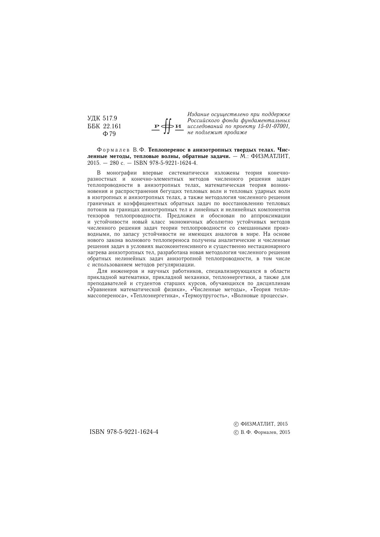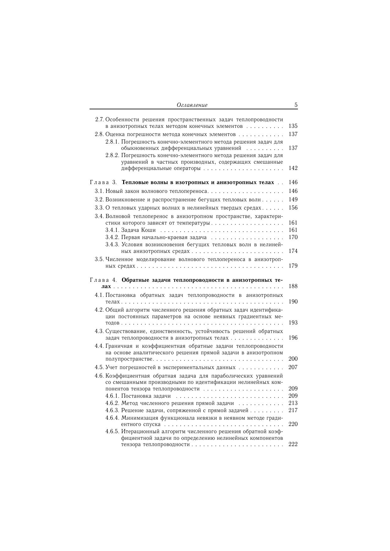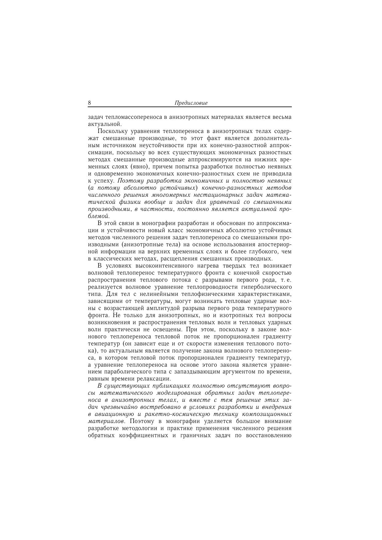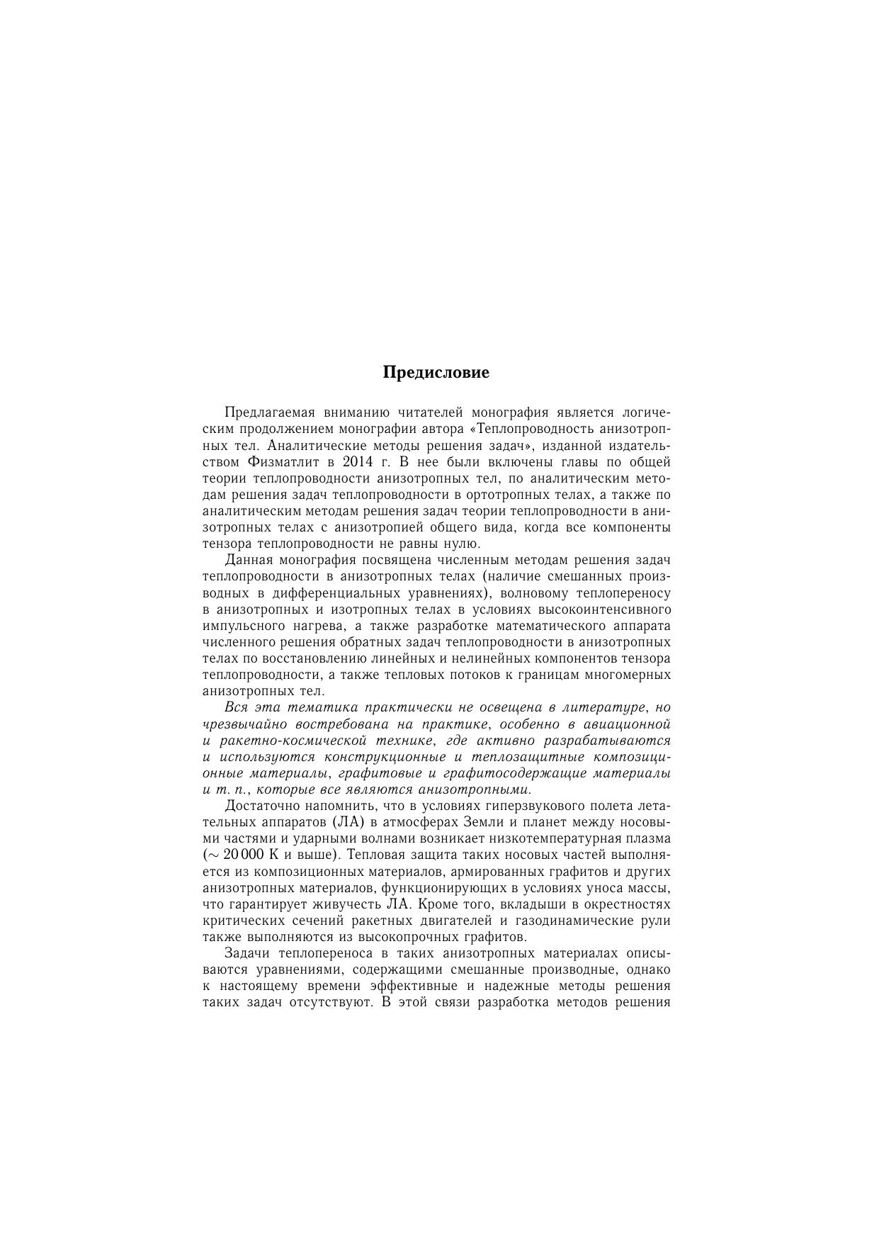 В монографии впервые систематически изложены теория конечно- разностных и конечно-элементных методов численного решения задач теплопроводности в анизотропных телах, математическая теория возникновения и распространения бегущих тепловых волн и тепловых ударных волн в изотропных и анизотропных телах, а также методология численного решения граничных и коэффициентных обратных задач по восстановлению тепловых потоков на границах анизотропных тел и линейных и нелинейных компонентов тензоров теплопроводности. Предложен и обоснован по аппроксимации и устойчивости новый класс экономичных абсолютно устойчивых методов численного решения задач теории теплопроводности со смешанными производными, по запасу устойчивости не имеющих аналогов в мире. На основе нового закона волнового теплопереноса получены аналитические и численные решения задач в условиях высокоинтенсивного и существенно нестационарного нагрева анизотропных тел, разработана новая методология численного решения обратных нелинейных задач анизотропной теплопроводности, в том числе с использованием методов регуляризации.