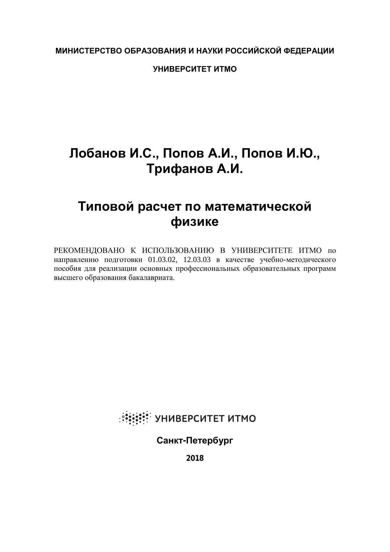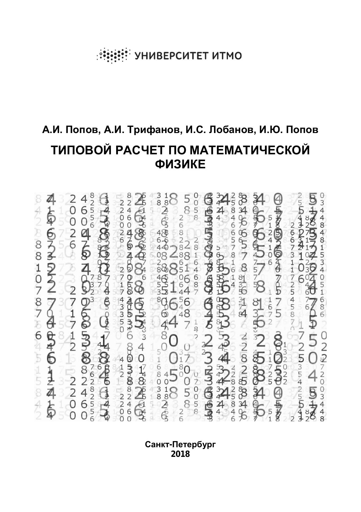 Учебно-методическое пособие содержит в себе типовой расчет по математической физике. Предназначено для студентов 3 – 4 курсов академического бакалавриата. Типовой расчет включает в себя задачи по следующим темам: “Уравнения гиперболического типа”, “Уравнения параболического типа”, “Уравнения эллиптического типа”, “Приведение уравнений к каноническому виду”, “Функция Грина дифференциального оператора”, “Функция Грина задачи Штурма-Лиувилля”, “Формула Грина” и “Функция Грина задачи Дирихле для уравнения Лапласа в области”.