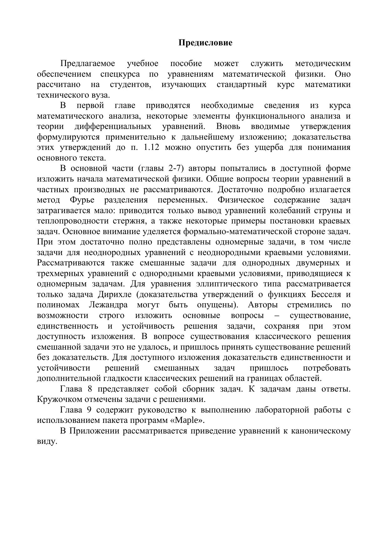 Предлагаемое учебное пособие, содержащее теорию и задачи, предназначено для студентов технических вузов и может служить методическим обеспечением спецкурса по уравнениям математической физики. Приведены подробные решения типовых задач, поэтому пособие может быть полезным при самостоятельном изучении курса.