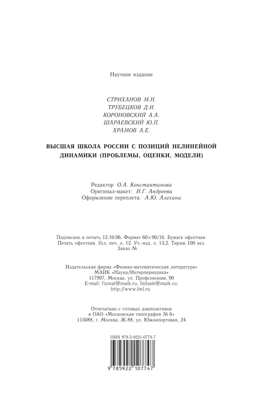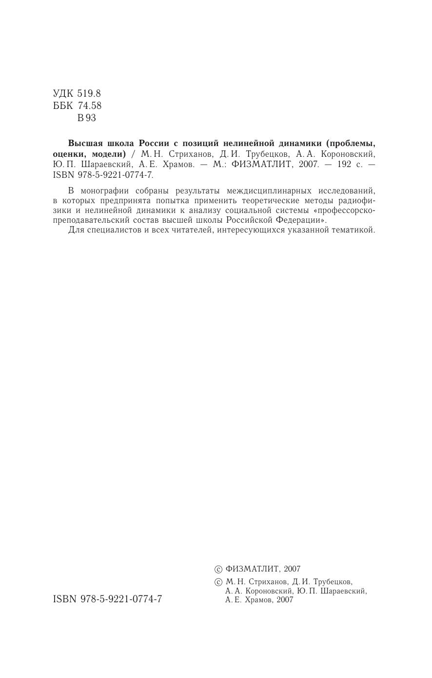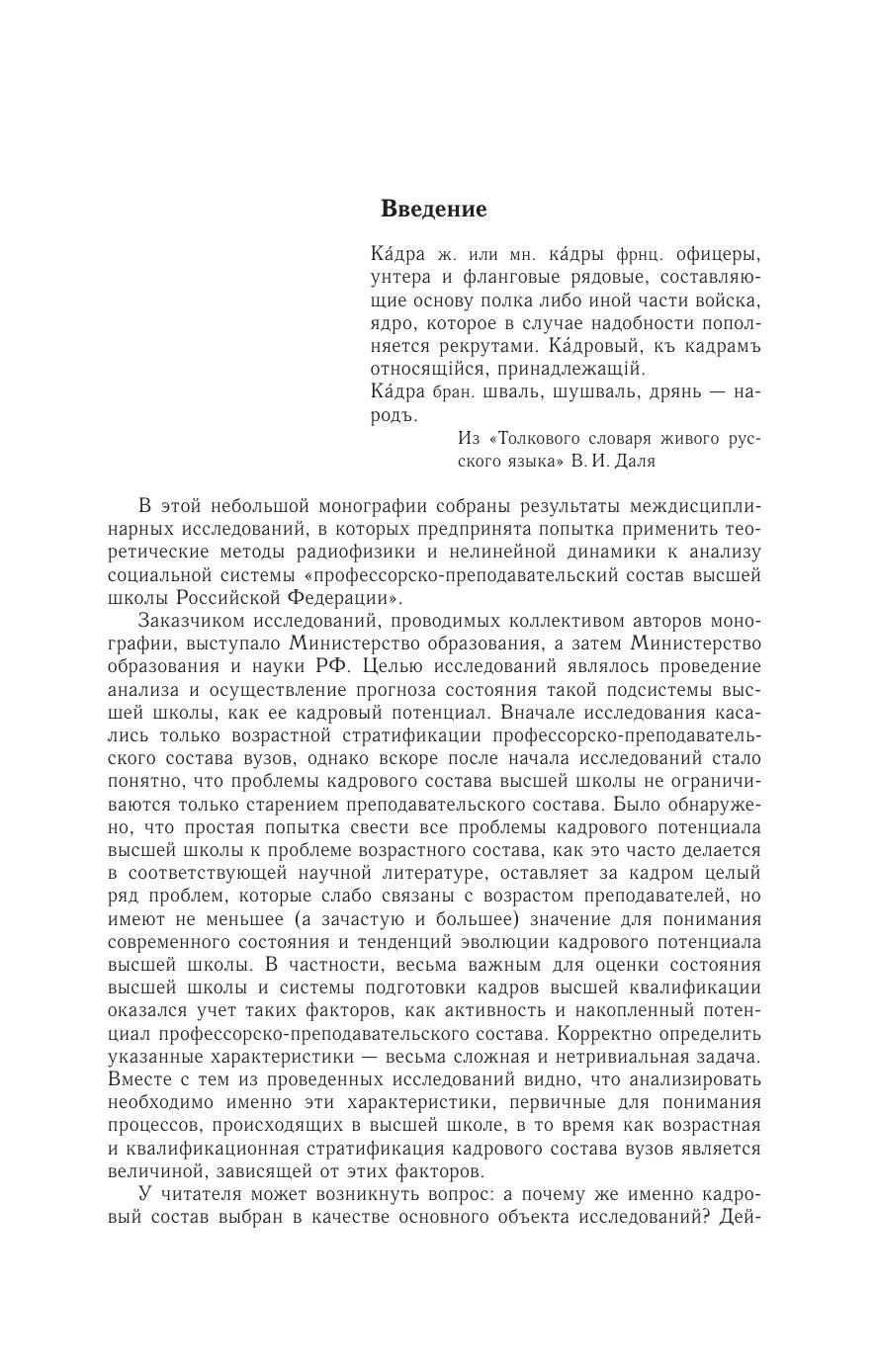 В монографии собраны результаты междисциплинарных исследований, в которых предпринята попытка применить теоретические методы радиофизики и нелинейной динамики к анализу социальной системы «профессорскопреподавательский состав высшей школы Российской Федерации». Для специалистов и всех читателей, интересующихся указанной тематикой.